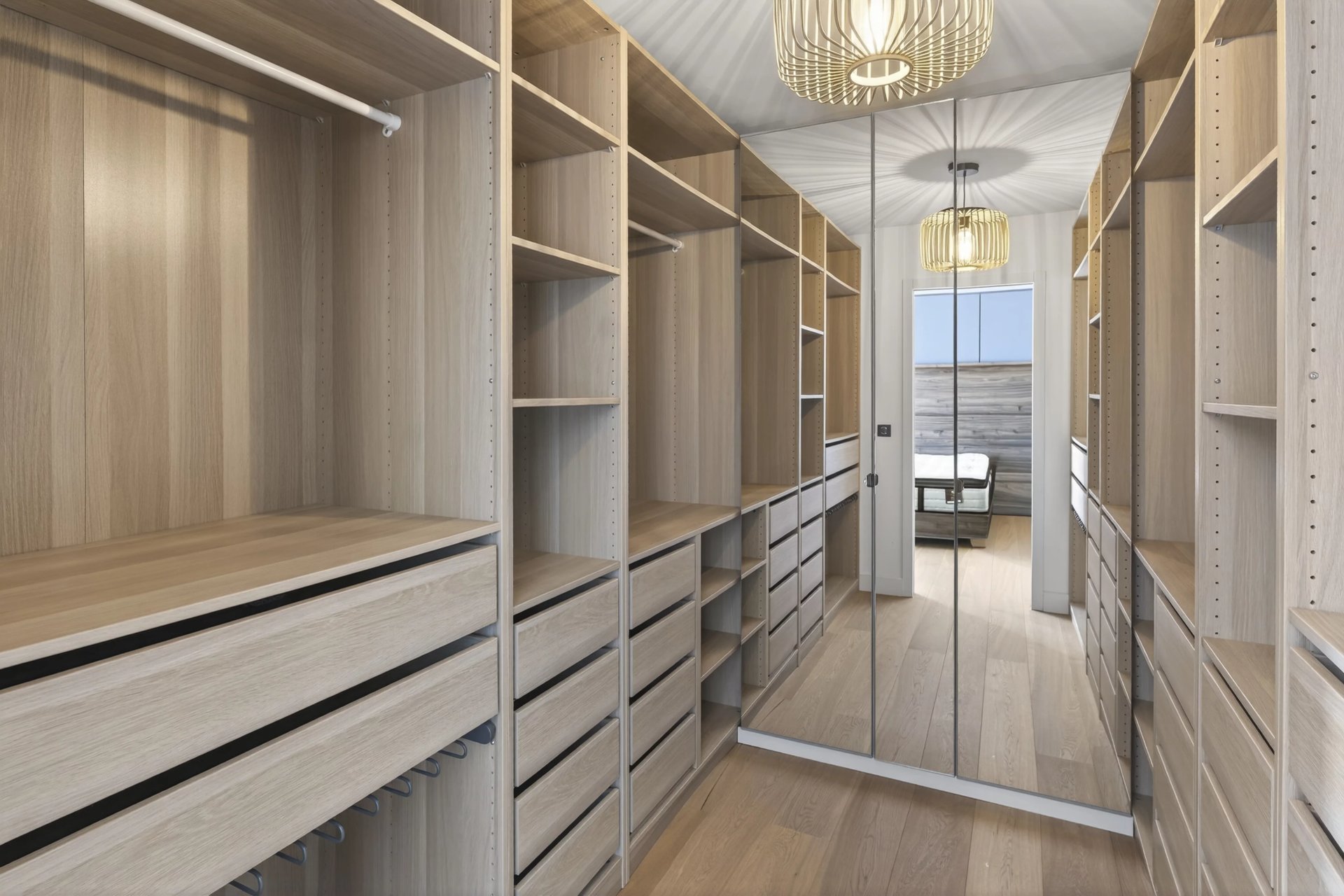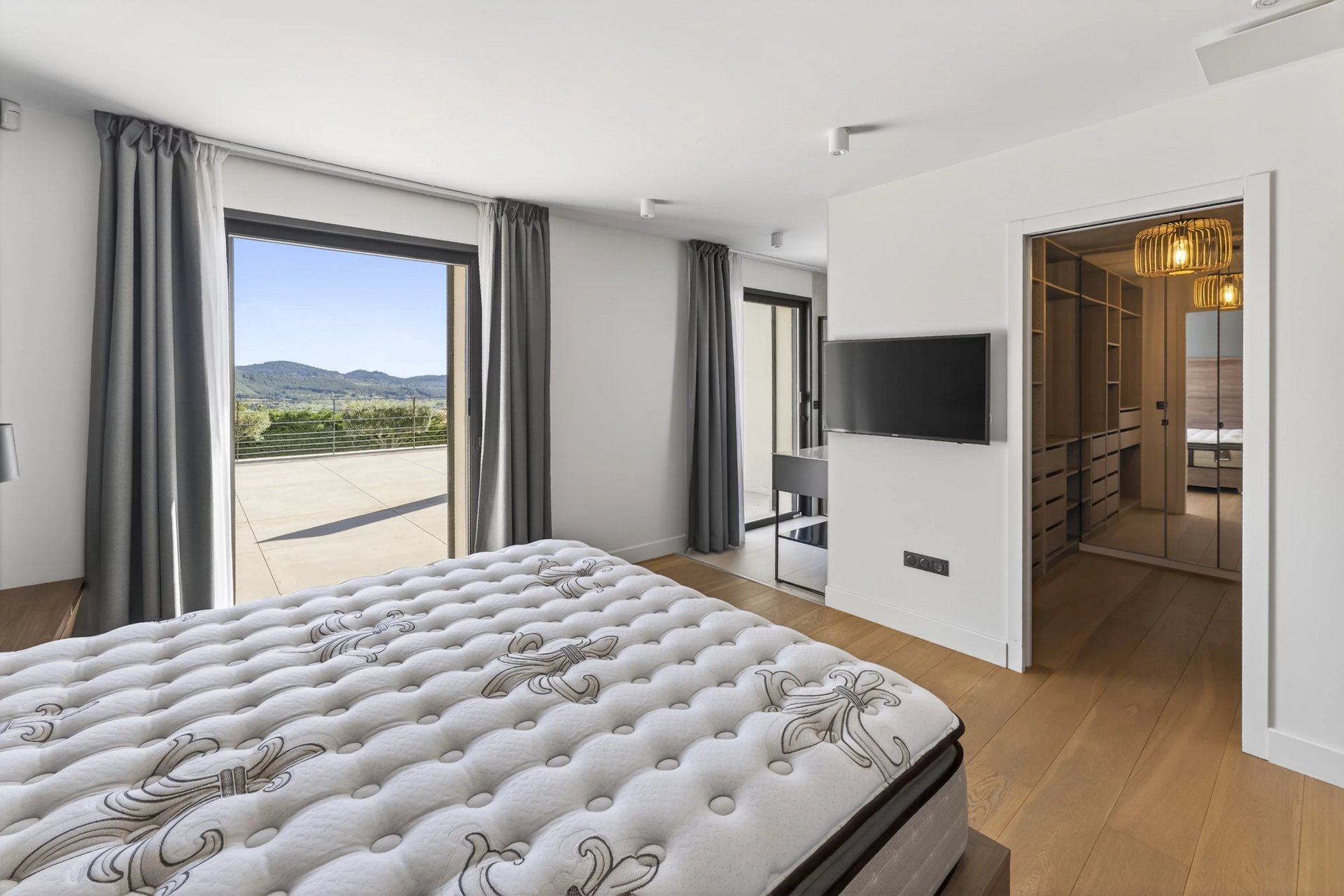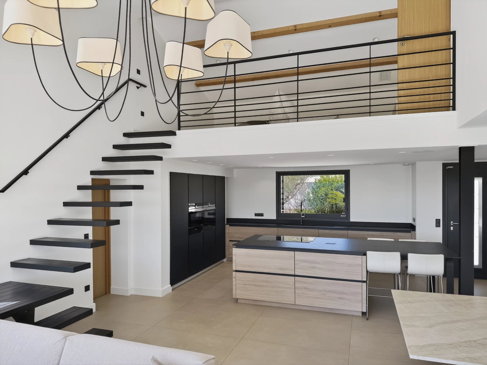The main level features a large living room combining a lounge, dining area, and open kitchen, extended by a utility/laundry room. The whole opens widely onto a terrace of over 200 m2 offering an exceptional panorama. On this same level, three en-suite bedrooms including an elegant master bedroom guarantee single-story living comfort. A mezzanine overlooking the living room houses an additional bedroom.