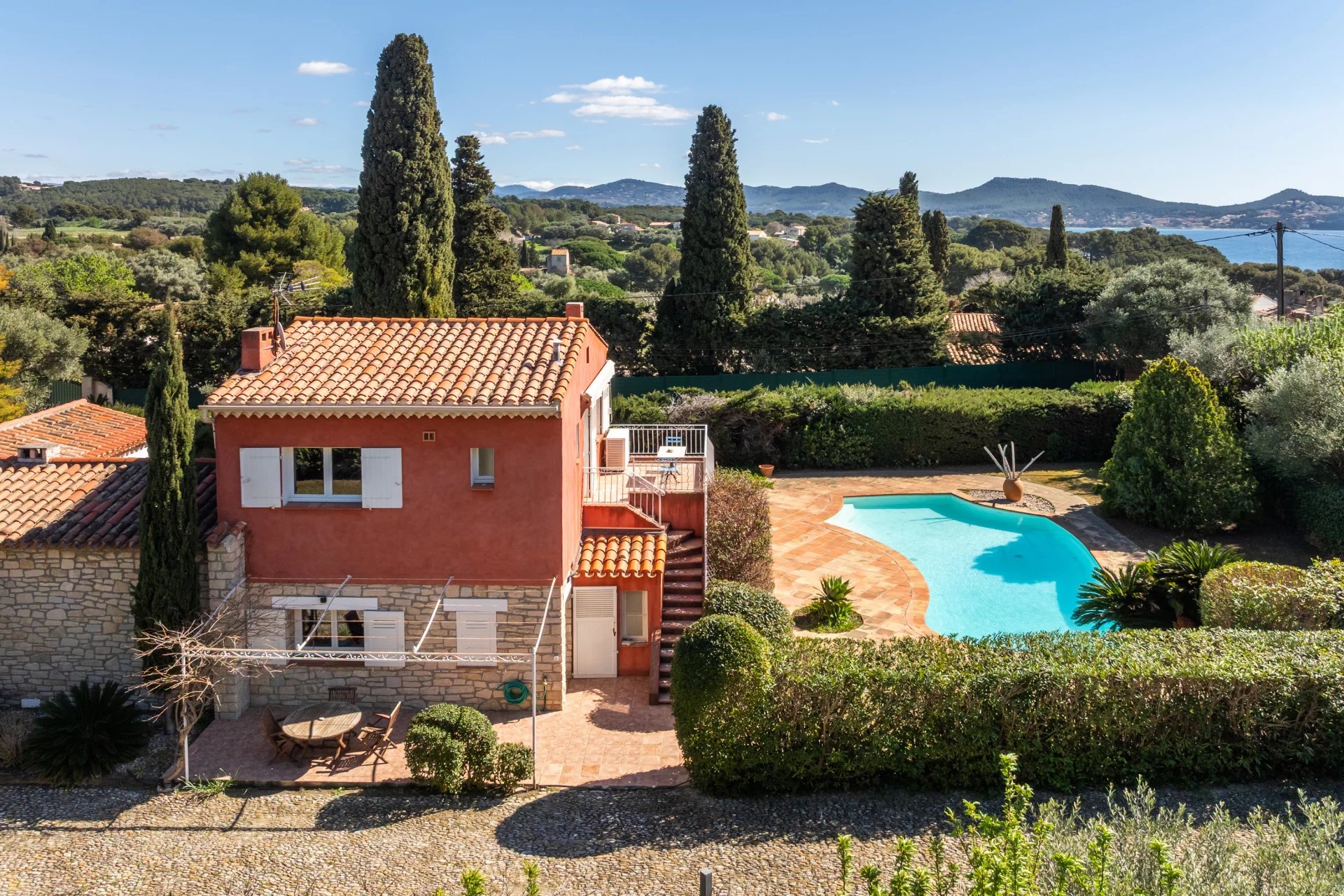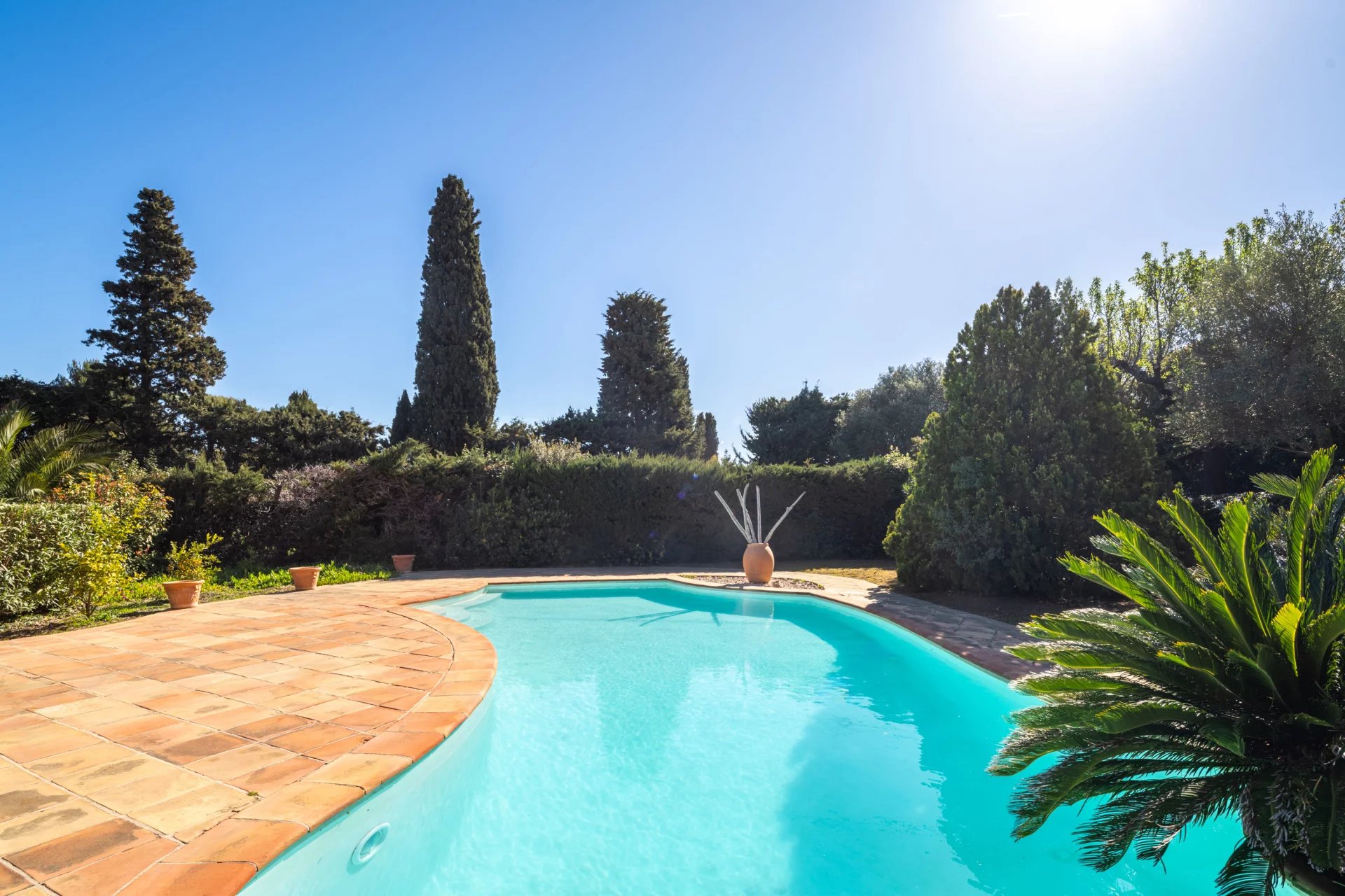 The villa is set within beautifully landscaped grounds of approximately 1,600 sqm, a serene Mediterranean garden designed for relaxation and discretion. A swimming pool, garage, and cellar complete the outdoor amenities.