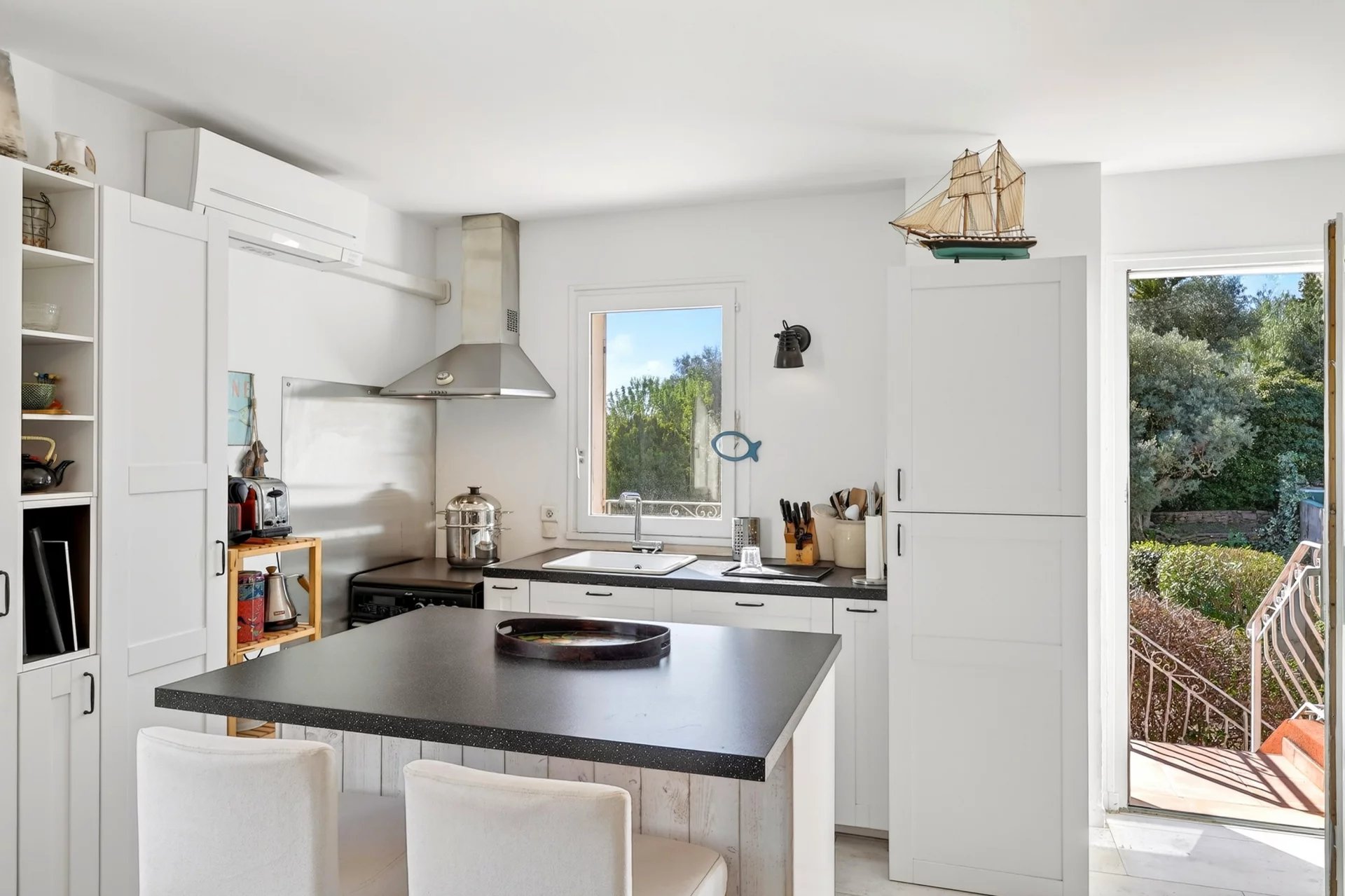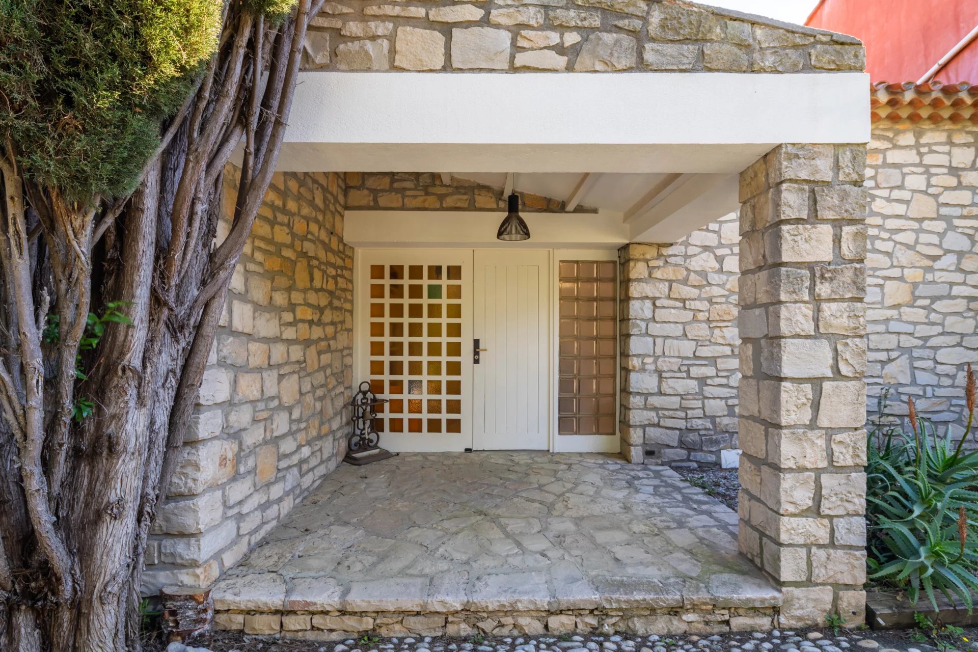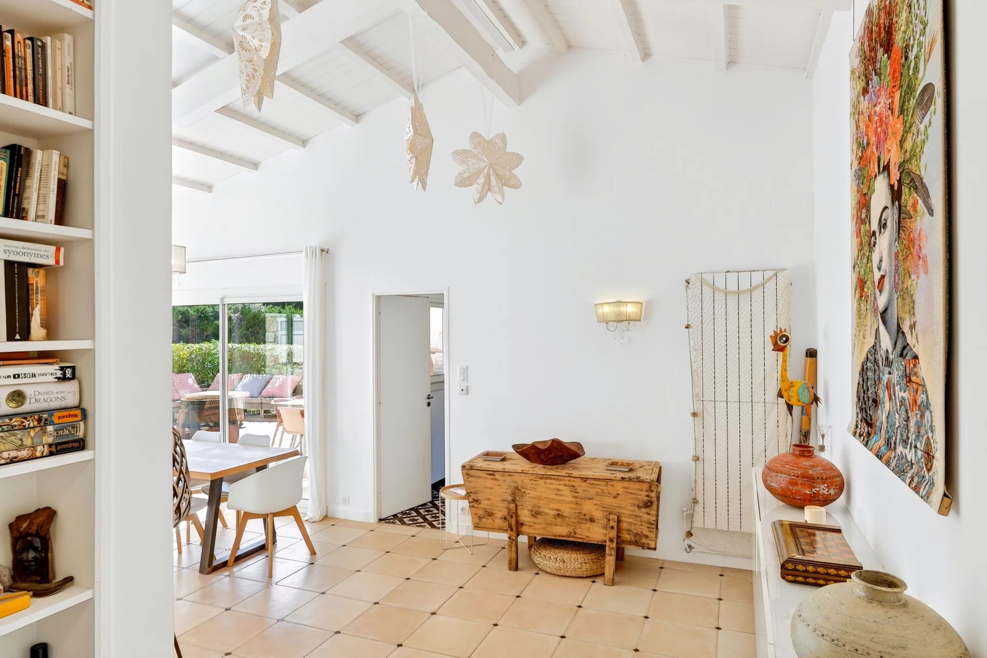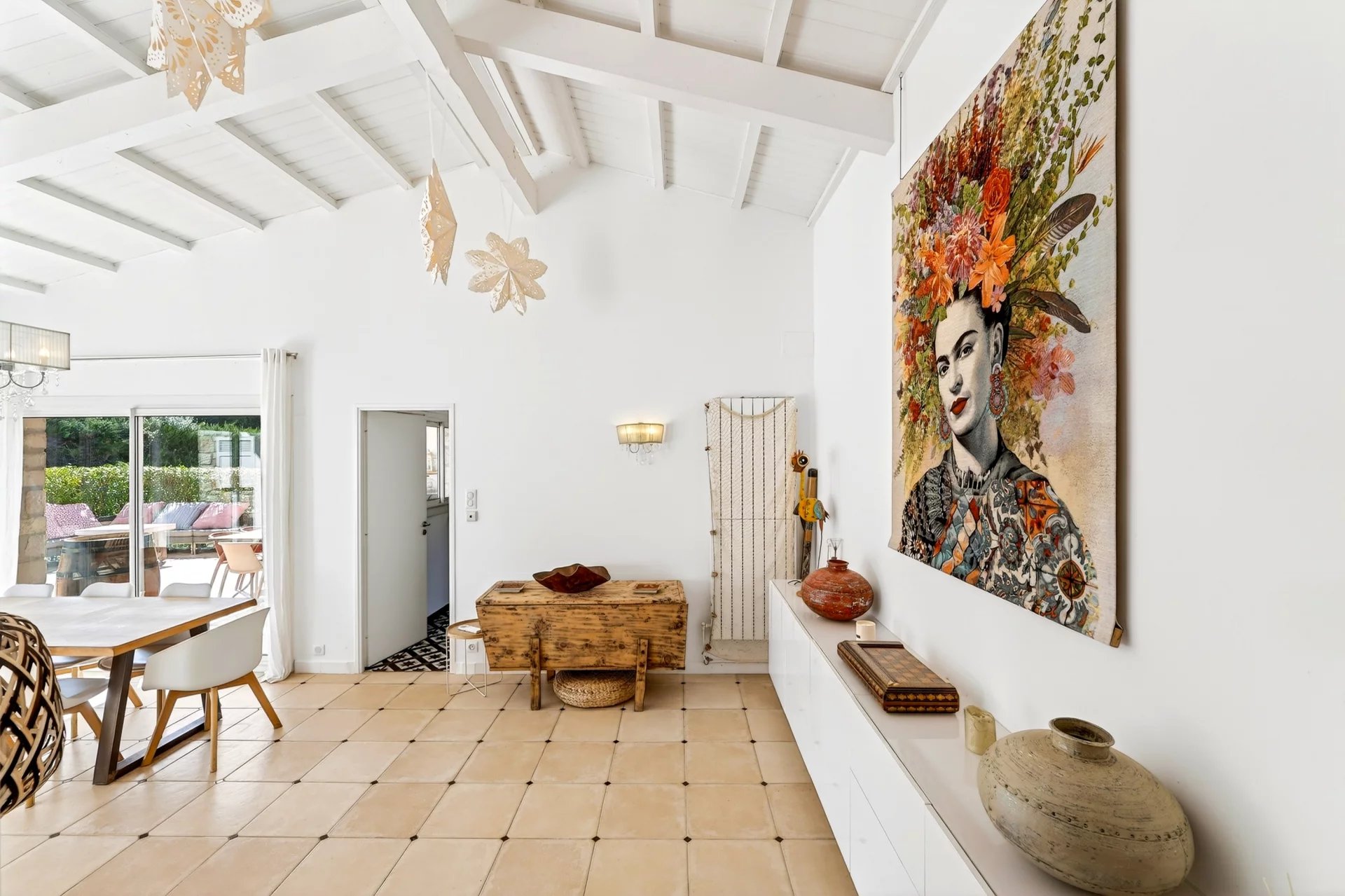 Set entirely on one level and maintained in excellent condition, the residence spans approximately 120 sqm, where authenticity meets understated refinement. A warm and inviting living room with fireplace flows into a dining area enhanced by vaulted ceilings and expansive glass openings, creating a seamless connection to the sunlit terrace. The adjoining kitchen, designed for both functionality and conviviality, is complemented by a utility and pantry space.