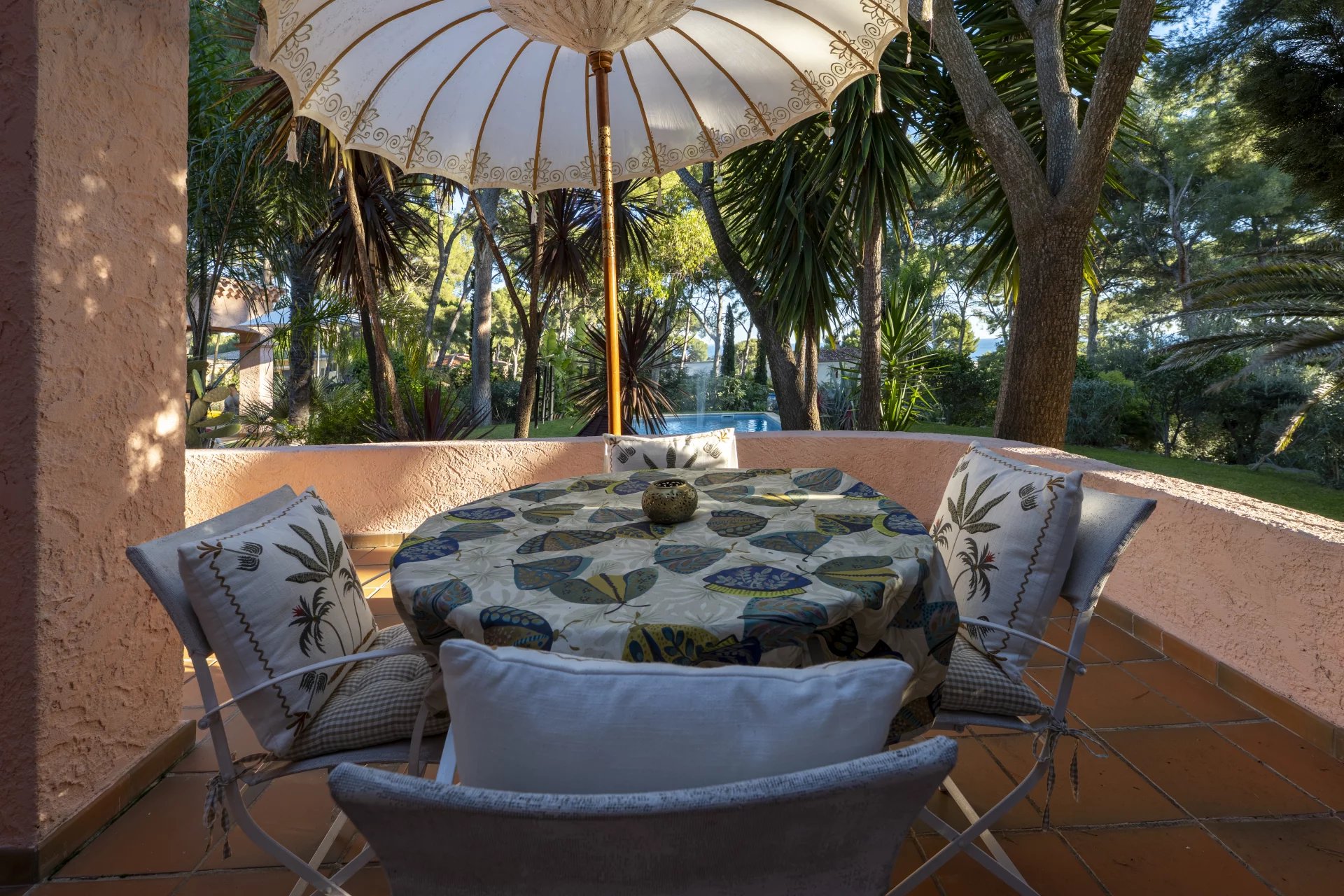 Built in 1992-1993, it sits on a 2,000 m2 wooded plot and enjoys a 180 degree sea view from the Bec de l’Aigle to Ile Verte and Les Embiez. Beaches are a 10-minute walk, and the town center is 20 minutes via the greenway. Quick access to routes for Aix, Marseille, Toulon and the French Riviera.