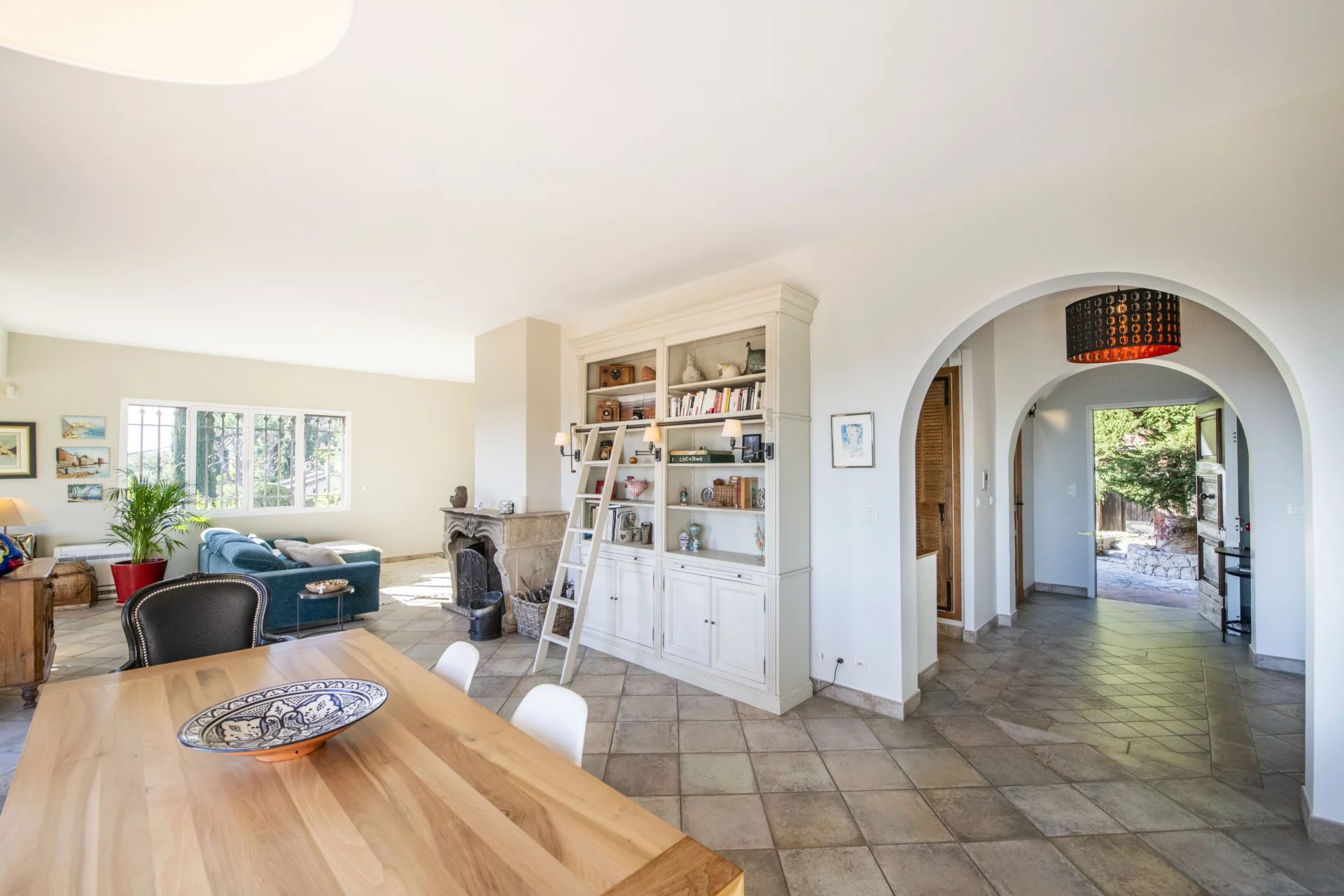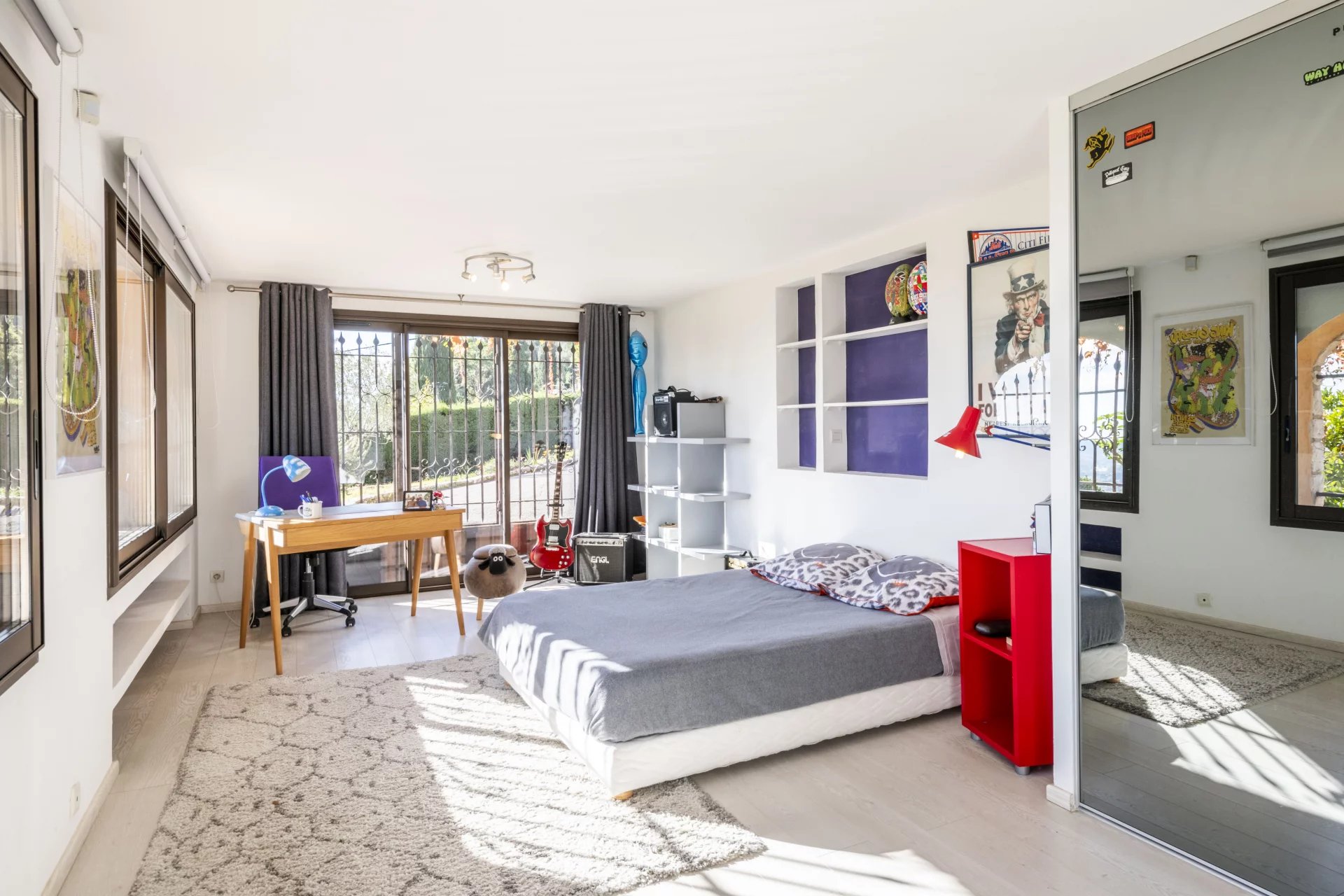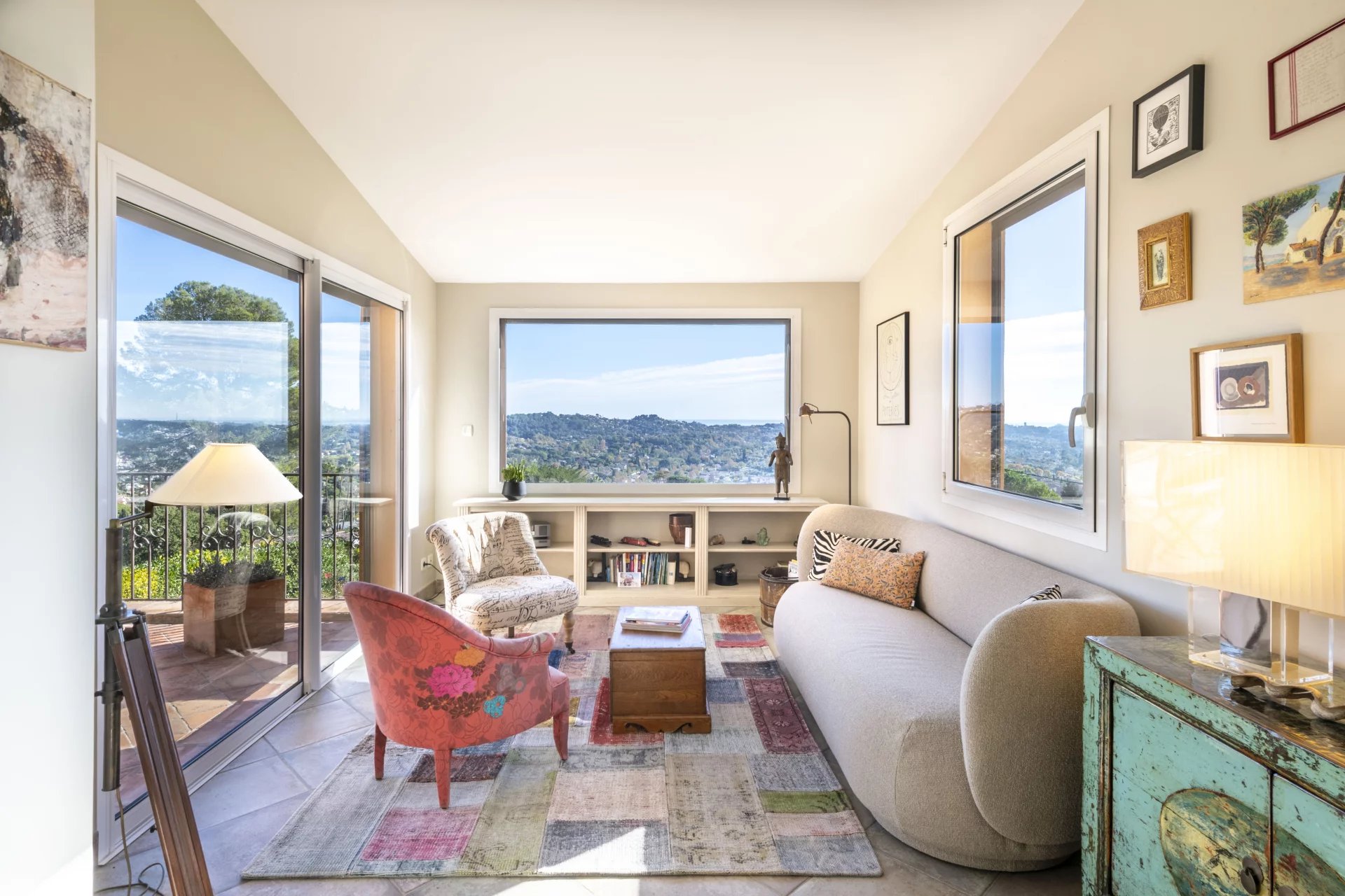 The living room, dining area, and kitchen are filled with natural light thanks to large bay windows framing spectacular views over the verdant valley, the medieval village of Saint-Paul de Vence, and beyond to the Mediterranean Sea. A panoramic terrace, directly accessible from the main living areas, invites you to take full advantage of this stunning scenery.
