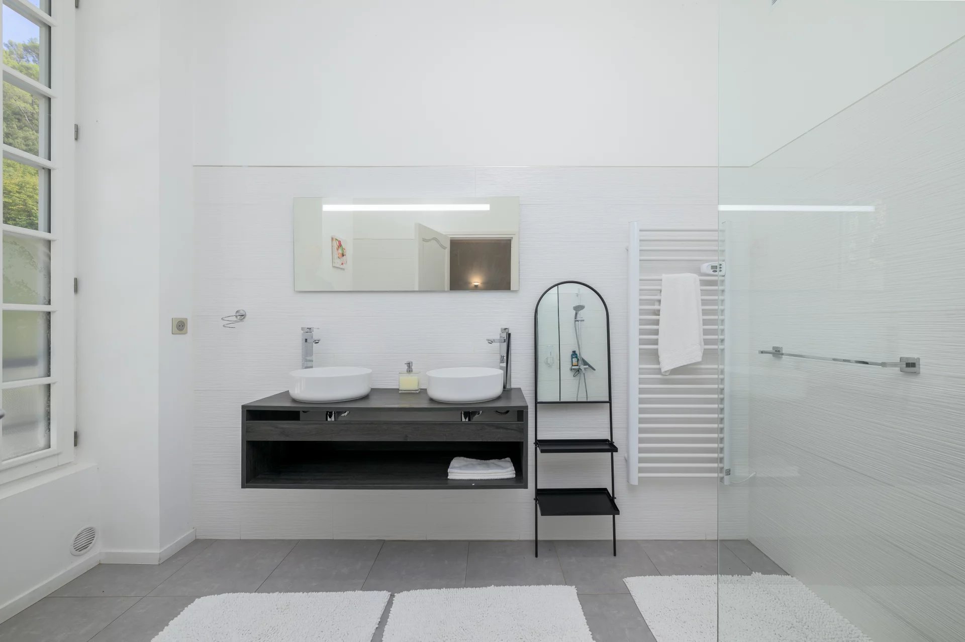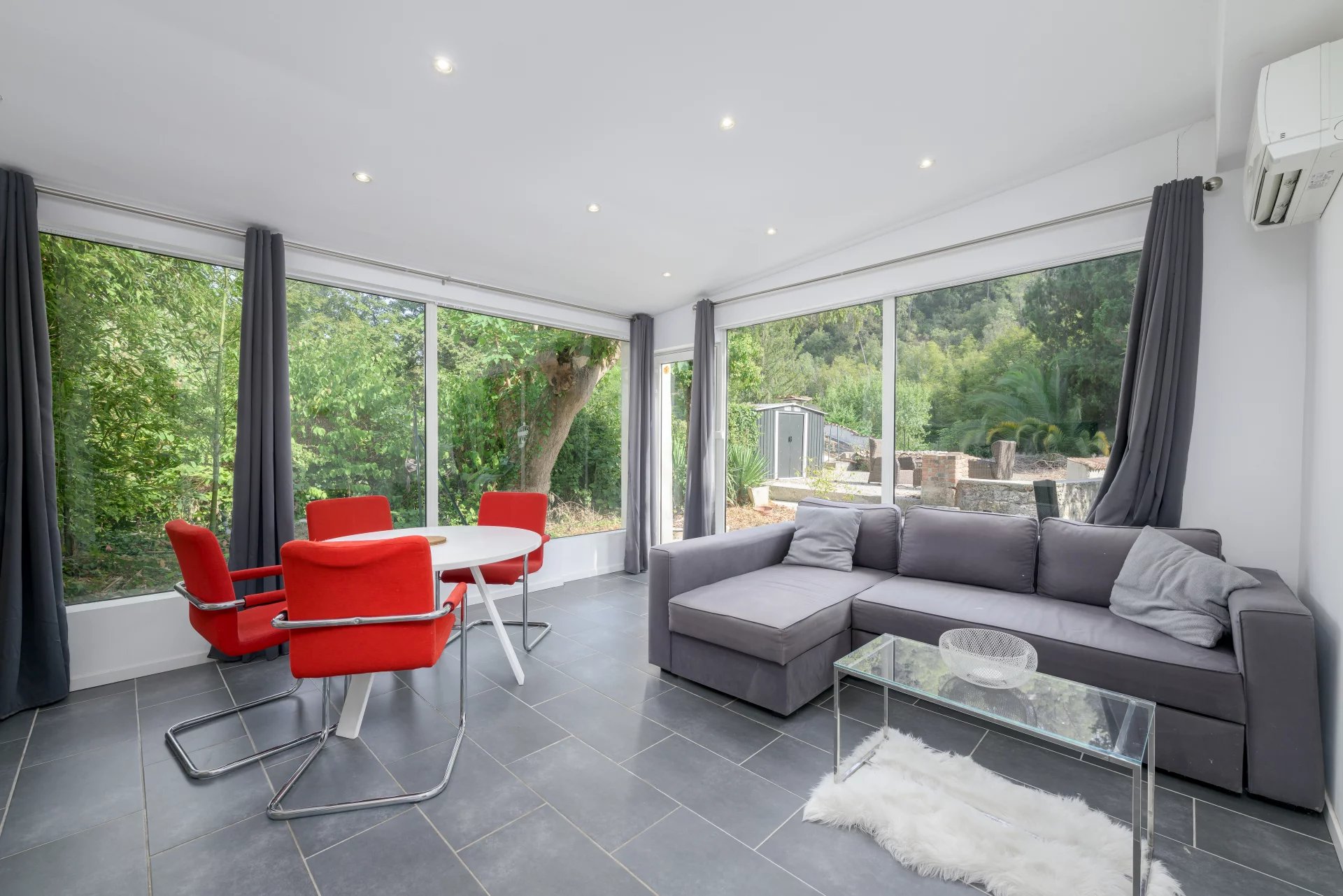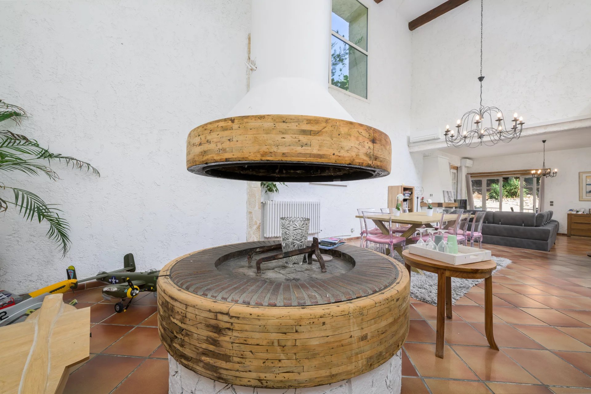 The villa’s bright, spacious interior is perfect for welcoming family and friends. The dining room, with its high vaulted ceiling, is the ideal setting for dinner parties. Large openings allow natural light to flood in, adding to the special ambience of the location near the river in this natural park.