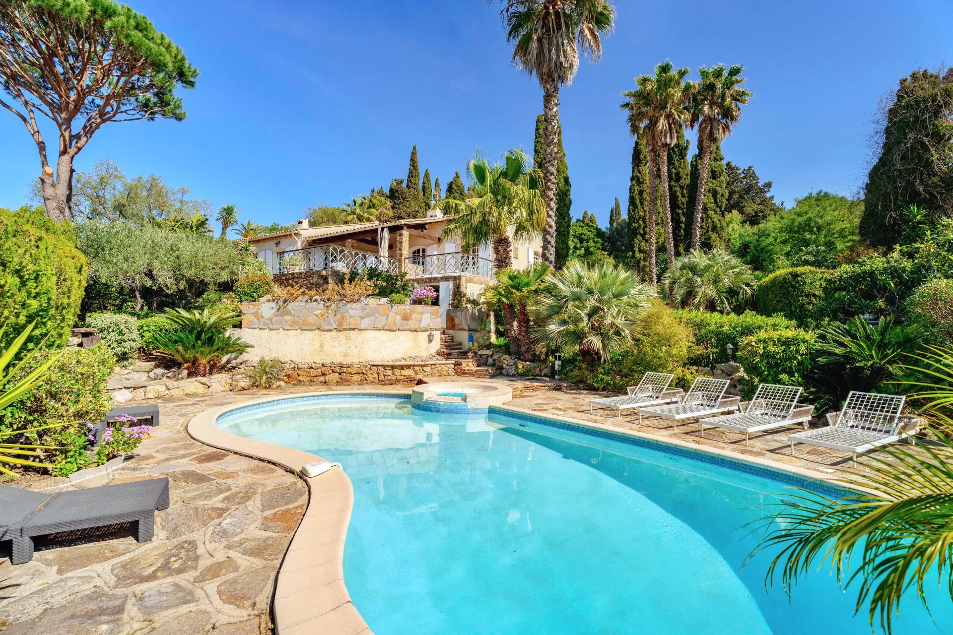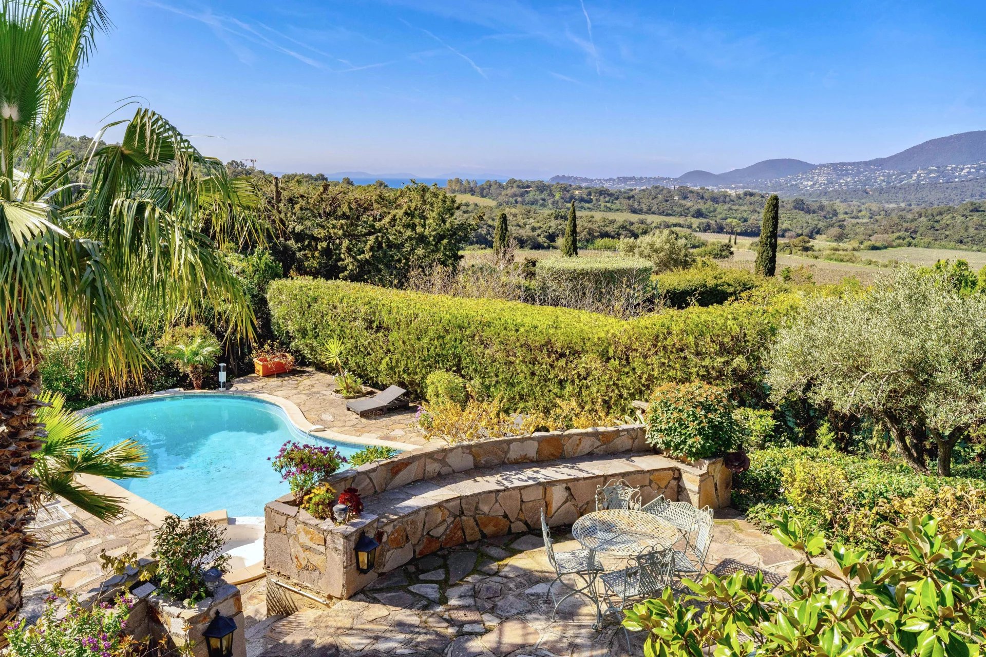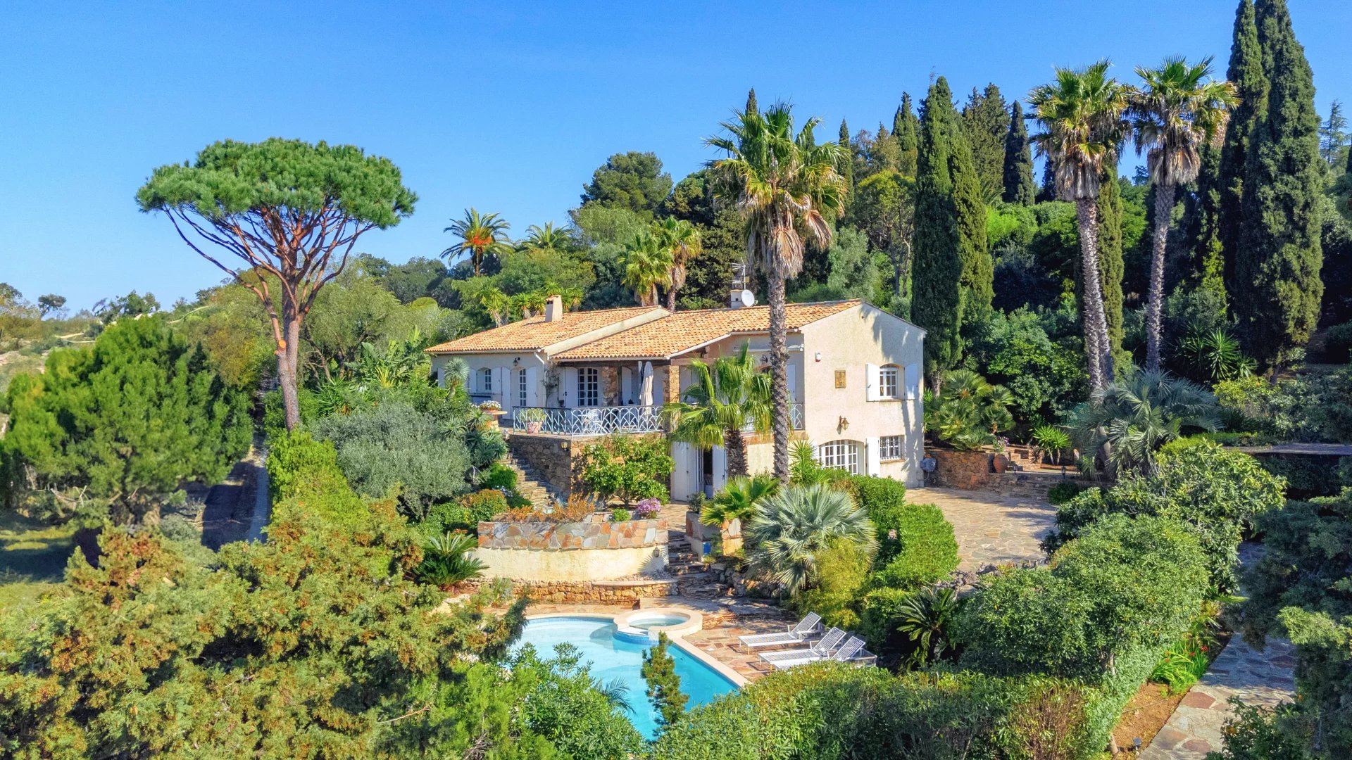 The landscaped 1,400 m2 grounds include multiple terraces for gatherings, a swimming pool to cool off under the Mediterranean sun.