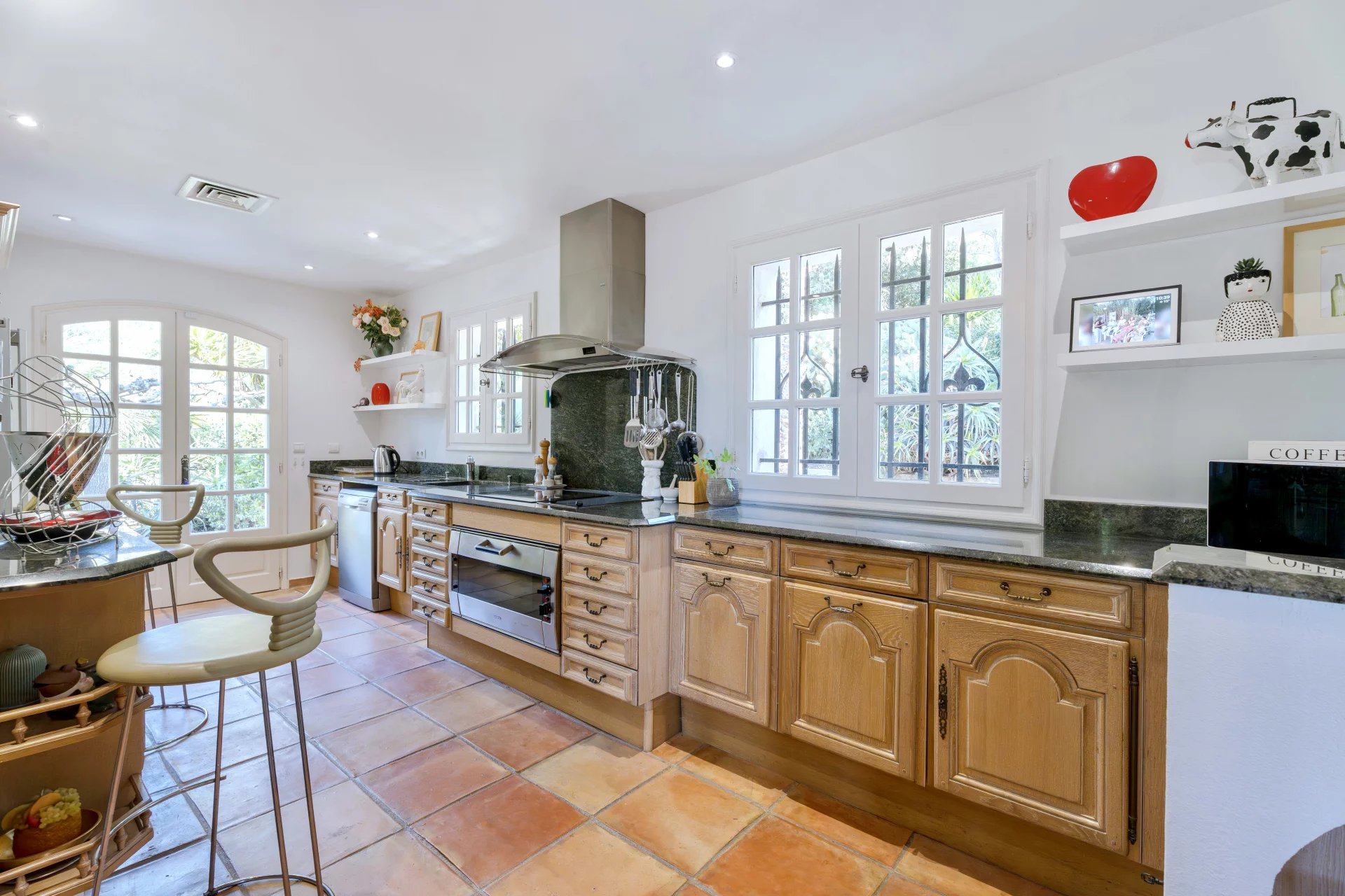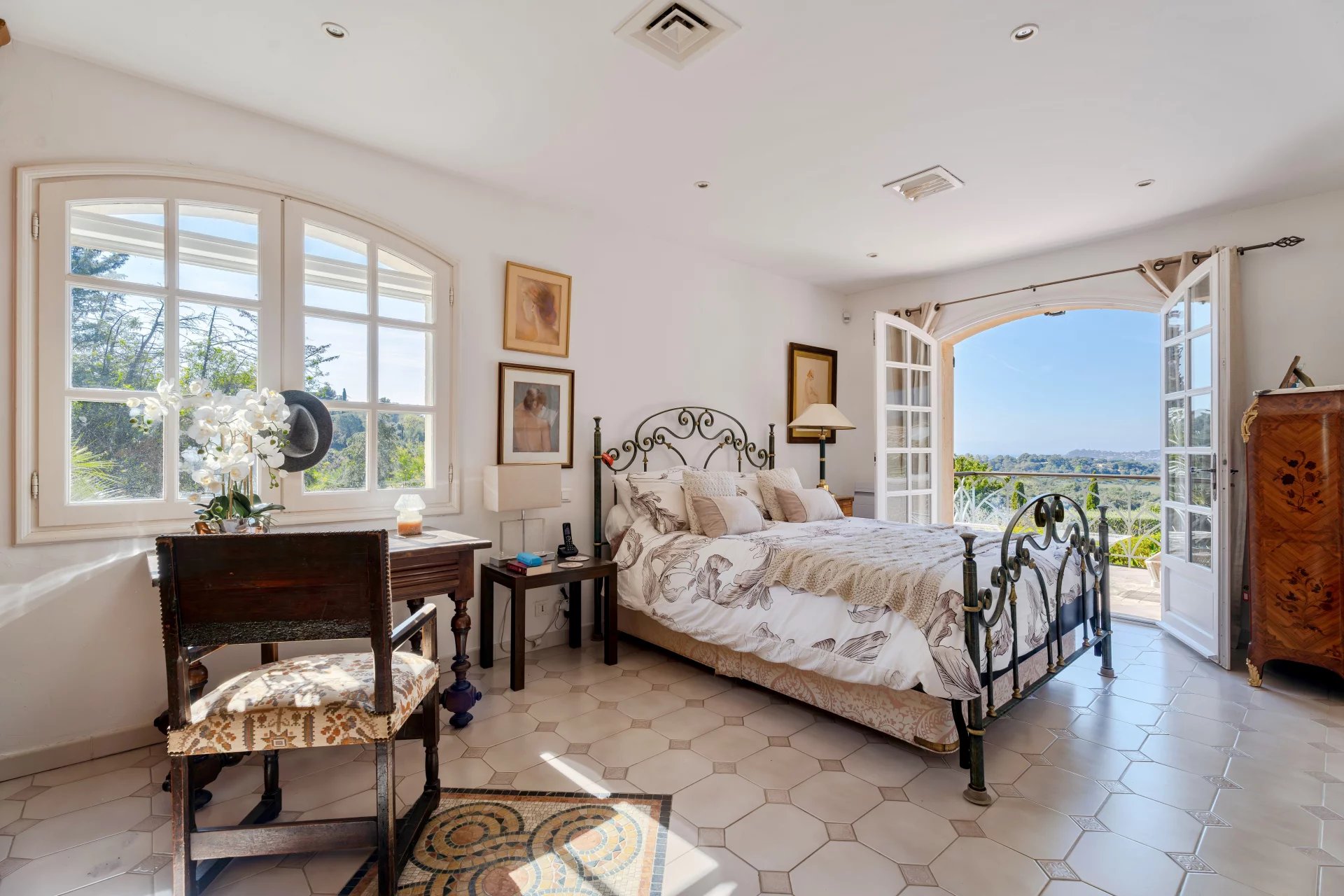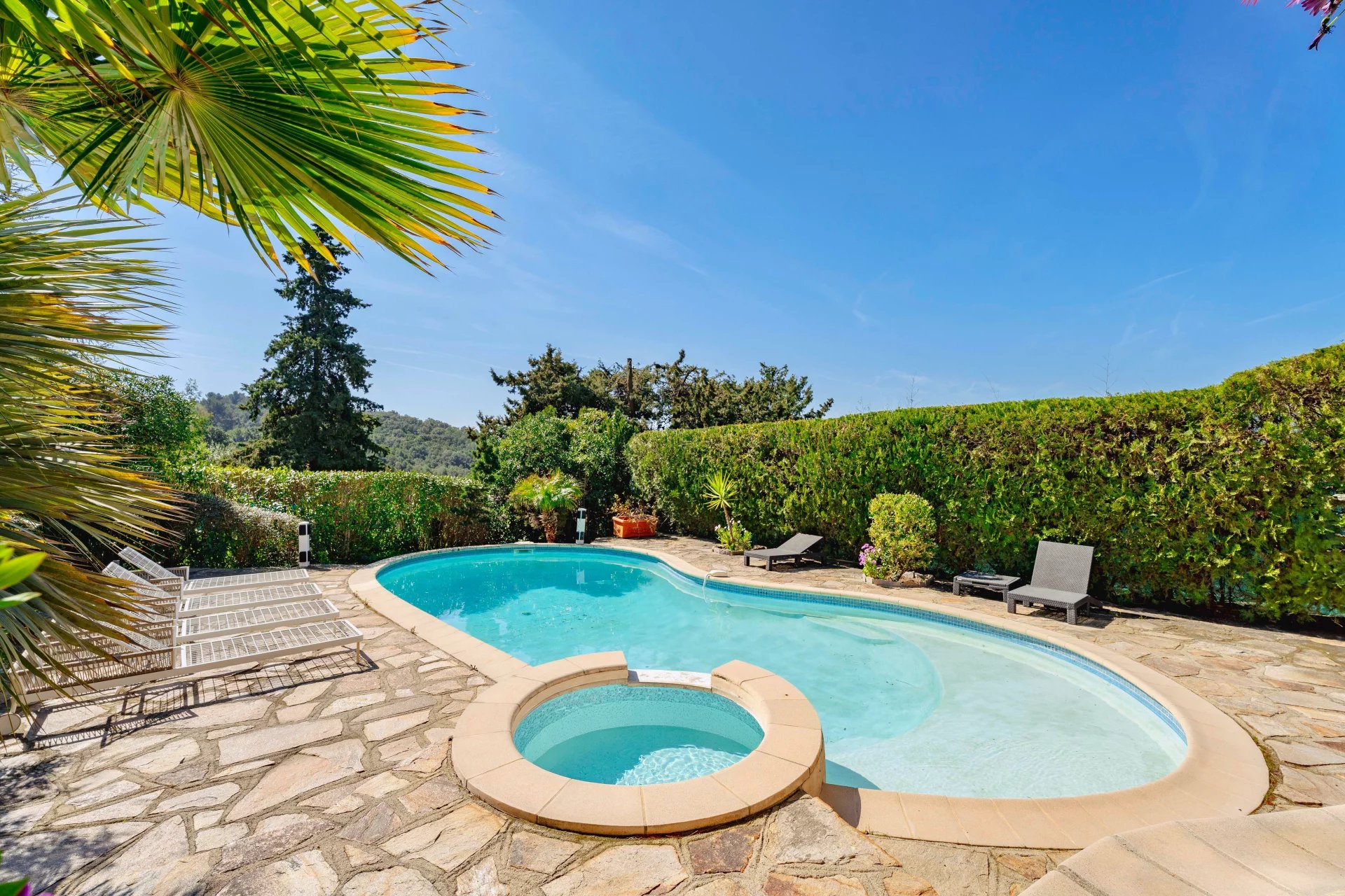 The landscaped 1,400 m2 grounds include multiple terraces for gatherings, a swimming pool to cool off under the Mediterranean sun.