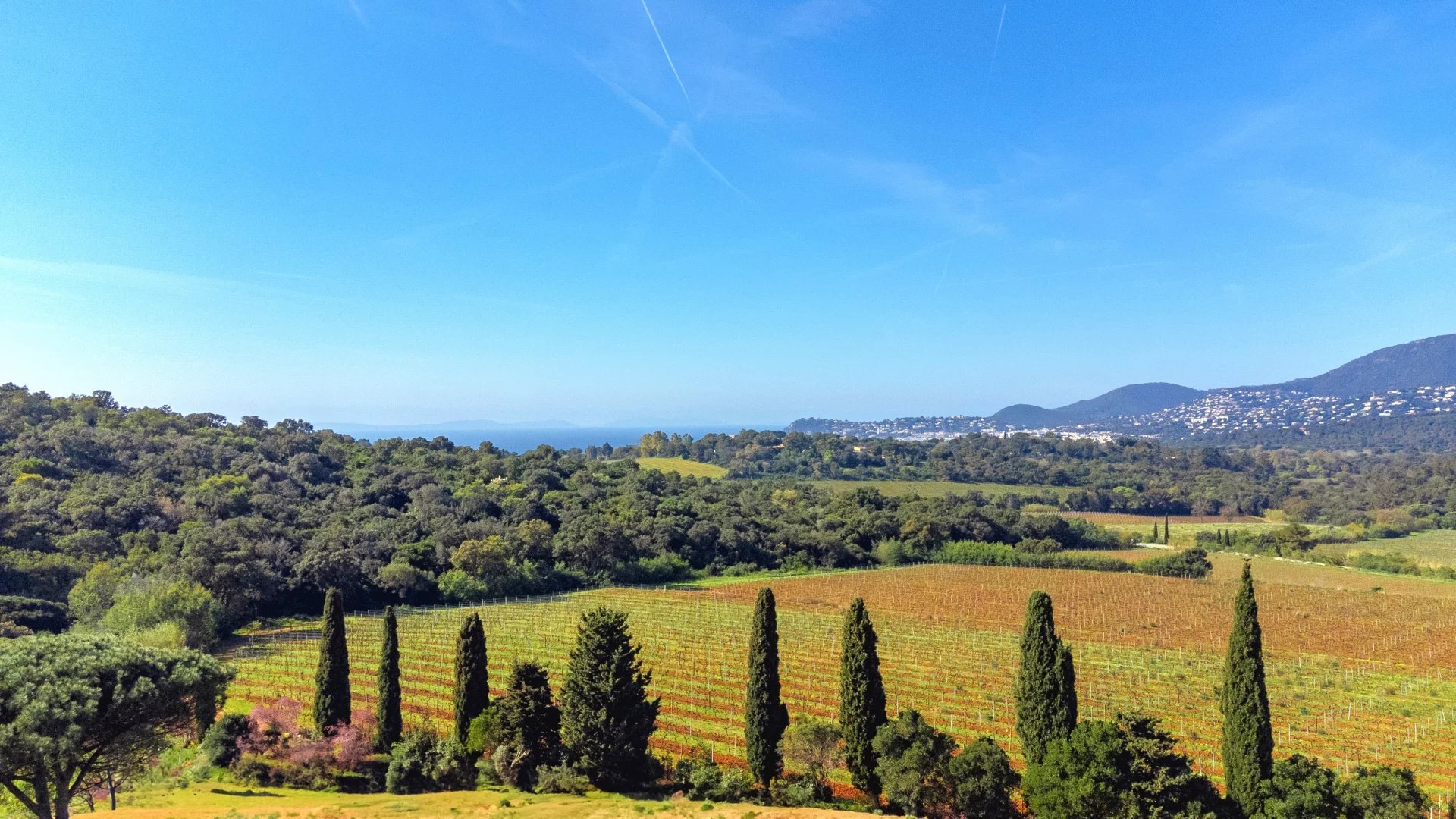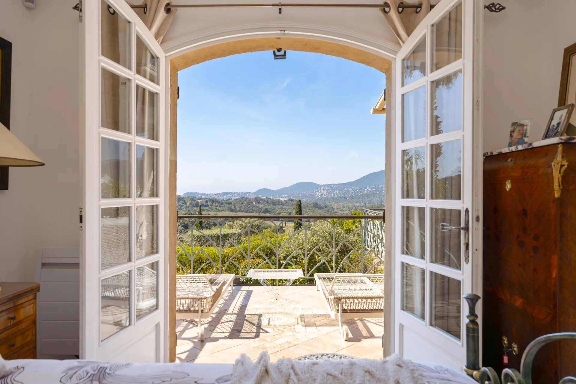 This sea-view villa boasts breathtaking panoramas of the Golden Islands, Cavalaire Port, surrounding vineyards, and rolling hills. Its south-southwest orientation ensures optimal sunlight year-round.
