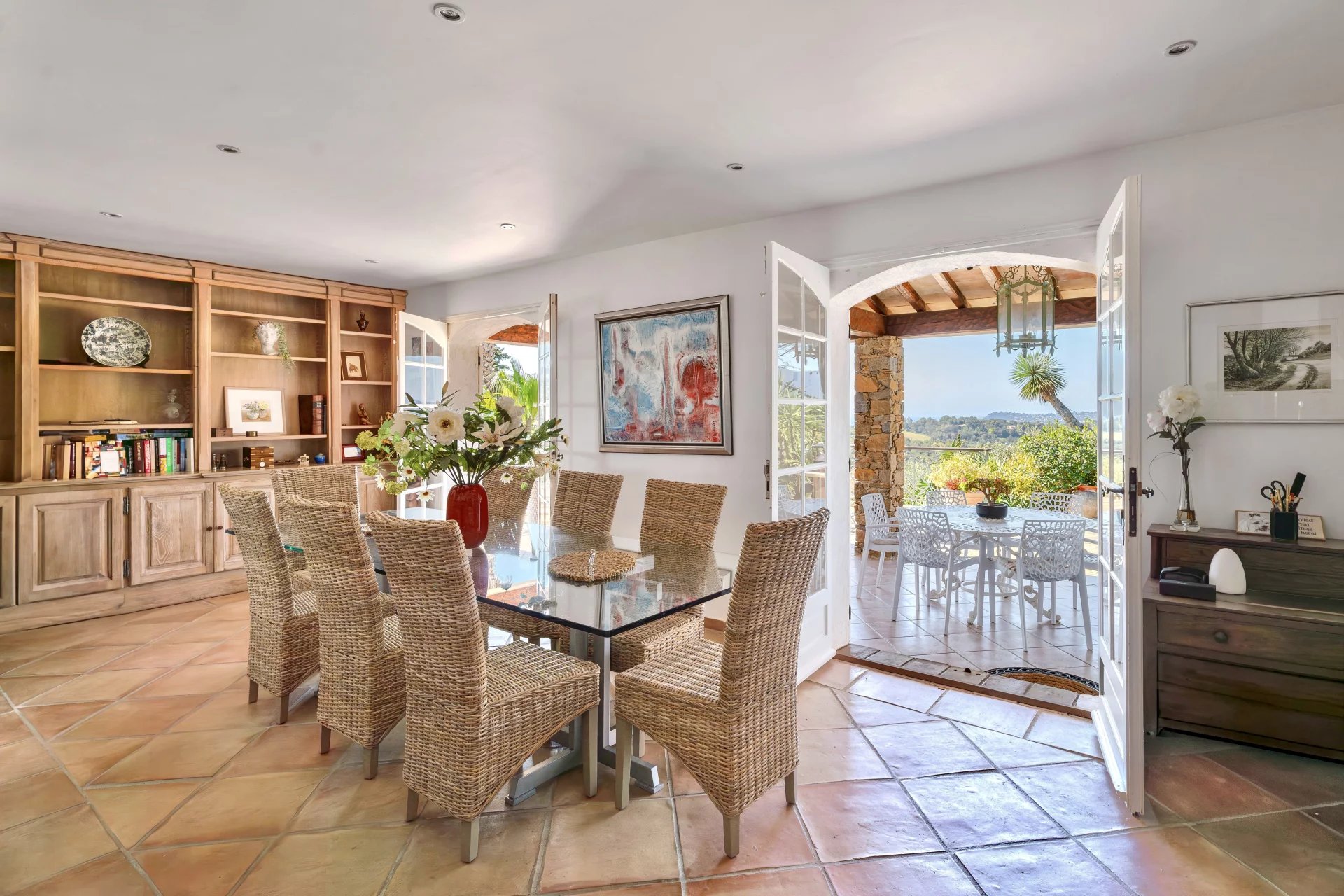 The living room, featuring a fireplace, opens onto furnished terraces, perfect for enjoying the outdoors in any season. The dining room, also with a fireplace, leads to a covered terrace ideal for al fresco dining. The fully equipped kitchen combines functionality and elegance.