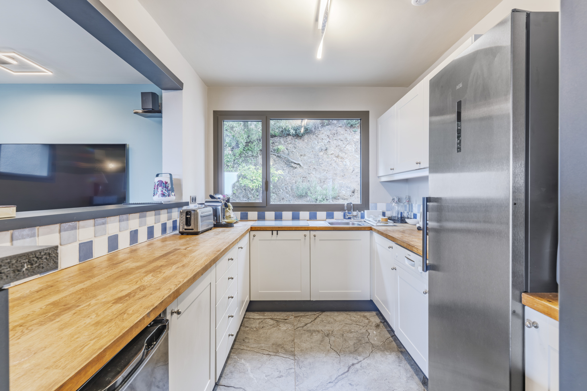 The villa comprises an entrance hall, a spacious living and dining area with fireplace, an open fully equipped kitchen, four bedrooms, two shower rooms, and two separate toilets. The living spaces open onto a large terrace with beautiful sea views in a verdant setting.