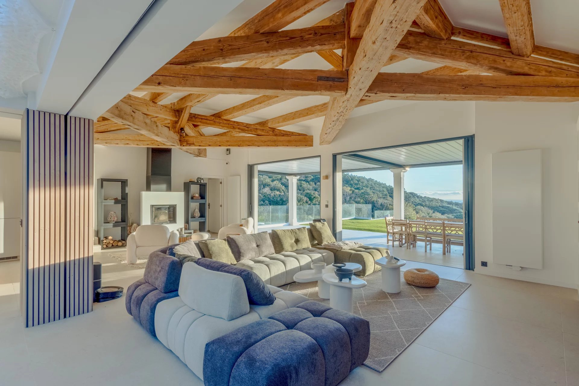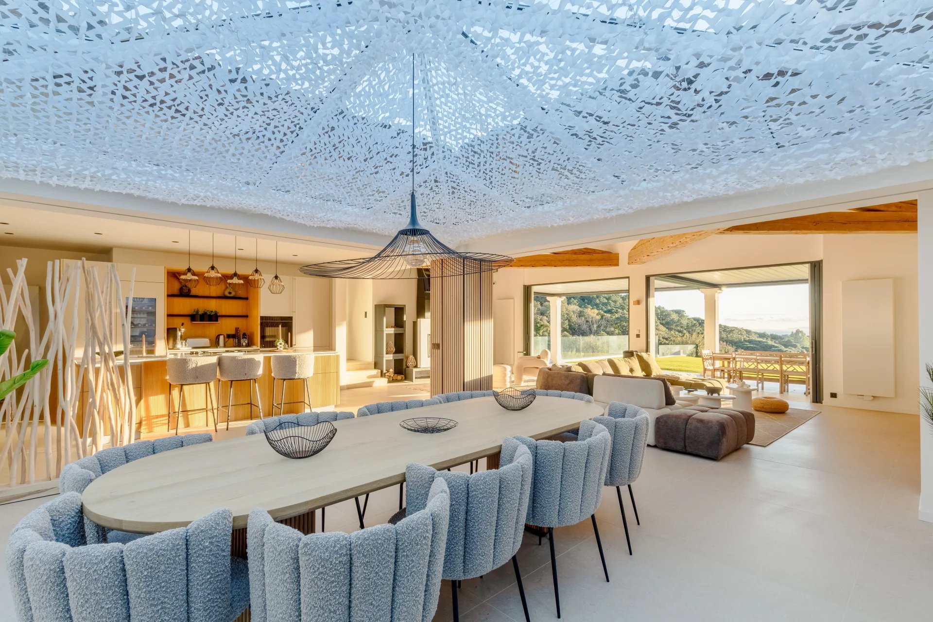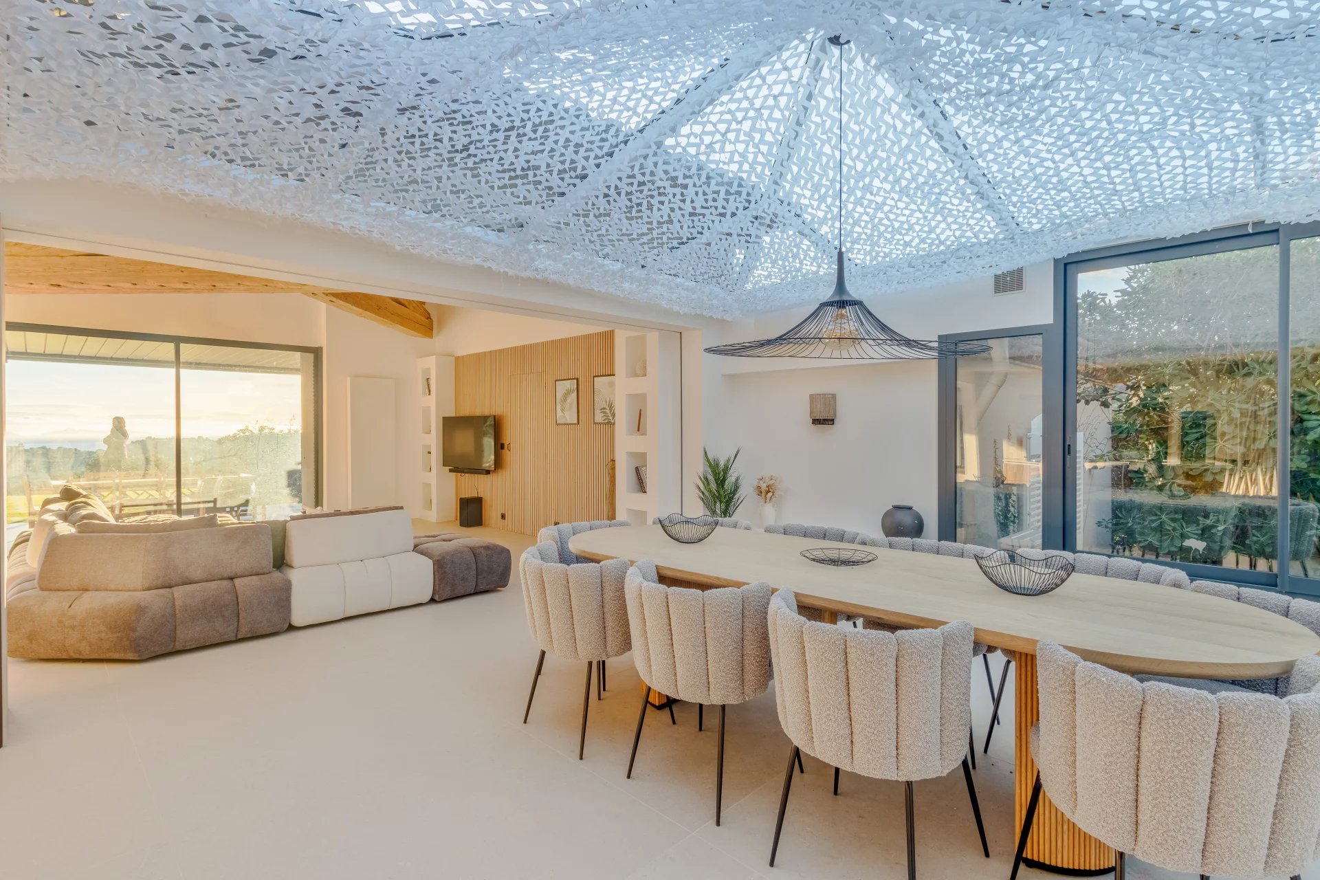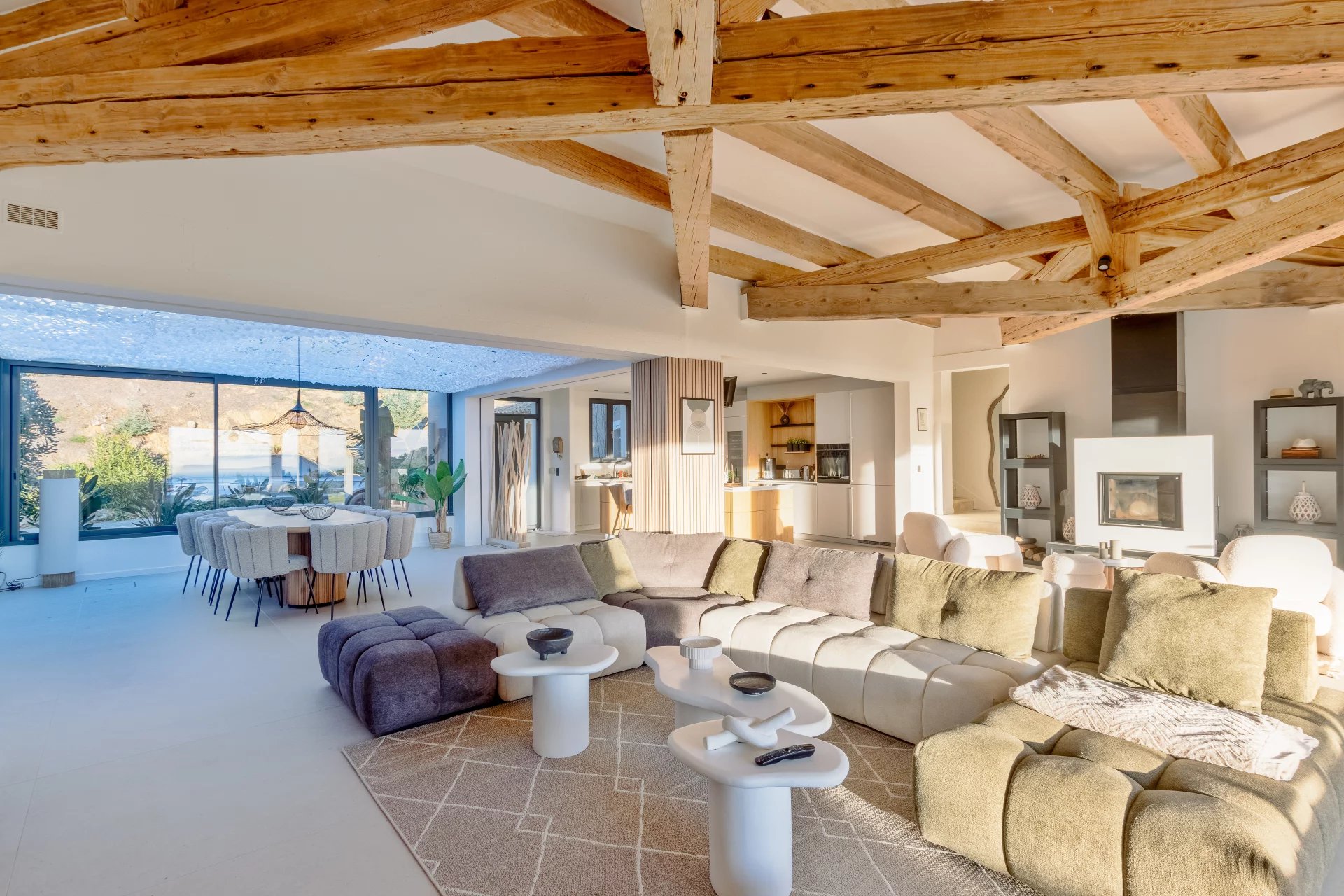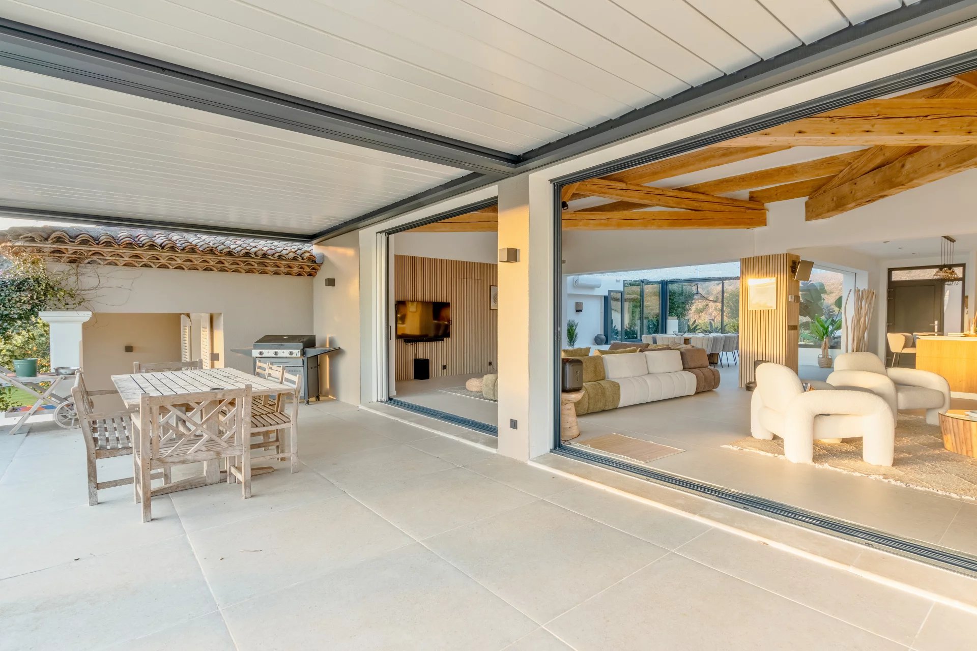 The villa has been completely renovated with high-end amenities, offering light-filled rooms and majestic floor-to-ceiling windows that blur the line between interior and horizon. A perfectly equipped custom-built kitchen with wine cellar, double refrigerator and laundry room opens onto an elegant dining room highlighted by glass roofs, while the living room with fireplace extends onto large terraces fitted with a bioclimatic pergola.
