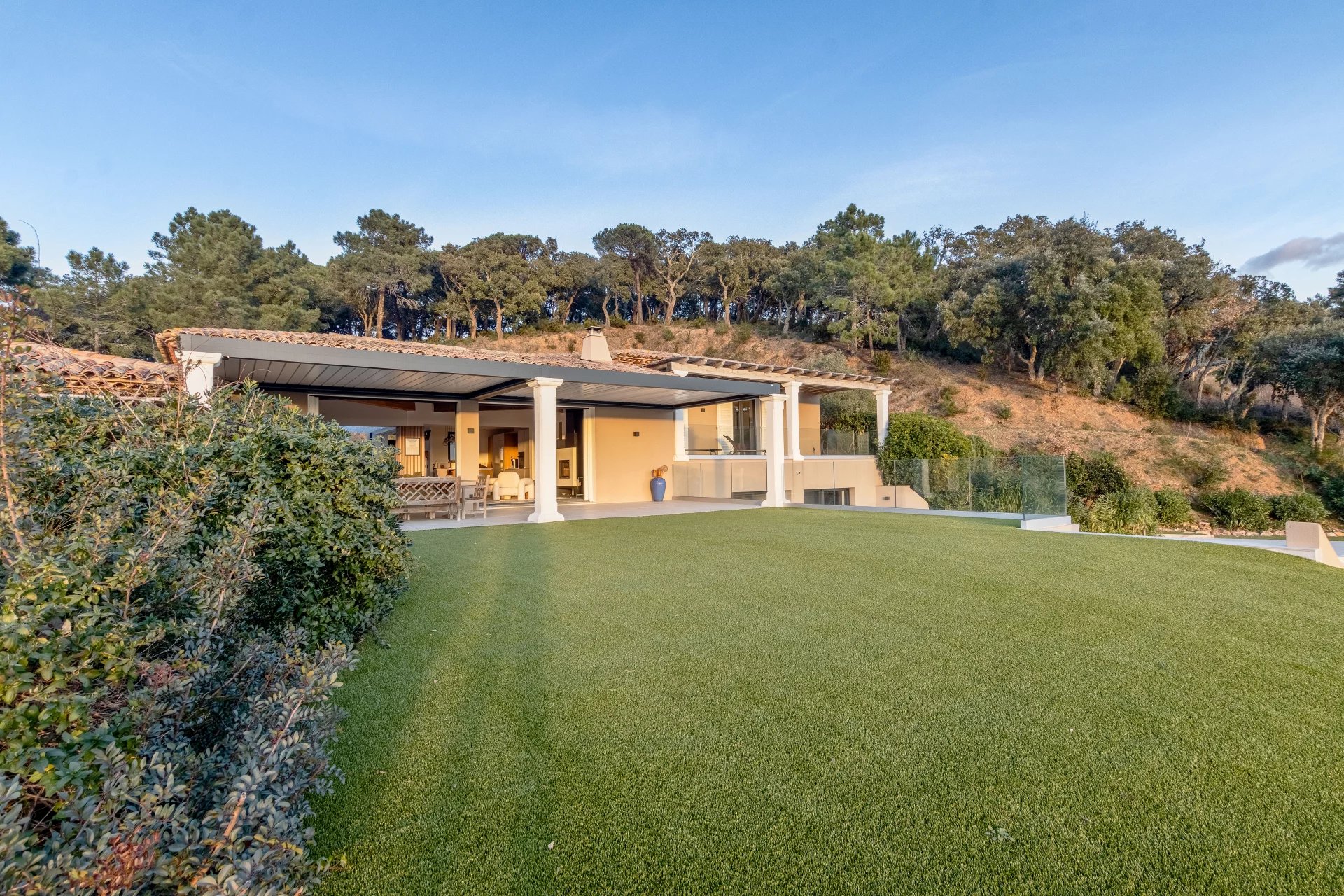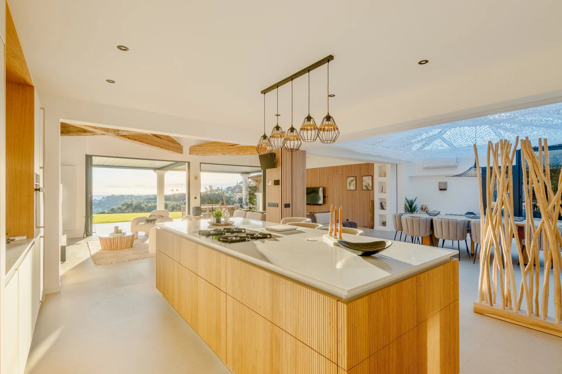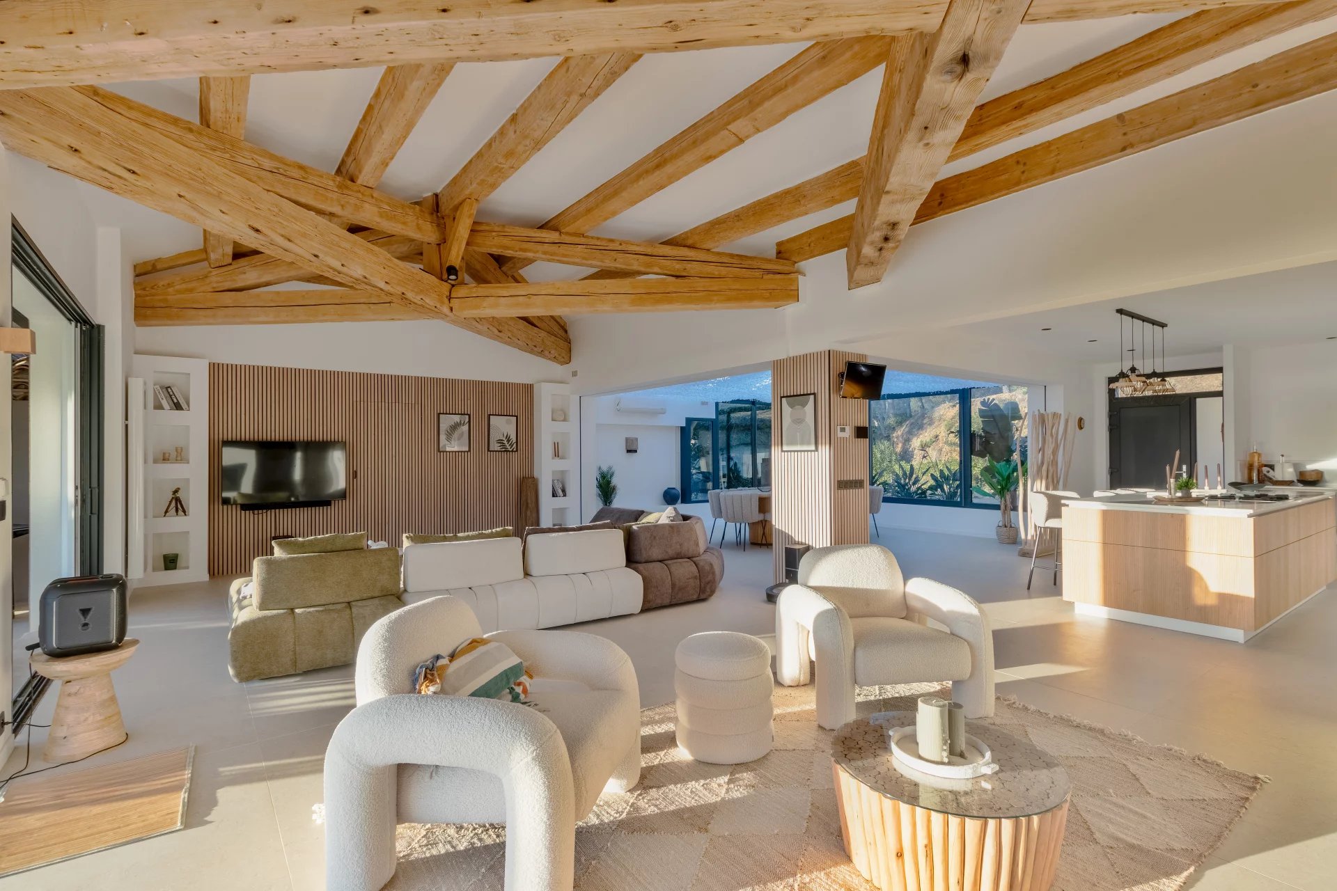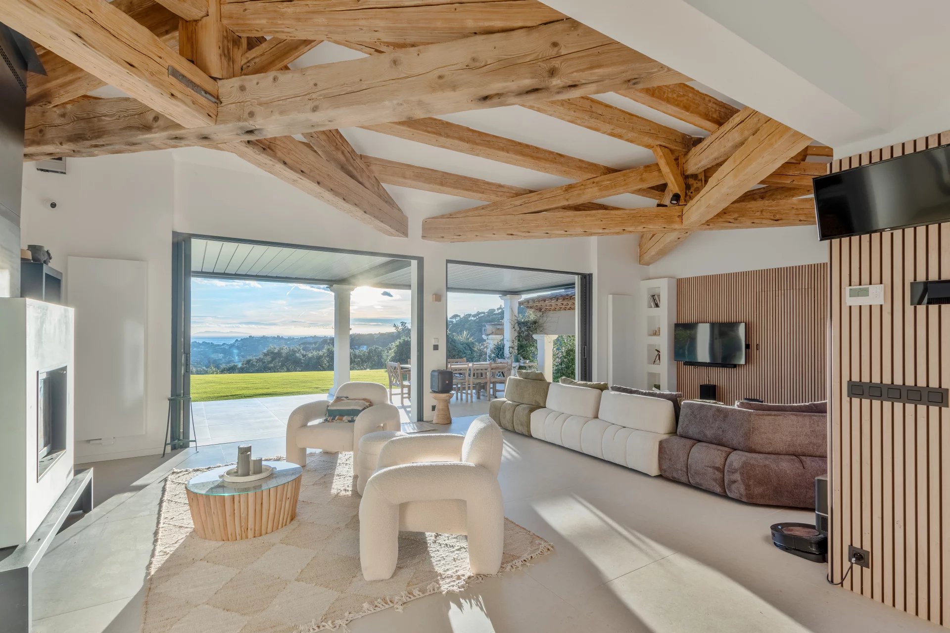 The villa has been completely renovated with high-end amenities, offering light-filled rooms and majestic floor-to-ceiling windows that blur the line between interior and horizon. A perfectly equipped custom-built kitchen with wine cellar, double refrigerator and laundry room opens onto an elegant dining room highlighted by glass roofs, while the living room with fireplace extends onto large terraces fitted with a bioclimatic pergola.
