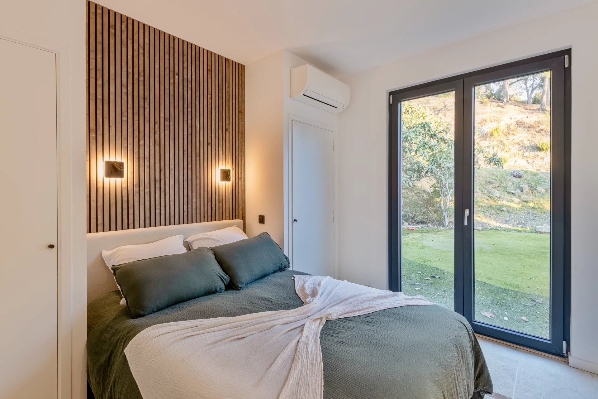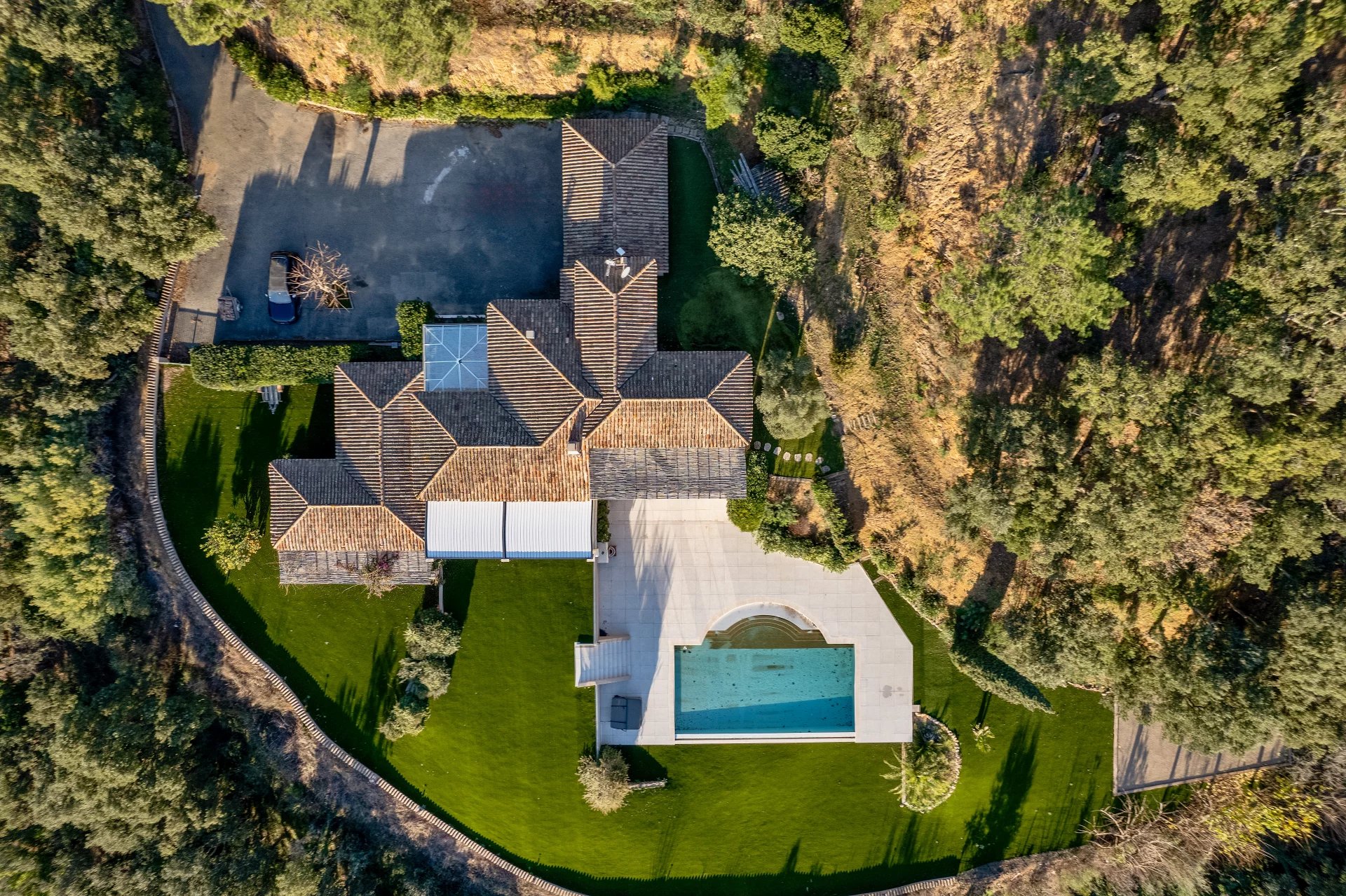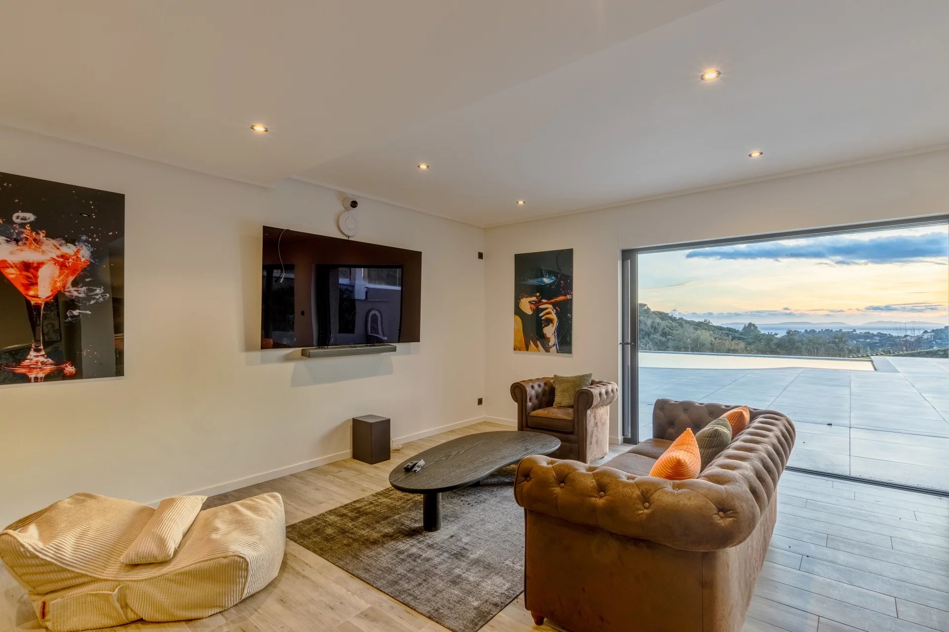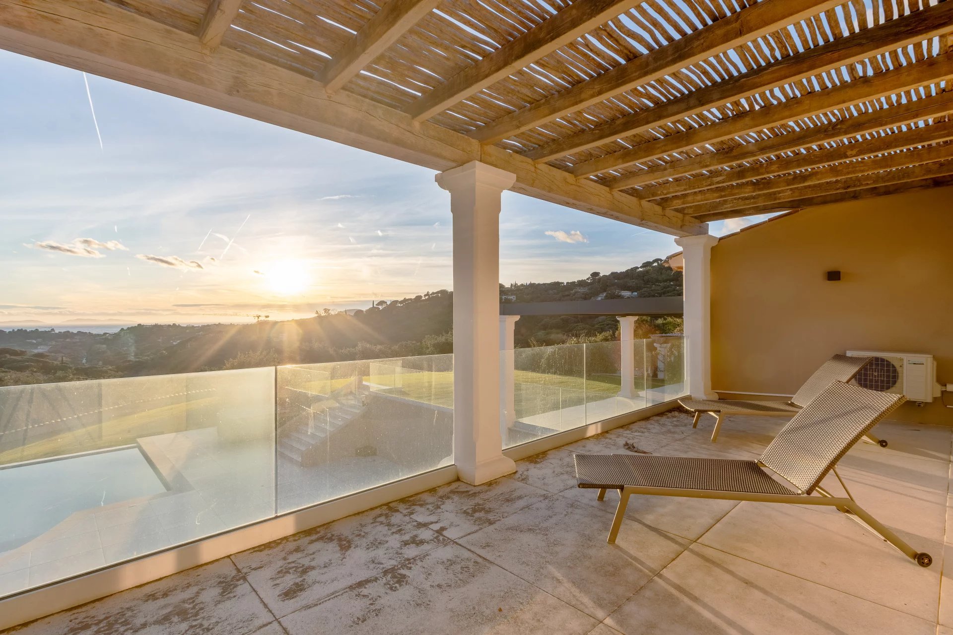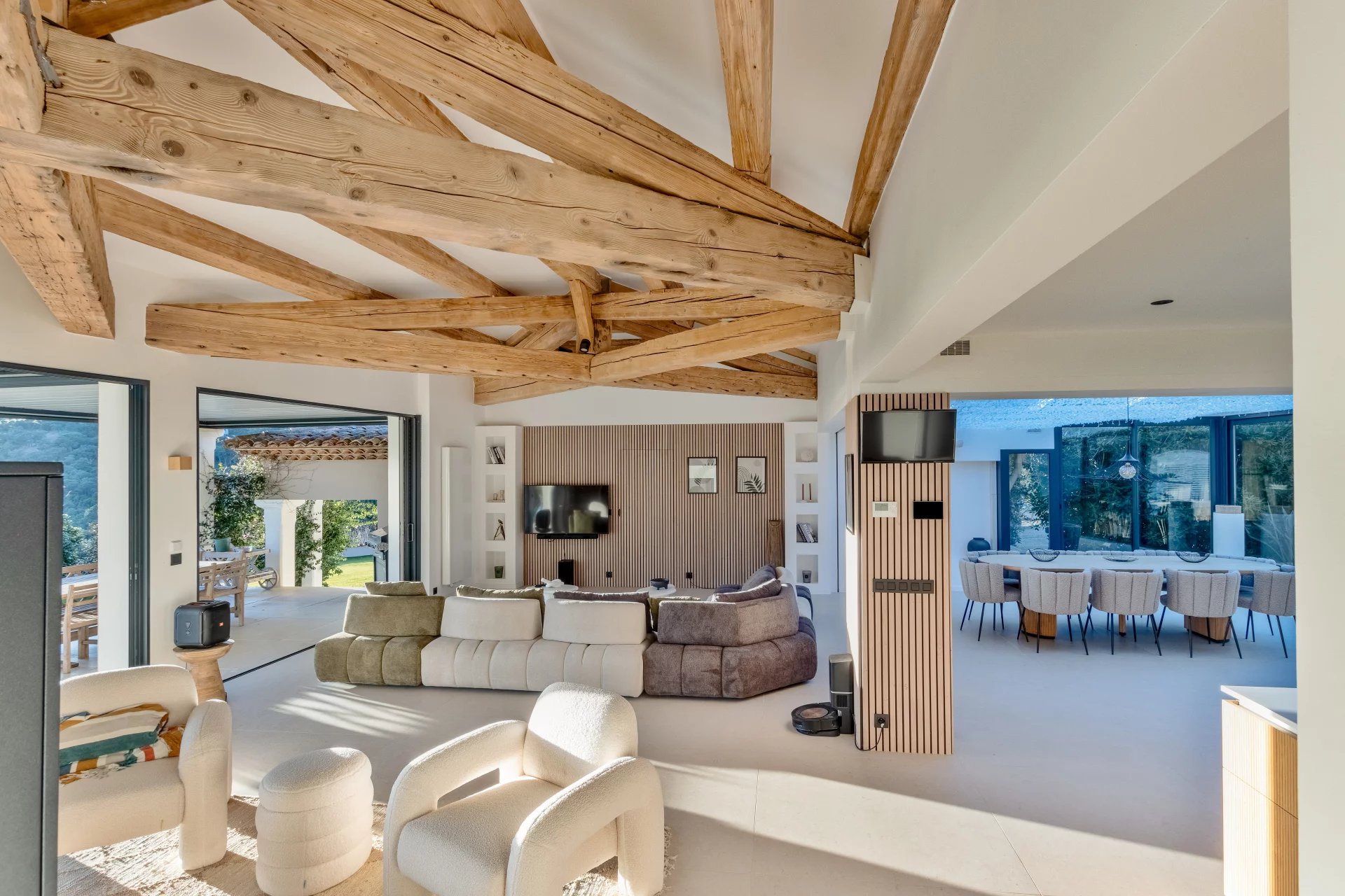The villa has been completely renovated with high-end amenities, offering light-filled rooms and majestic floor-to-ceiling windows that blur the line between interior and horizon. A perfectly equipped custom-built kitchen with wine cellar, double refrigerator and laundry room opens onto an elegant dining room highlighted by glass roofs, while the living room with fireplace extends onto large terraces fitted with a bioclimatic pergola.