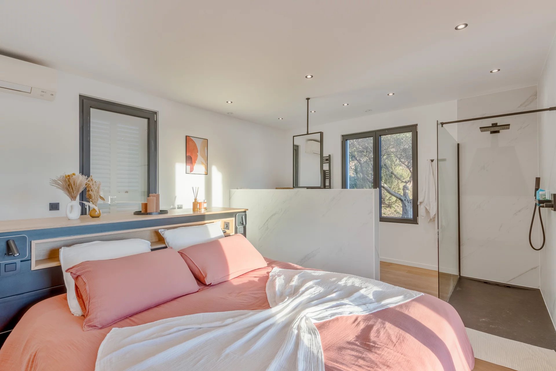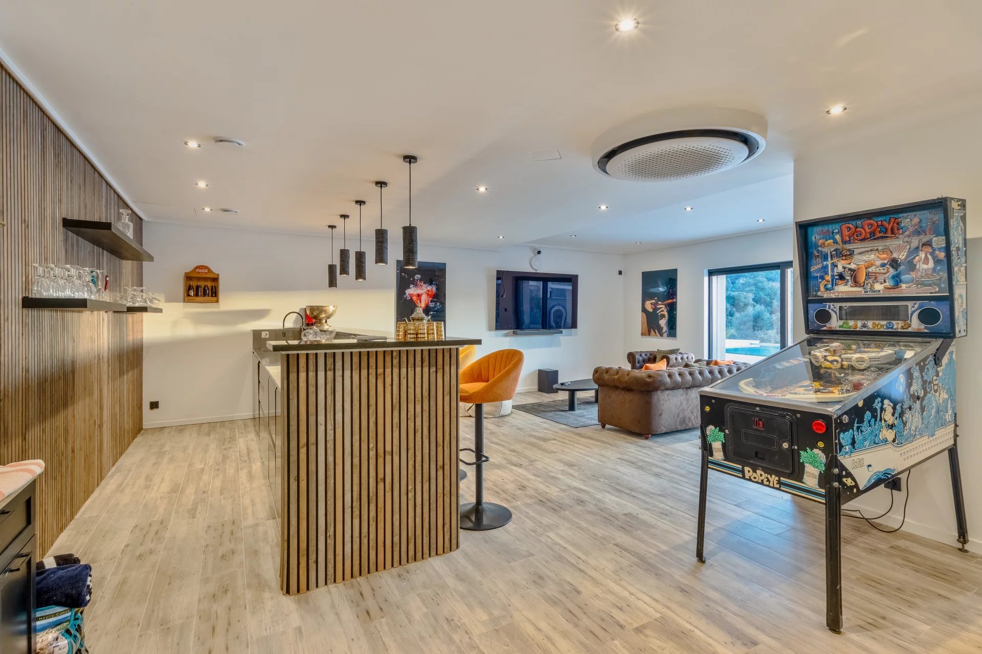 Outside, the art of living unfolds around a spectacular infinity pool facing the sea, a jacuzzi, a games room with bar and billiards, and a shaded pétanque court.