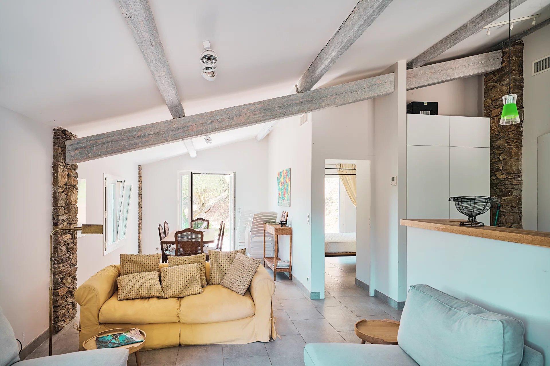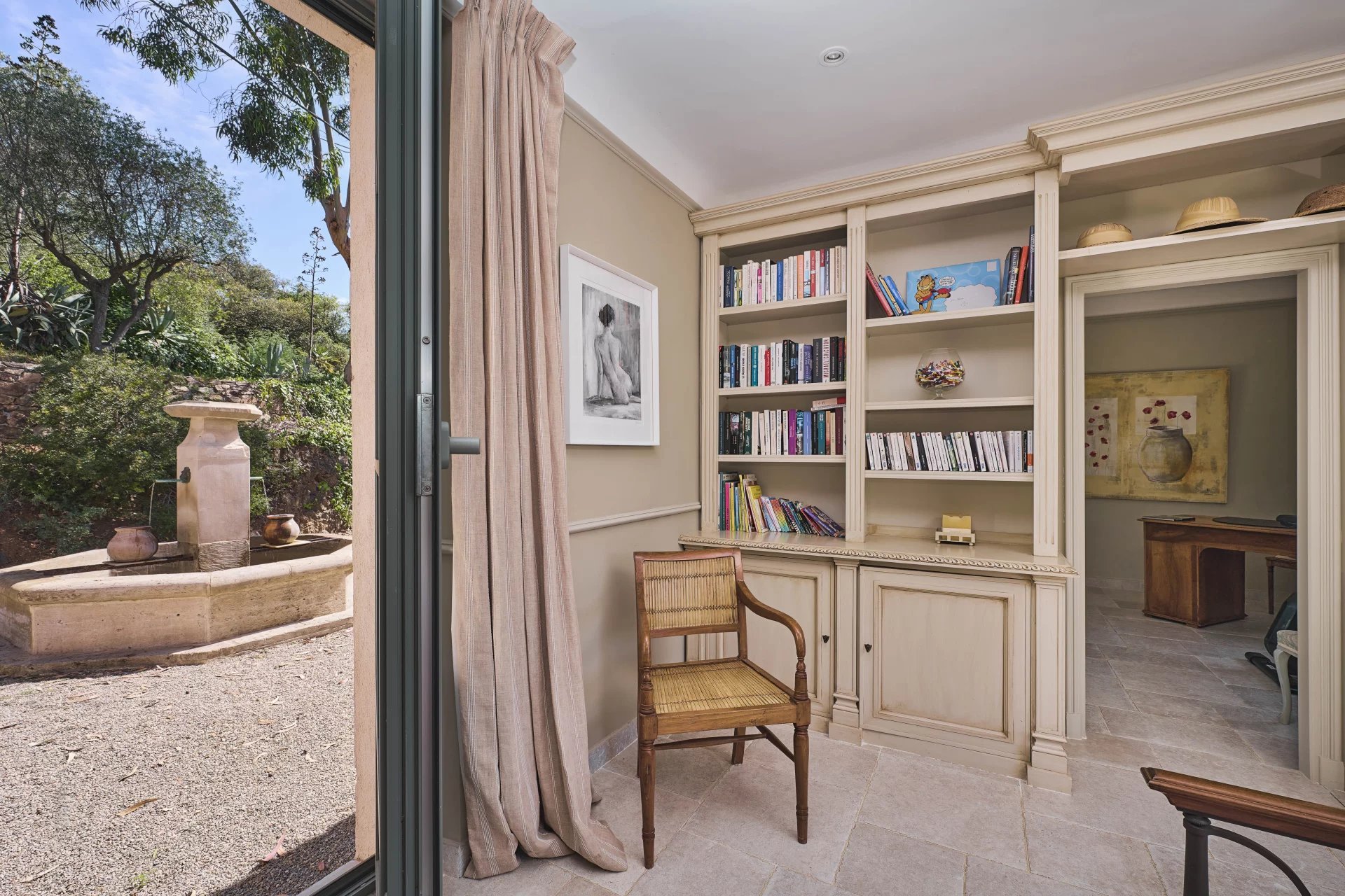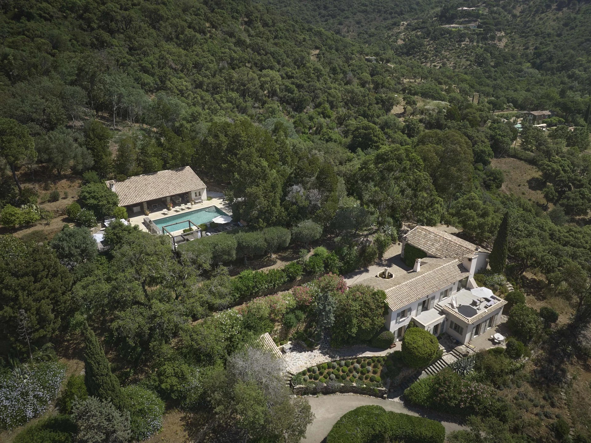 The main house enjoys a living room with fireplace open to a dining room and a fully equipped kitchen with high-end brand, a master bedroom of 60m2 including two offices, a dressing room, a bathroom the whole overlooking a solarium terrace with clear view of the nature of Gigaro as well as a glimpse of the sea