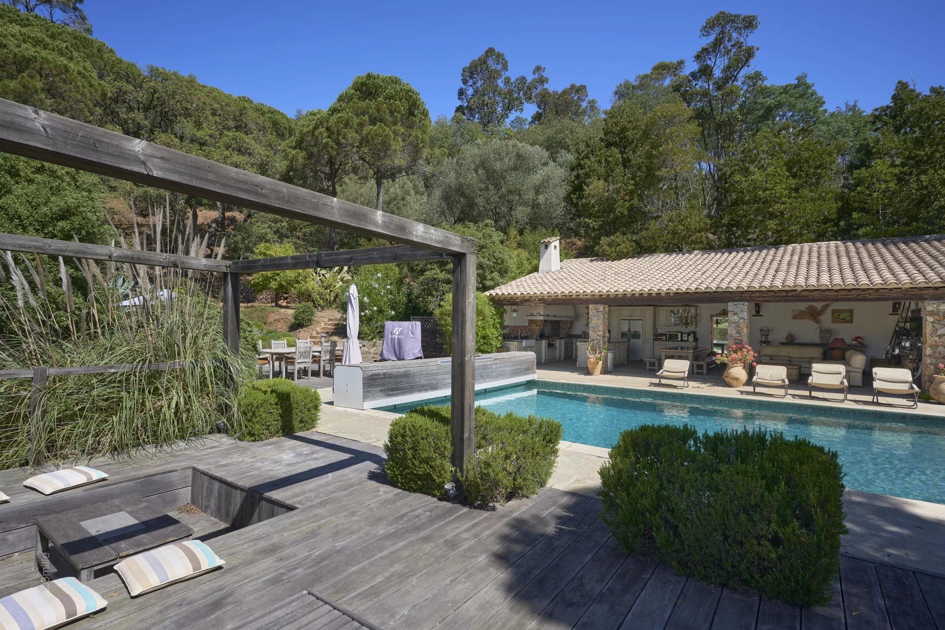 The pool house also renovated offers an equipped kitchen, a dining/lounge area with a large traditional fireplace, and convenient shower and toilet. An exotic wooden terrace along the pool with an integrated dining/relaxation area