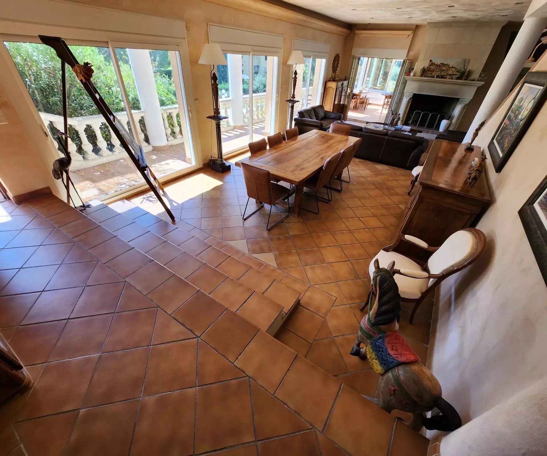 You’ll find a 25 m2 kitchen (solid oak doors), separated by a large glass door from the 55 m2 lounge/living room/fireplace. 5 bedrooms, 2 bathrooms/showers + 2 shower rooms, 2 separate WCs, a cinema room and a large study. Cupboards and dressing rooms throughout.