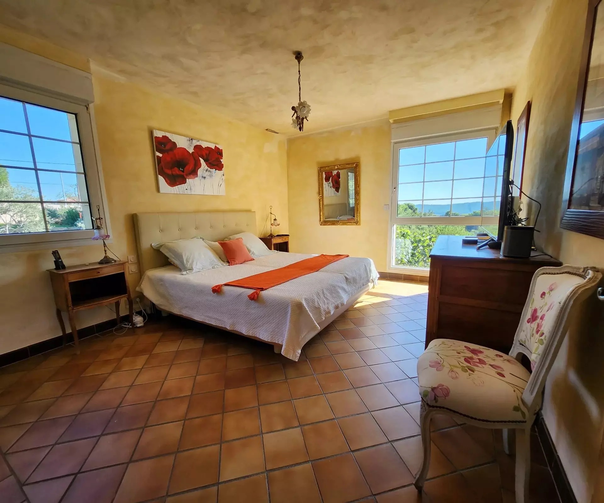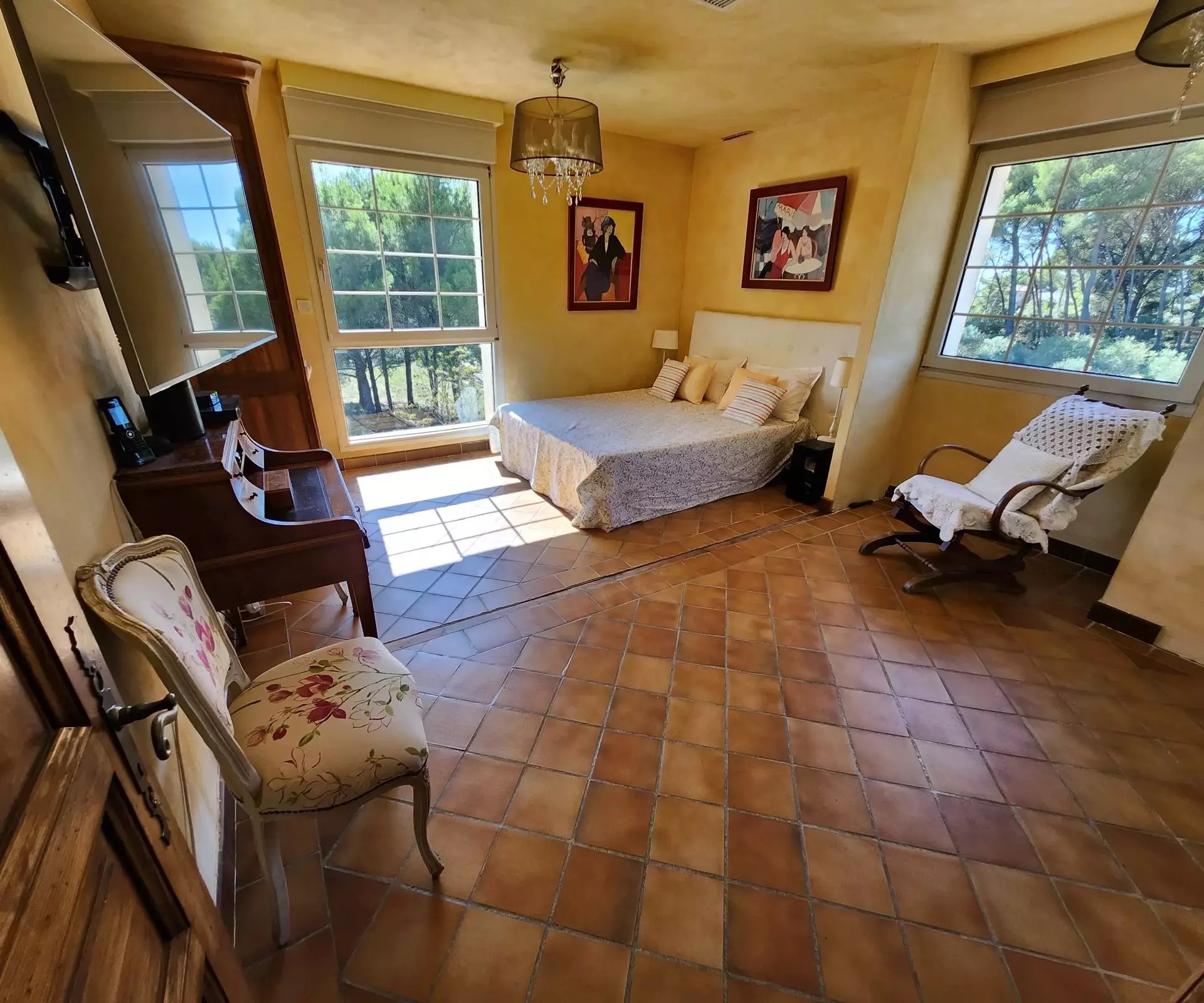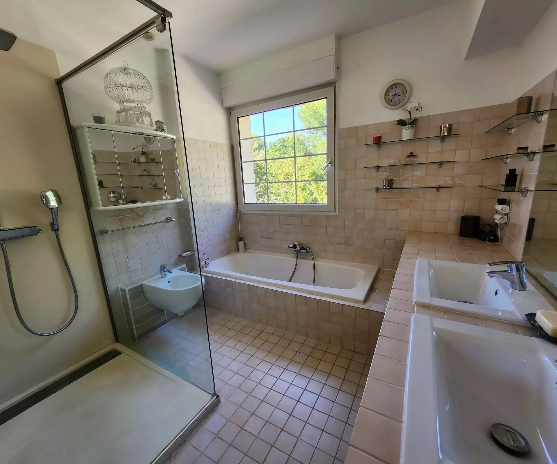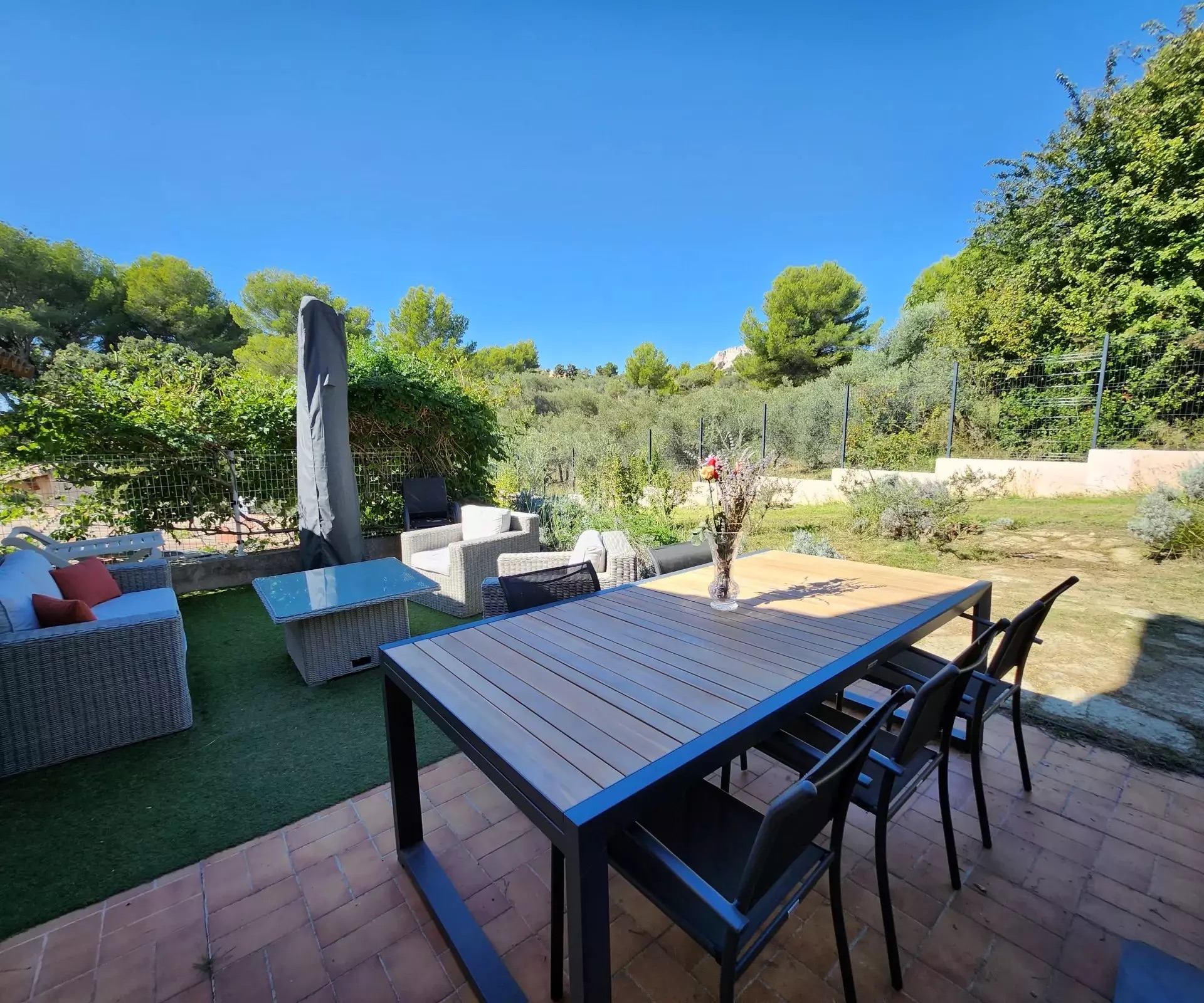 Nestled in a natural setting, you’ll be seduced by the surroundings, the spacious rooms and the high ceilings. The many windows give you a view of the green spaces, the hills and a glimpse of the remains of “Chateau Le Castellas”.