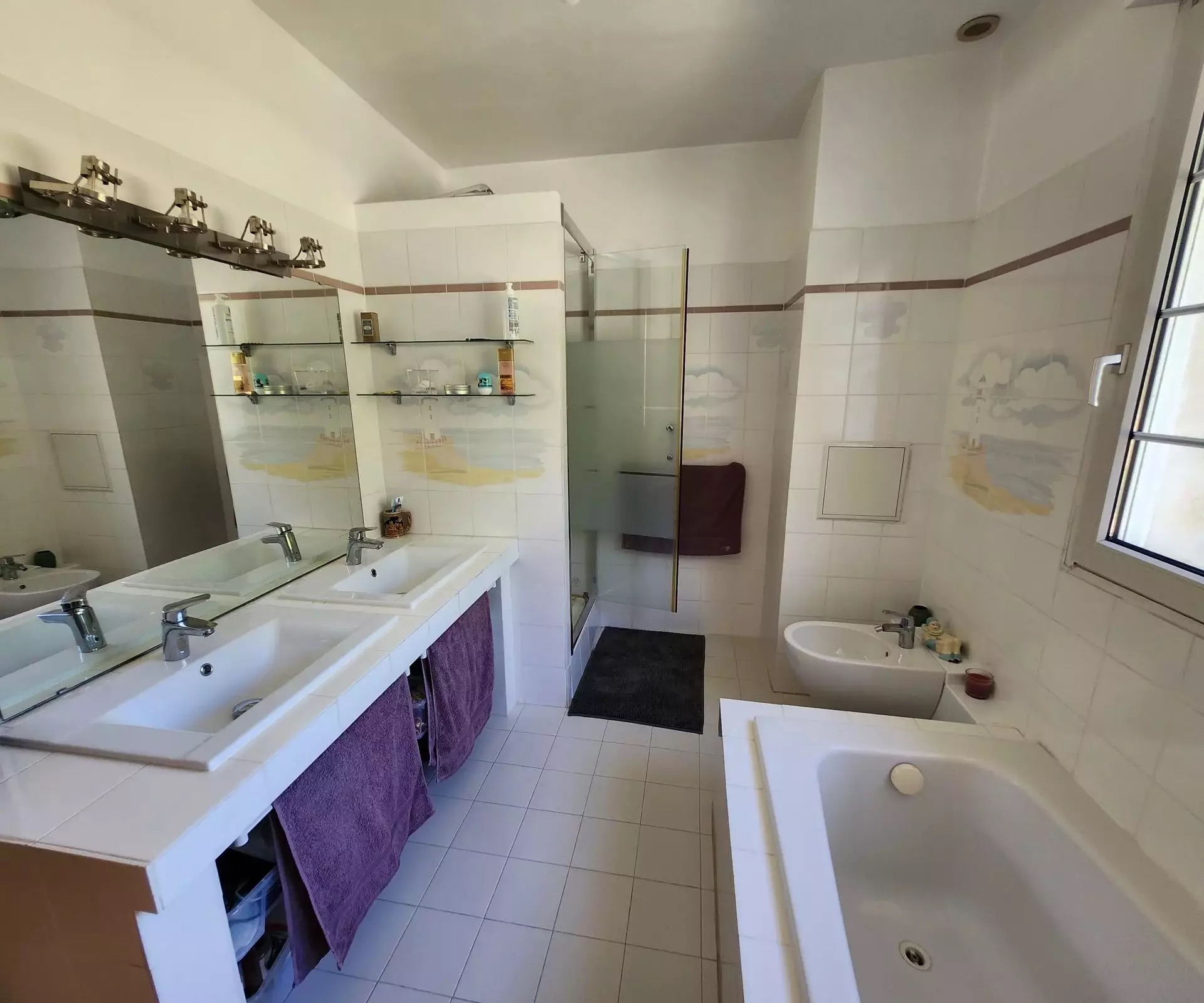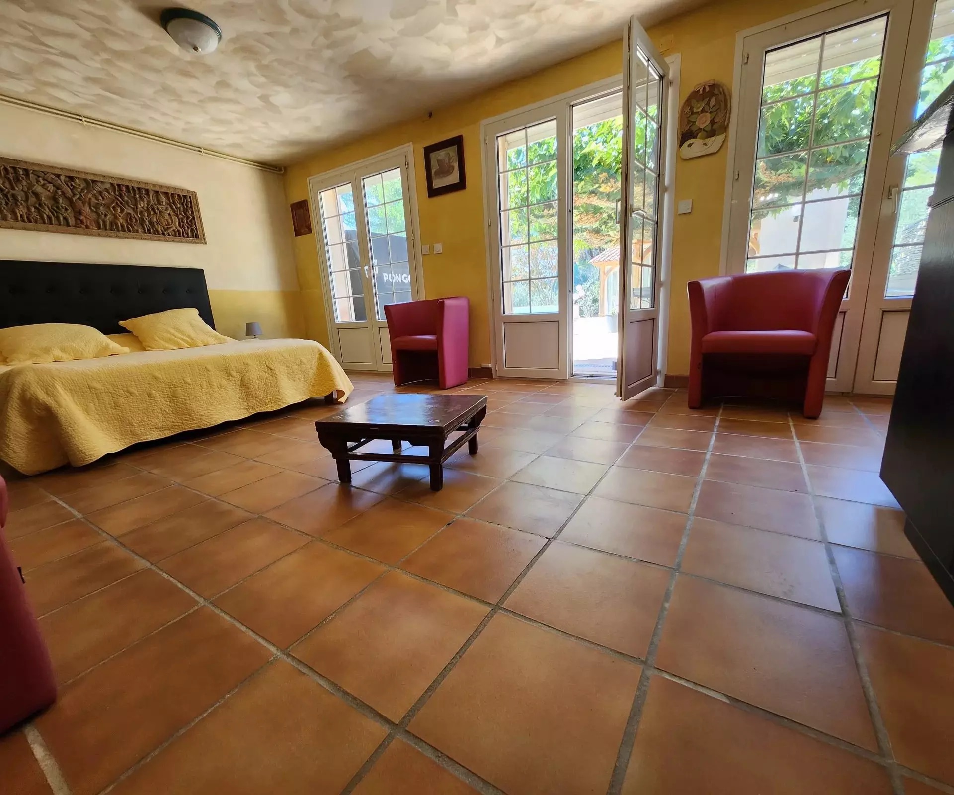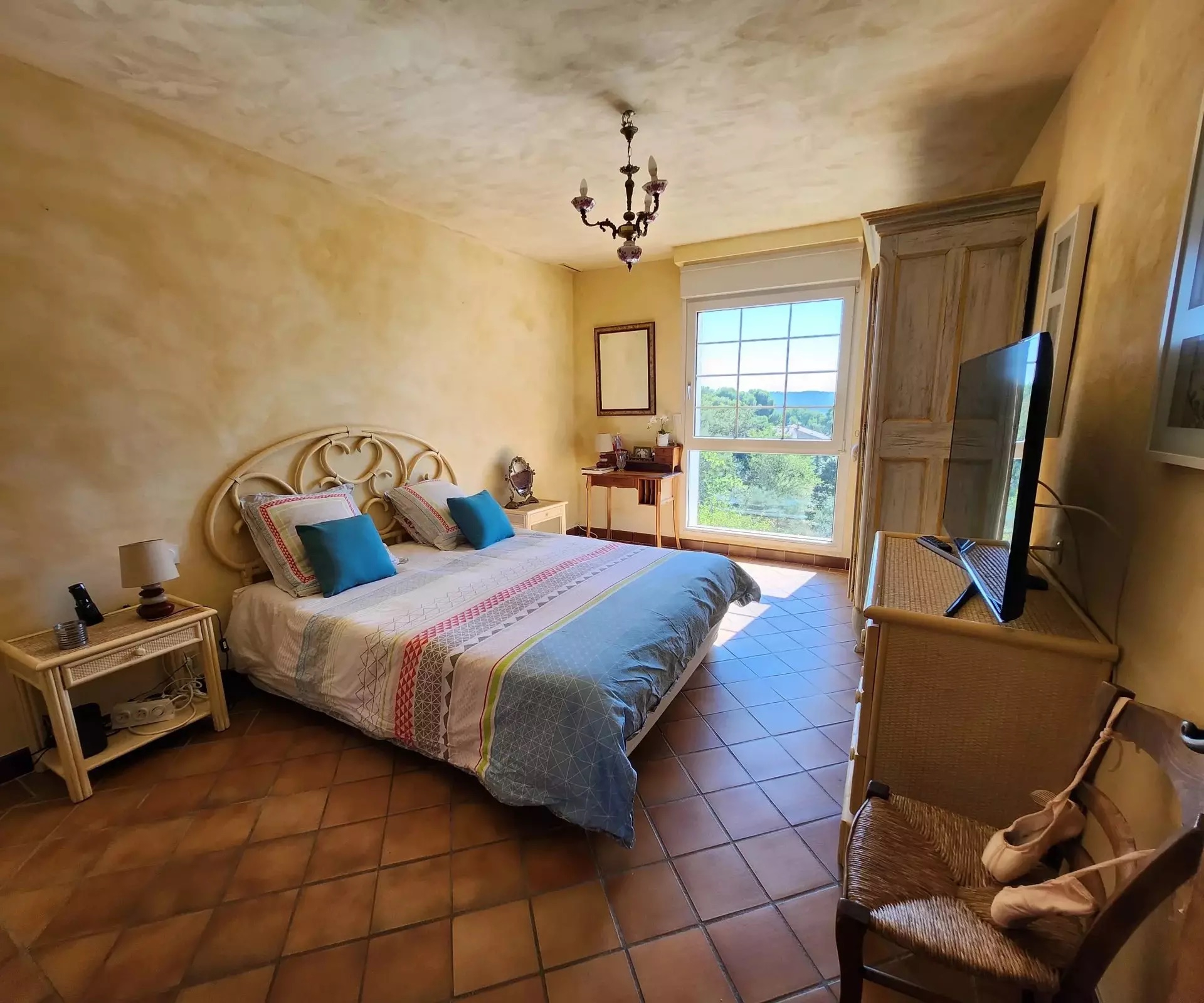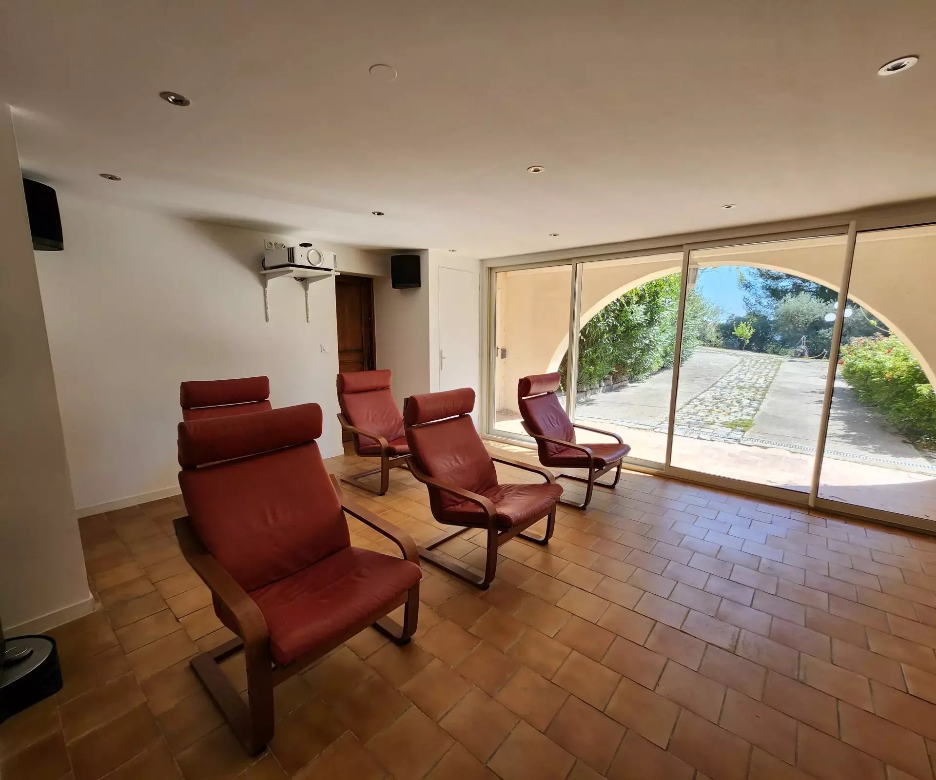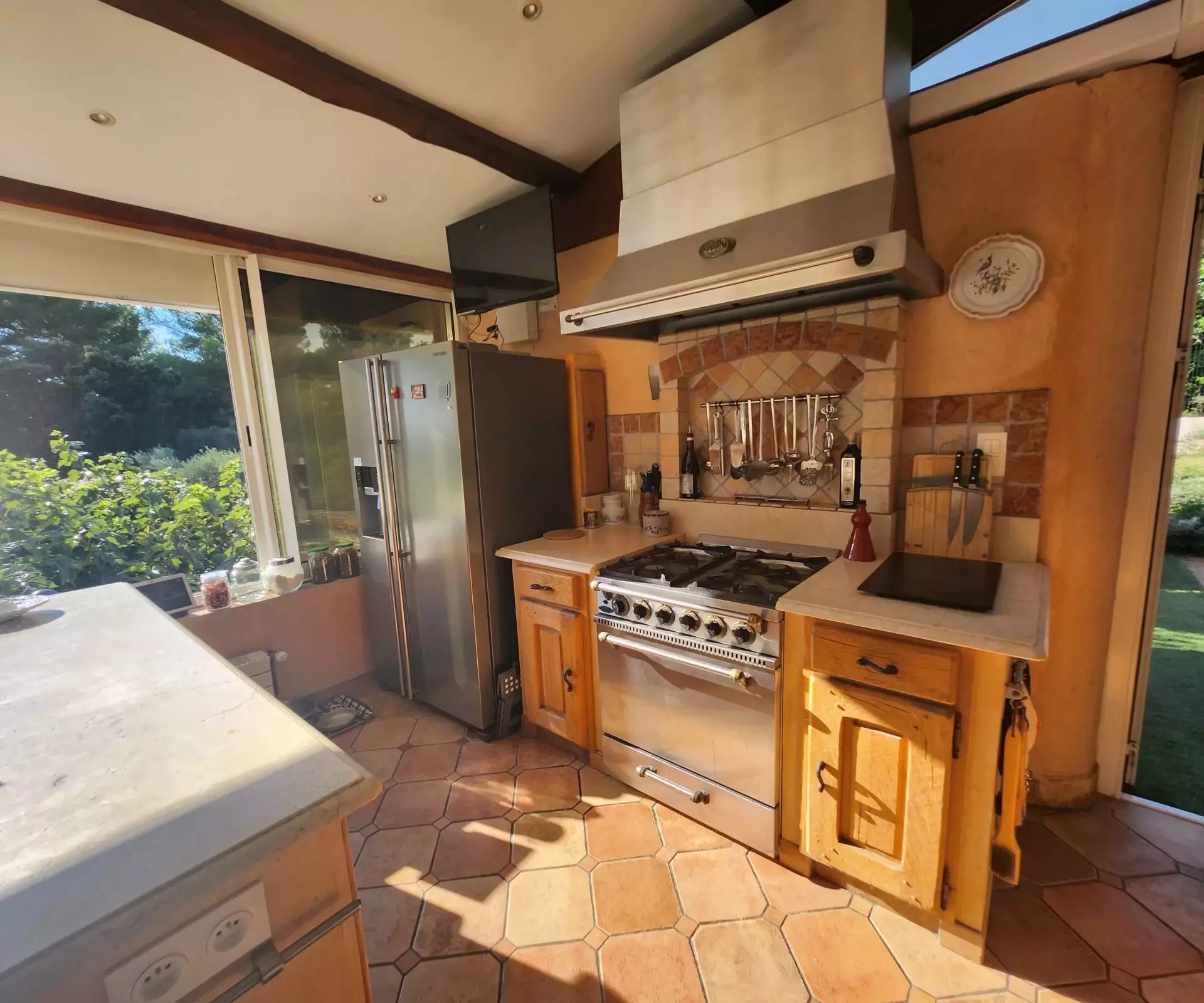 Nestled in a natural setting, you’ll be seduced by the surroundings, the spacious rooms and the high ceilings. The many windows give you a view of the green spaces, the hills and a glimpse of the remains of “Chateau Le Castellas”.