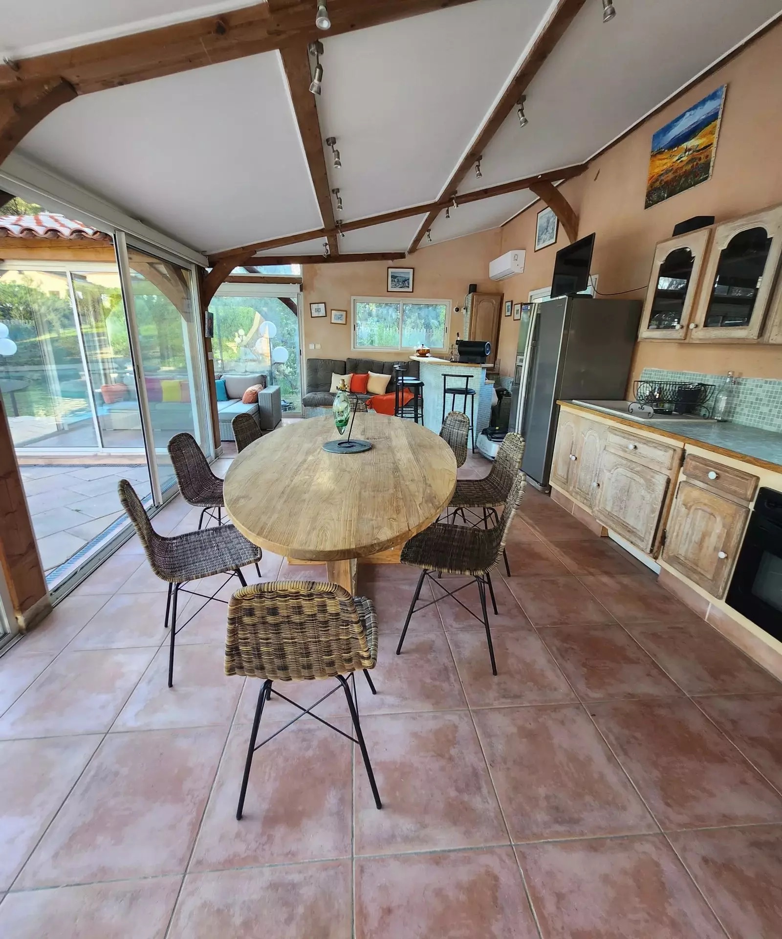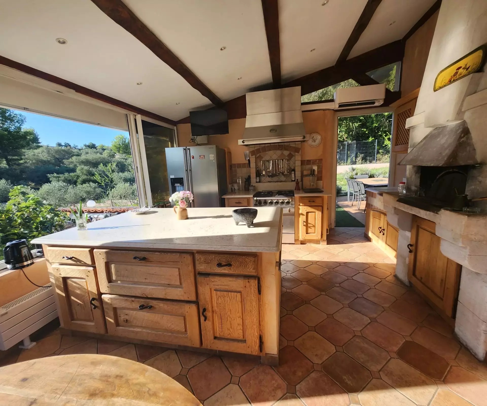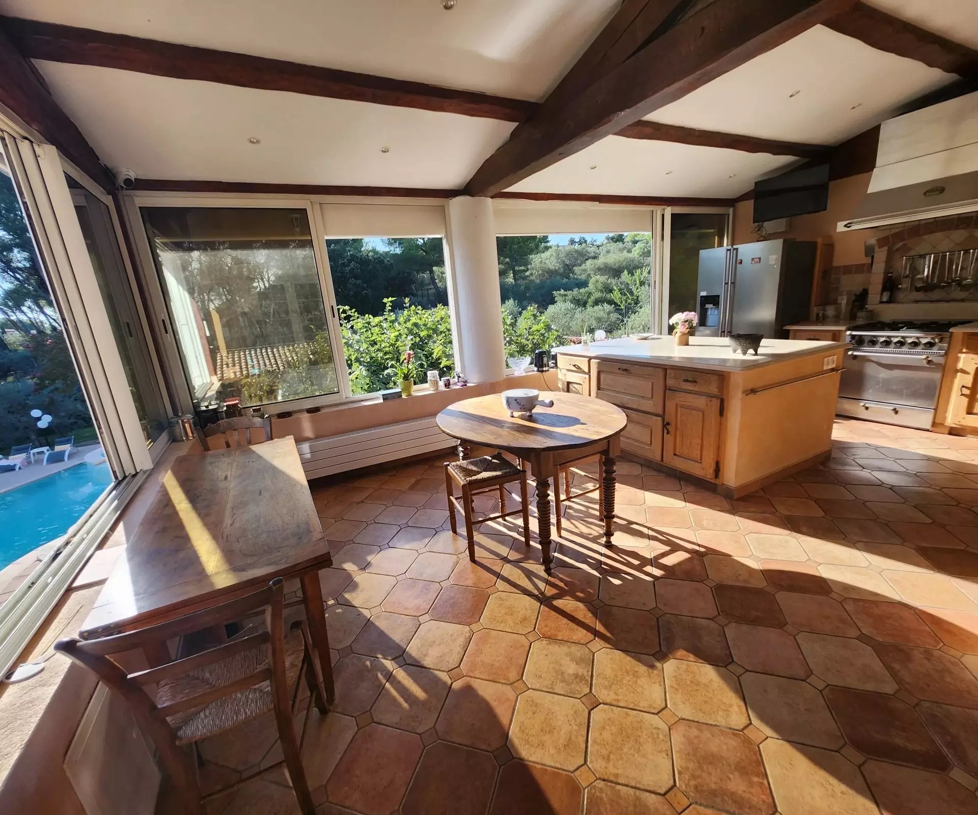 A large air-conditioned 40 m2 pool-house with its kitchen opening onto the dining room and panoramic view of the wonderful, very large lagoon pool with its beach and rock. The pool is heated by its own heat pump.
