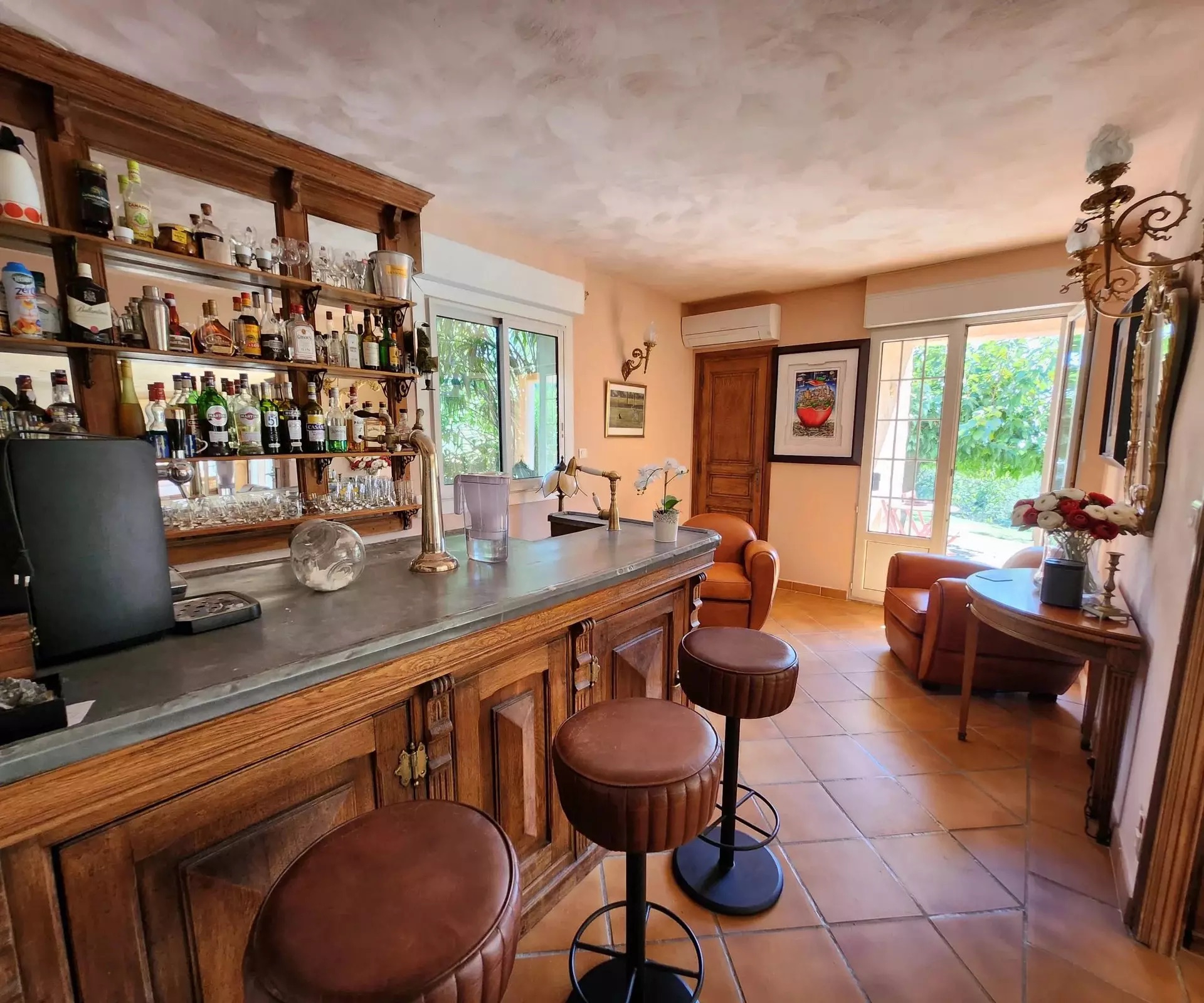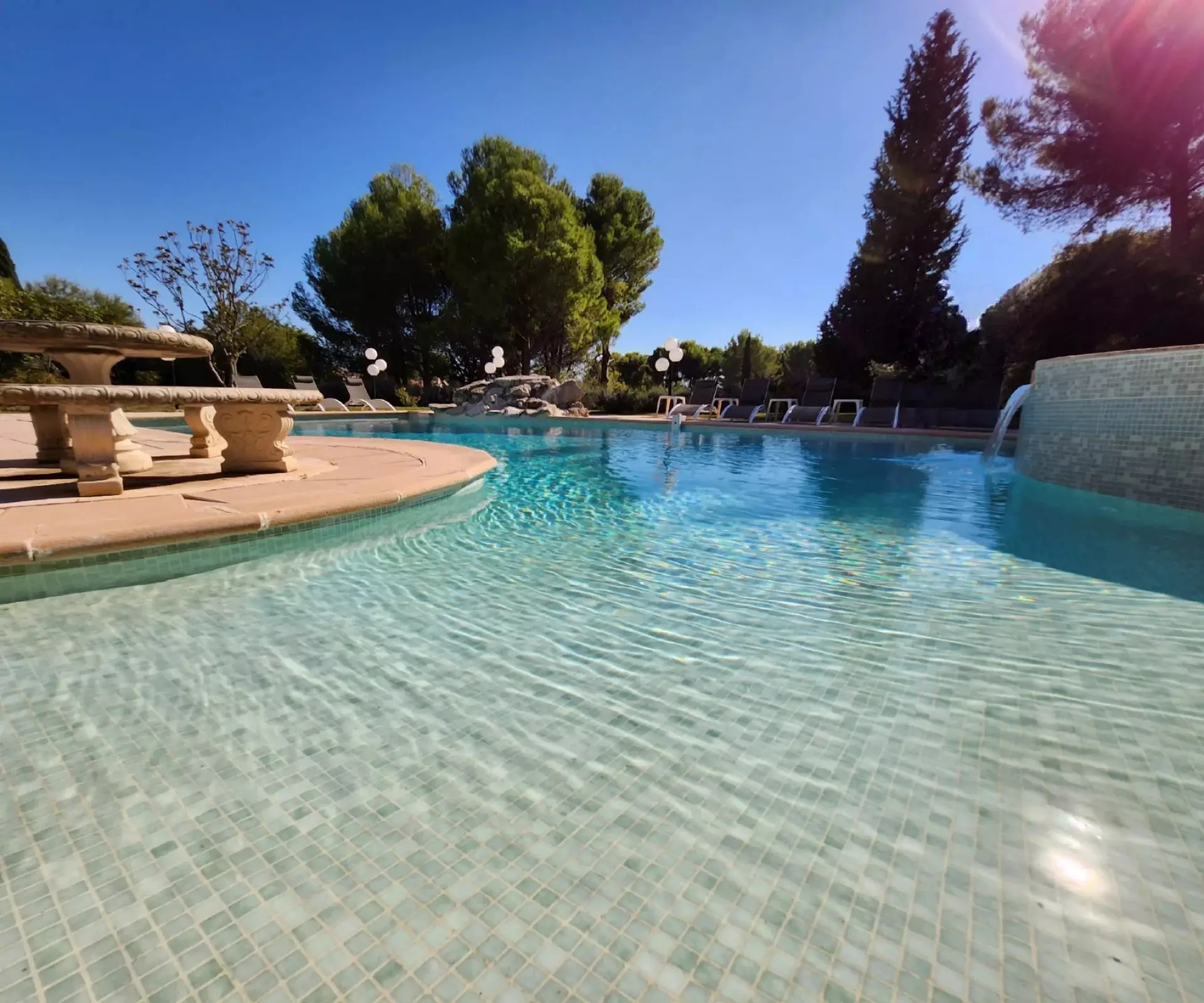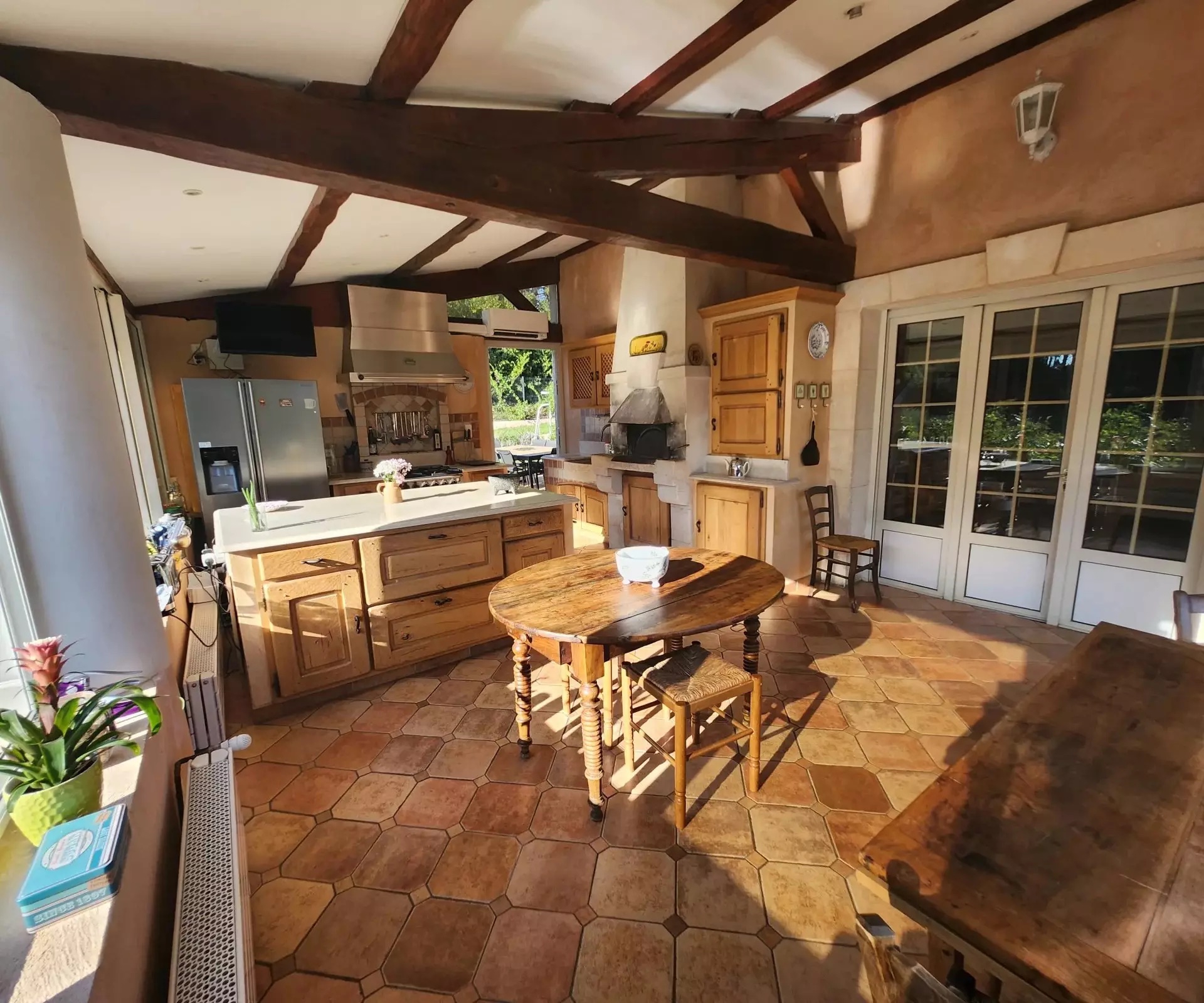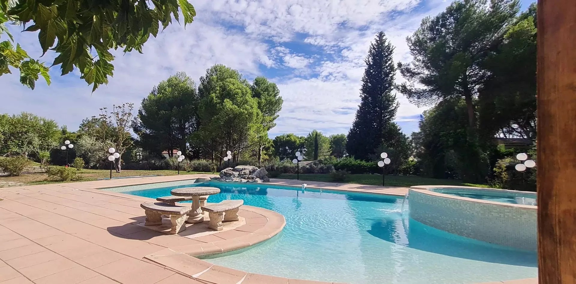 A large air-conditioned 40 m2 pool-house with its kitchen opening onto the dining room and panoramic view of the wonderful, very large lagoon pool with its beach and rock. The pool is heated by its own heat pump.