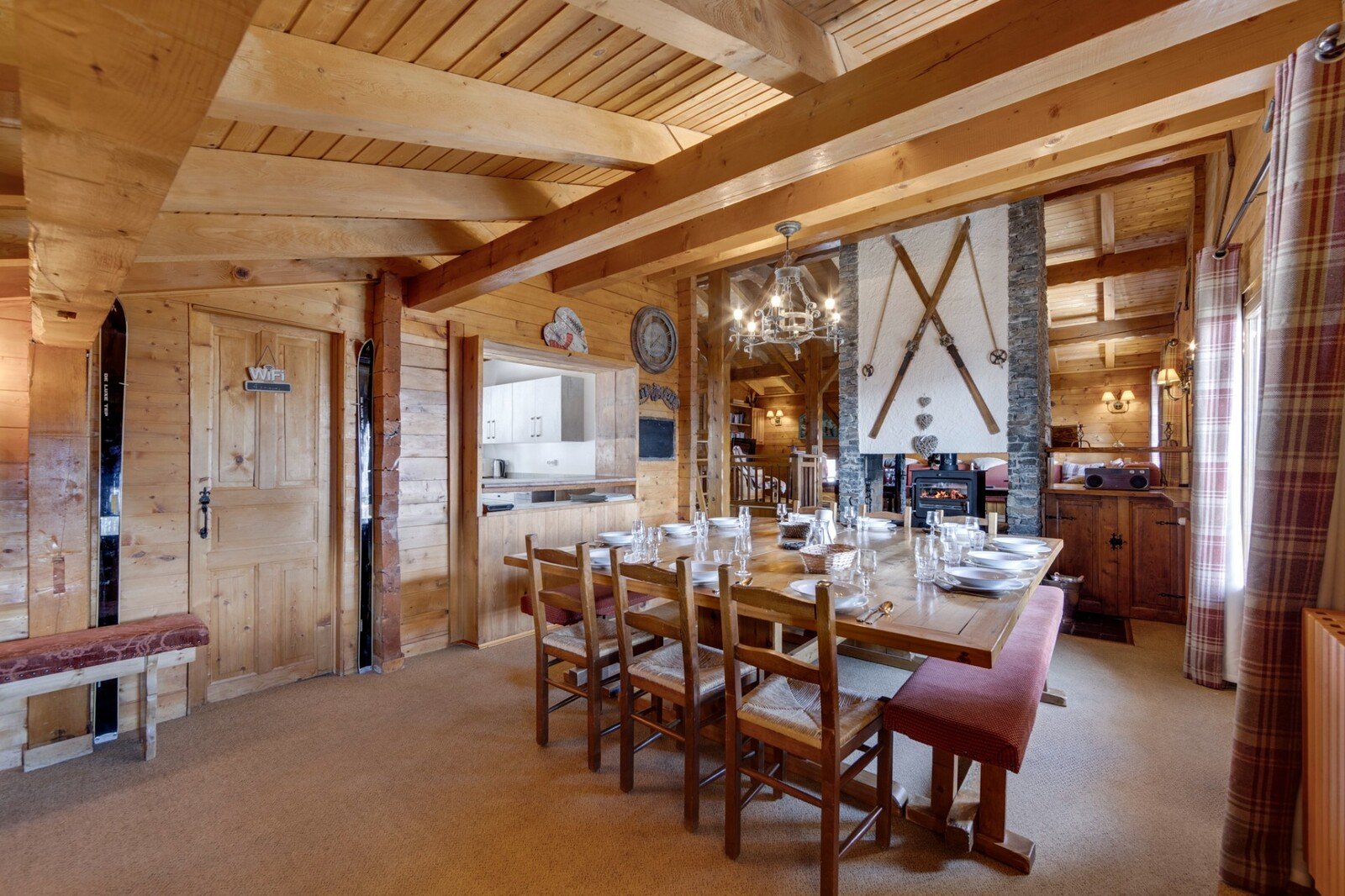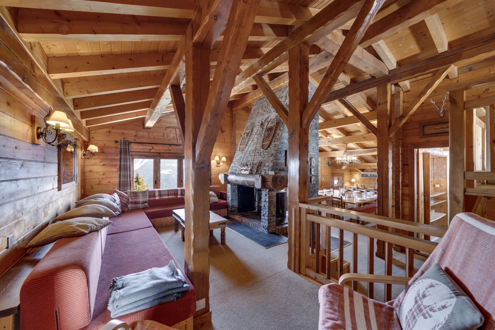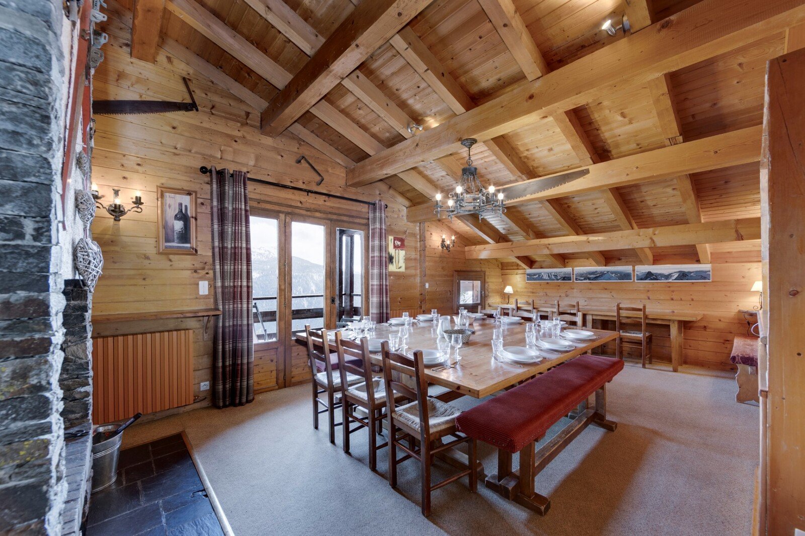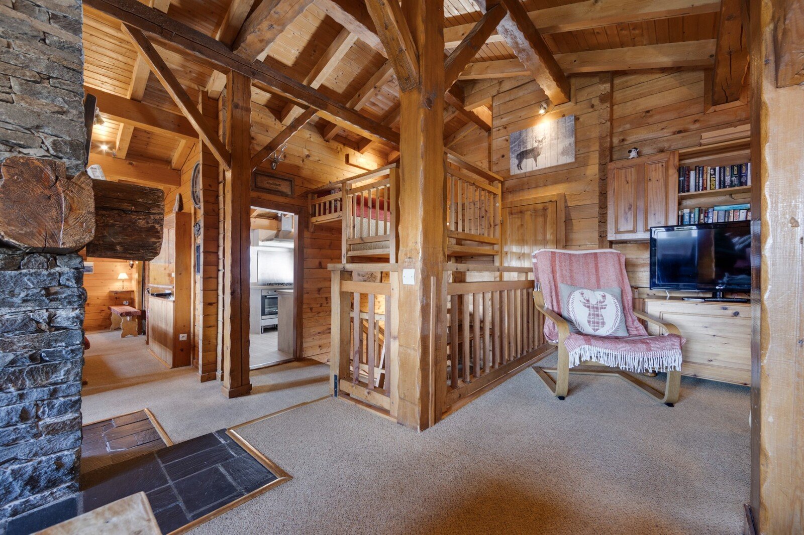 Built over three floors, this generously proportioned chalet can accommodate up to 16 people. The top floor is home to a spectacular living area under the rafters, bathed in natural light. A cosy lounge with TV area is arranged around a majestic central stone fireplace, the heart of the house, and extends its cosy ambience to a welcoming dining room. The recently fitted, functional kitchen blends harmoniously into this convivial space. The whole opens onto a large south-facing balcony, offering a breathtaking panoramic view over the valley.