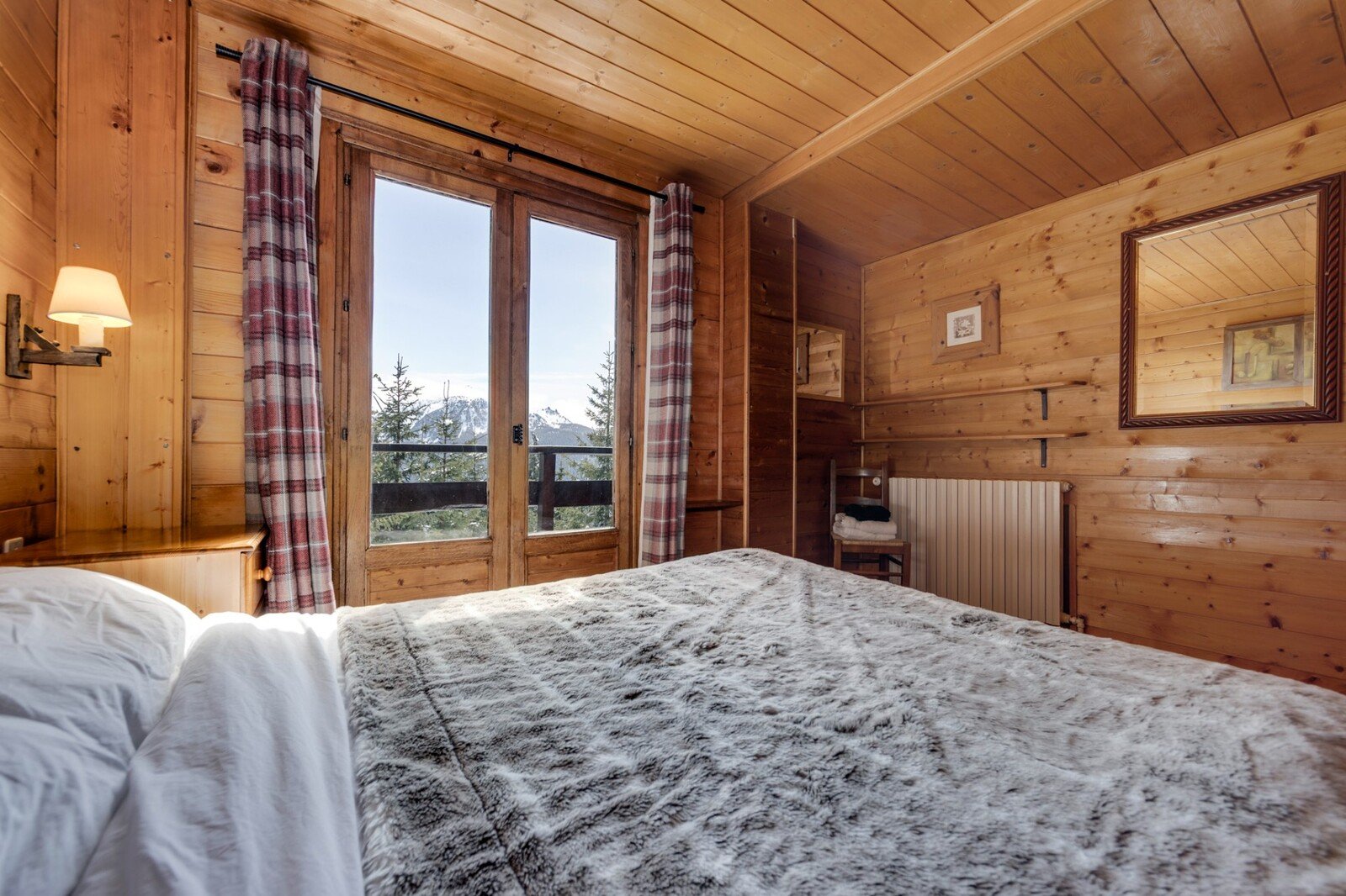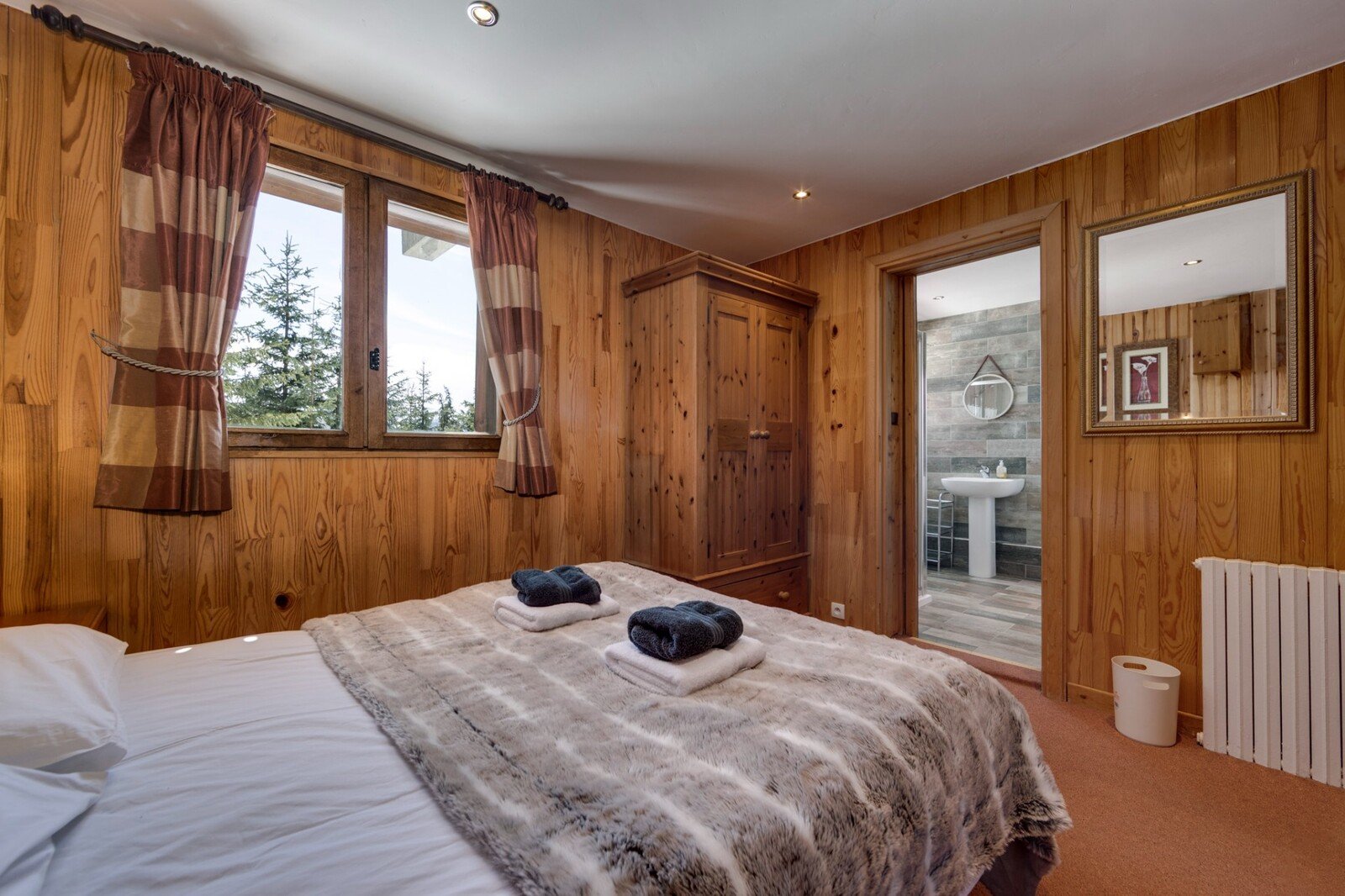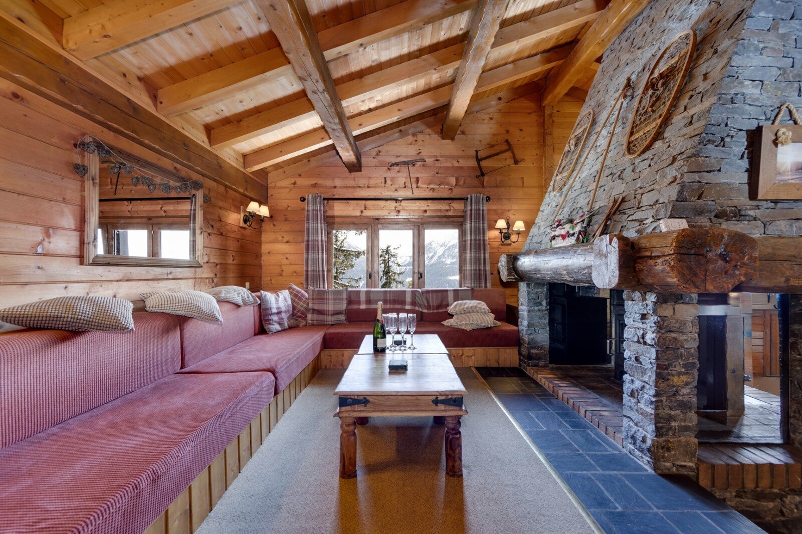 Built over three floors, this generously proportioned chalet can accommodate up to 16 people. The top floor is home to a spectacular living area under the rafters, bathed in natural light. A cosy lounge with TV area is arranged around a majestic central stone fireplace, the heart of the house, and extends its cosy ambience to a welcoming dining room. The recently fitted, functional kitchen blends harmoniously into this convivial space. The whole opens onto a large south-facing balcony, offering a breathtaking panoramic view over the valley.