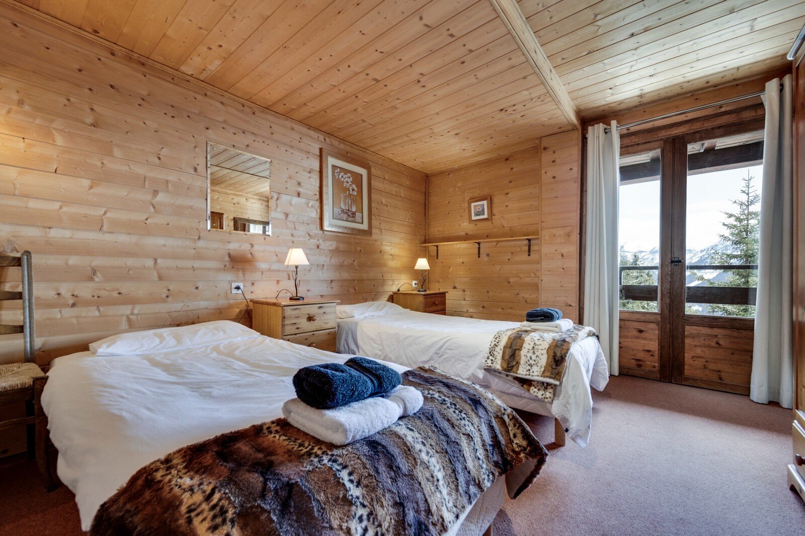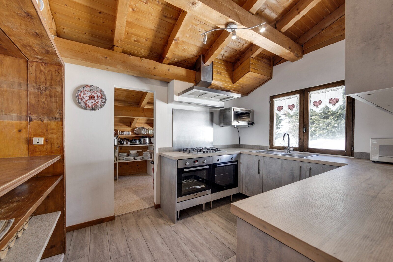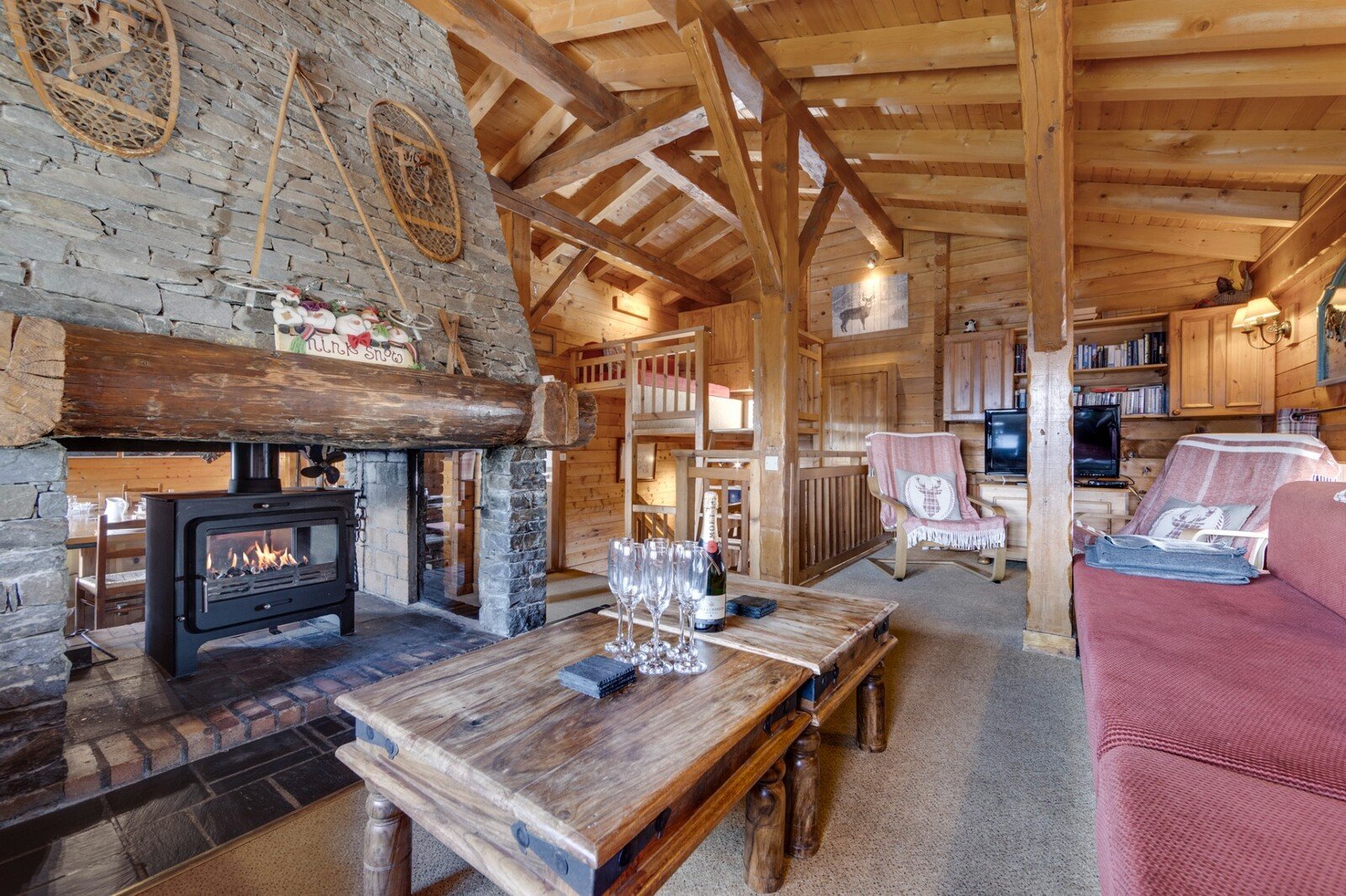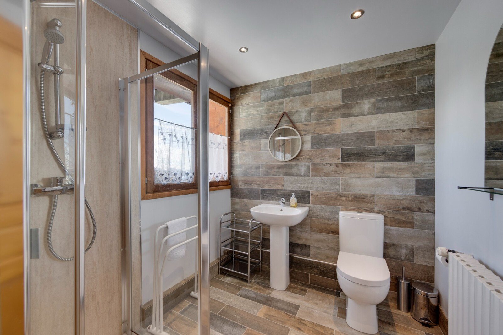 Built over three floors, this generously proportioned chalet can accommodate up to 16 people. The top floor is home to a spectacular living area under the rafters, bathed in natural light. A cosy lounge with TV area is arranged around a majestic central stone fireplace, the heart of the house, and extends its cosy ambience to a welcoming dining room. The recently fitted, functional kitchen blends harmoniously into this convivial space. The whole opens onto a large south-facing balcony, offering a breathtaking panoramic view over the valley.