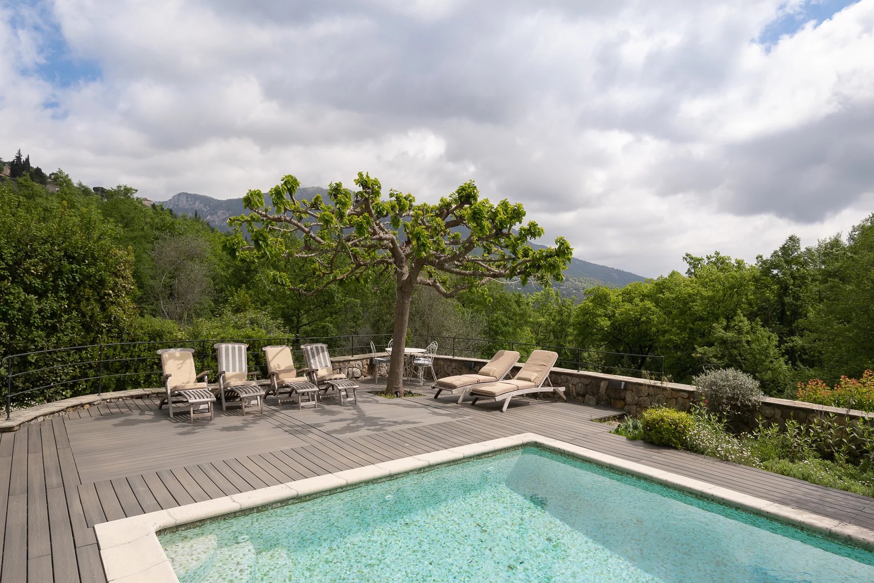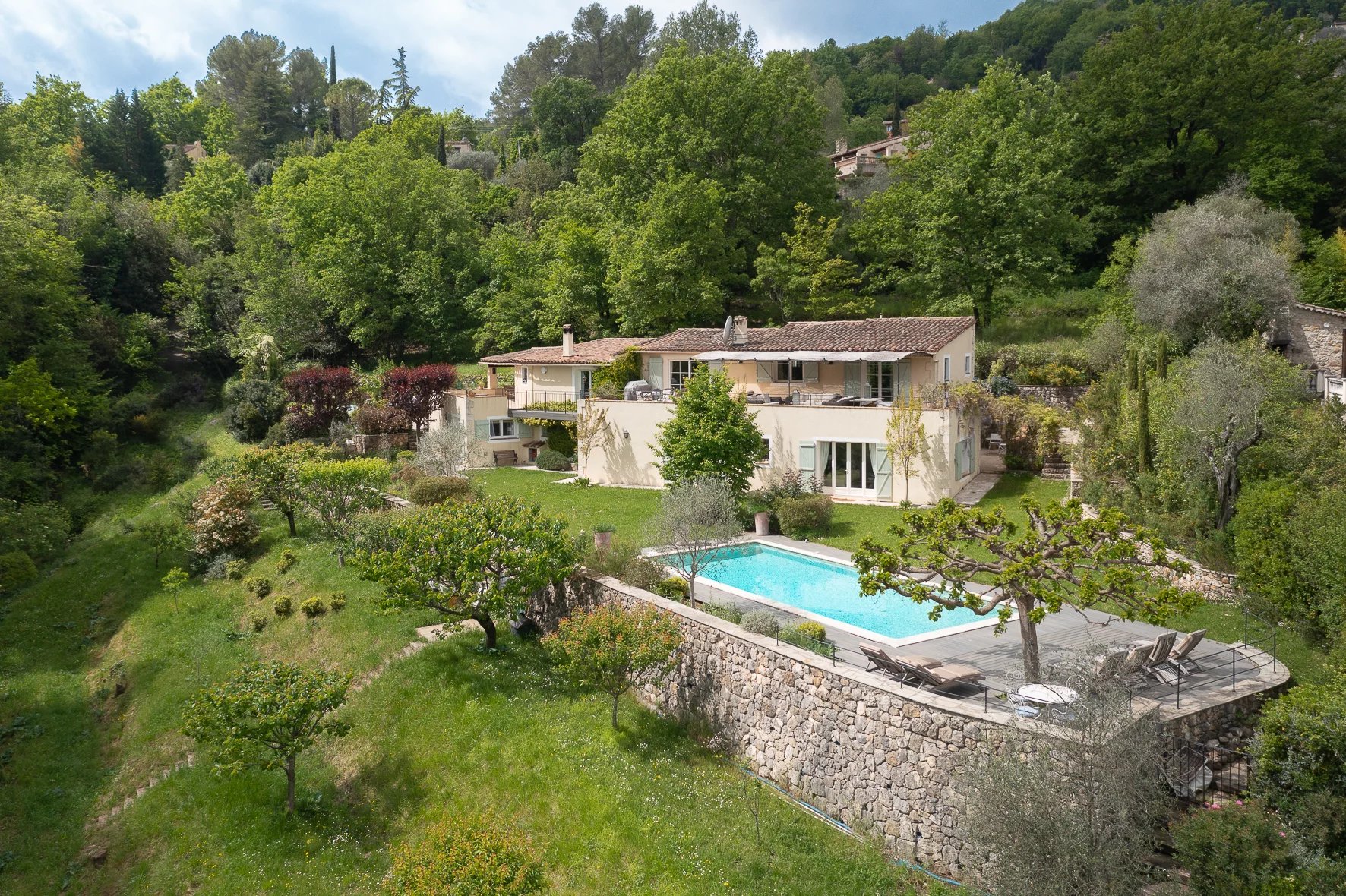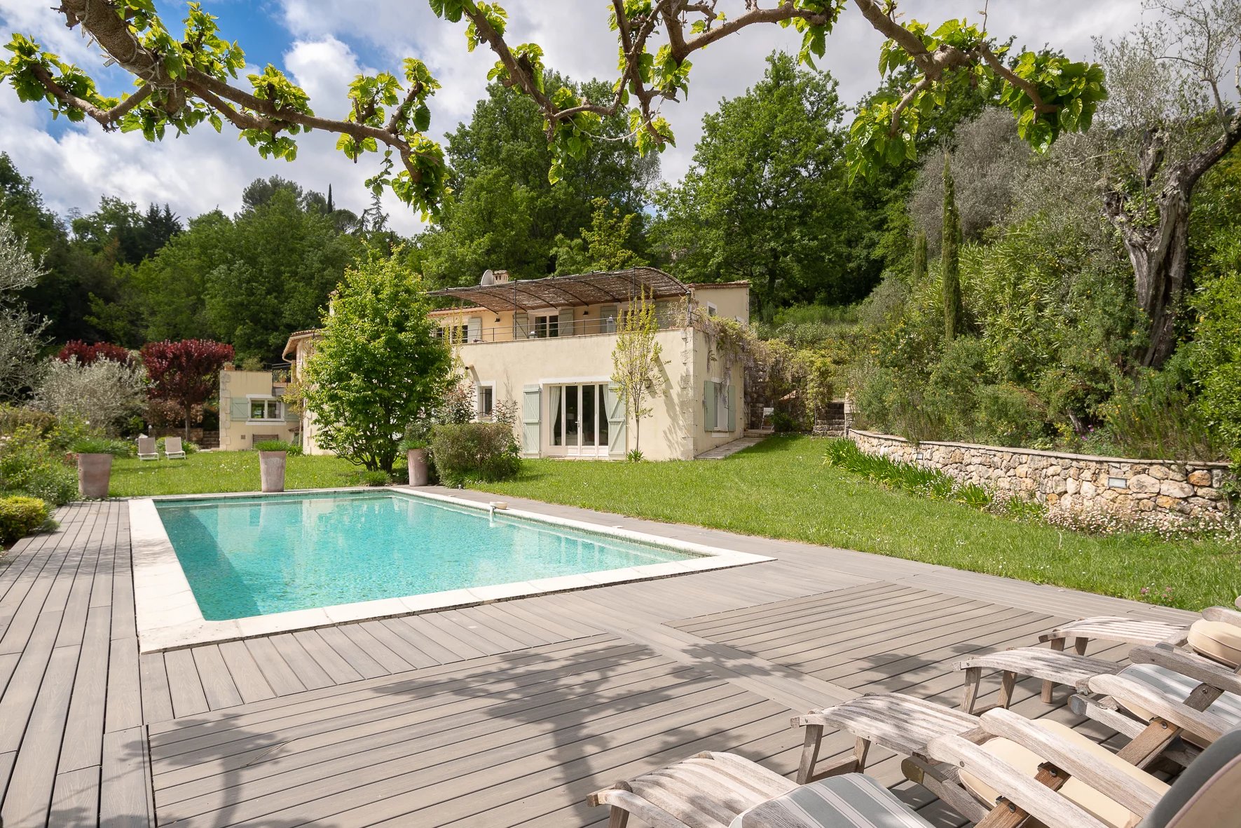 This beautiful family home has breathtaking views of the hills of Bar sur Loup. It is nestled within a gorgeous garden offering complete peace and serenity only 30 minutes from Cannes and 12 minutes from Valbonne village.