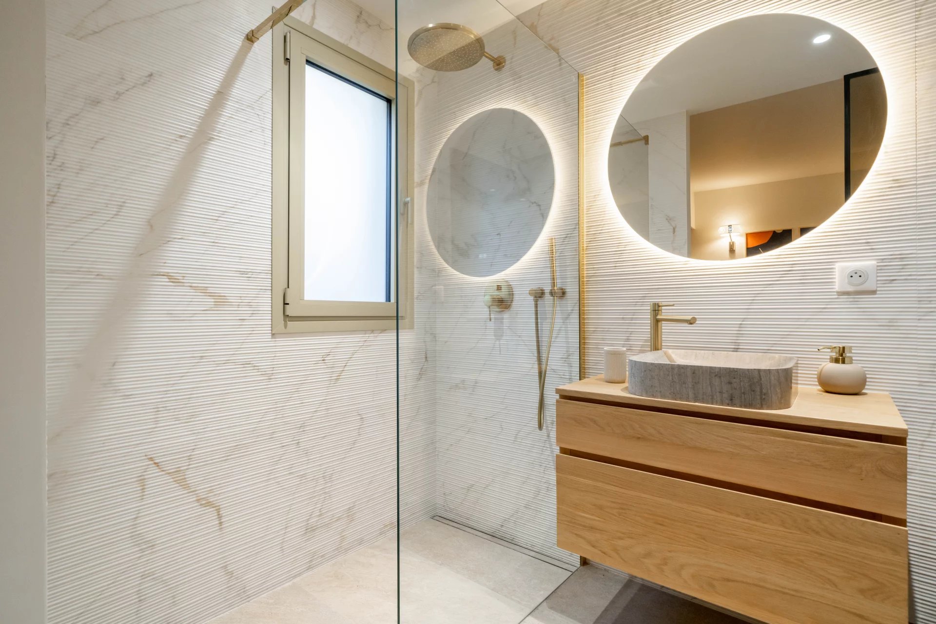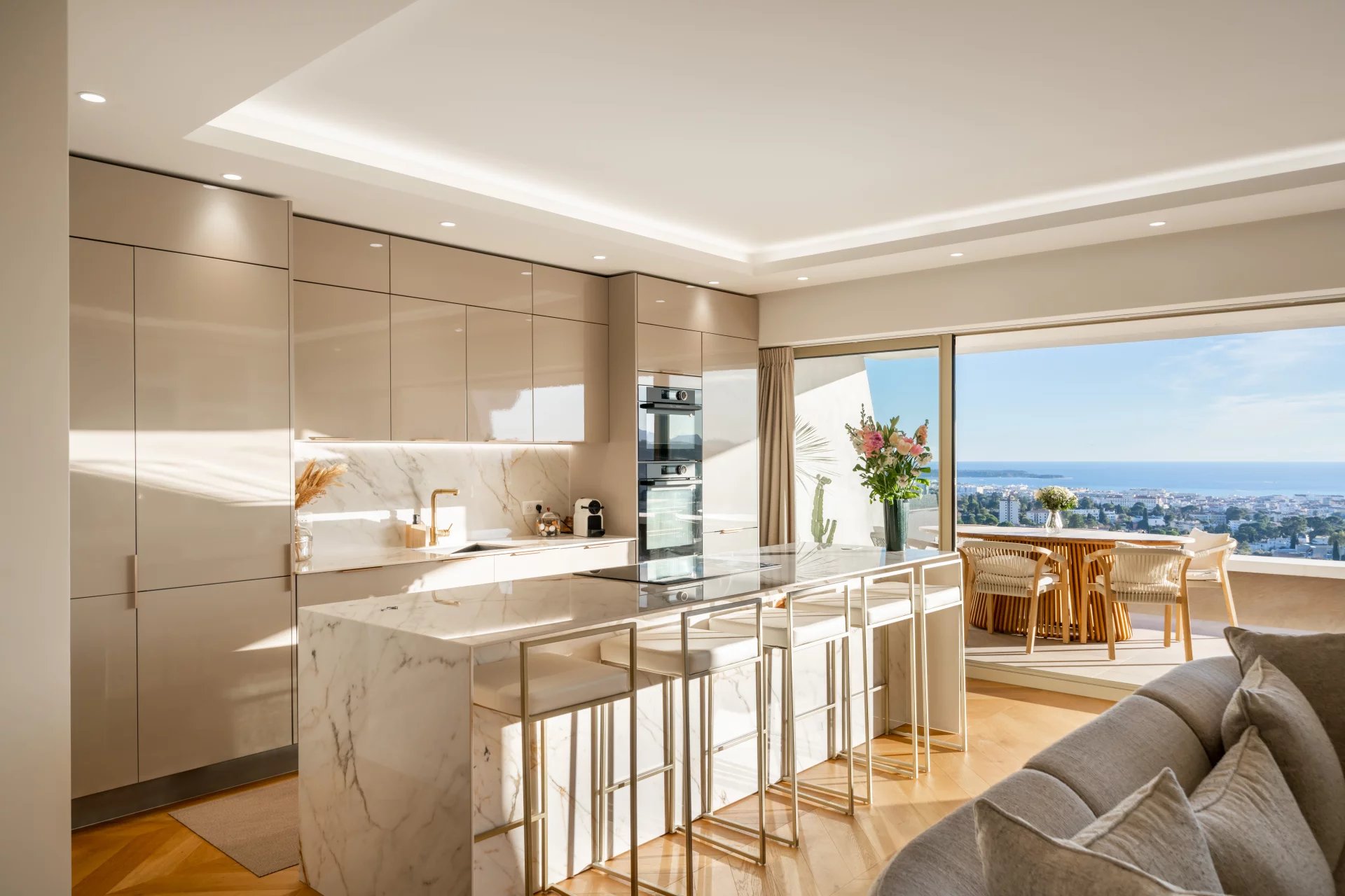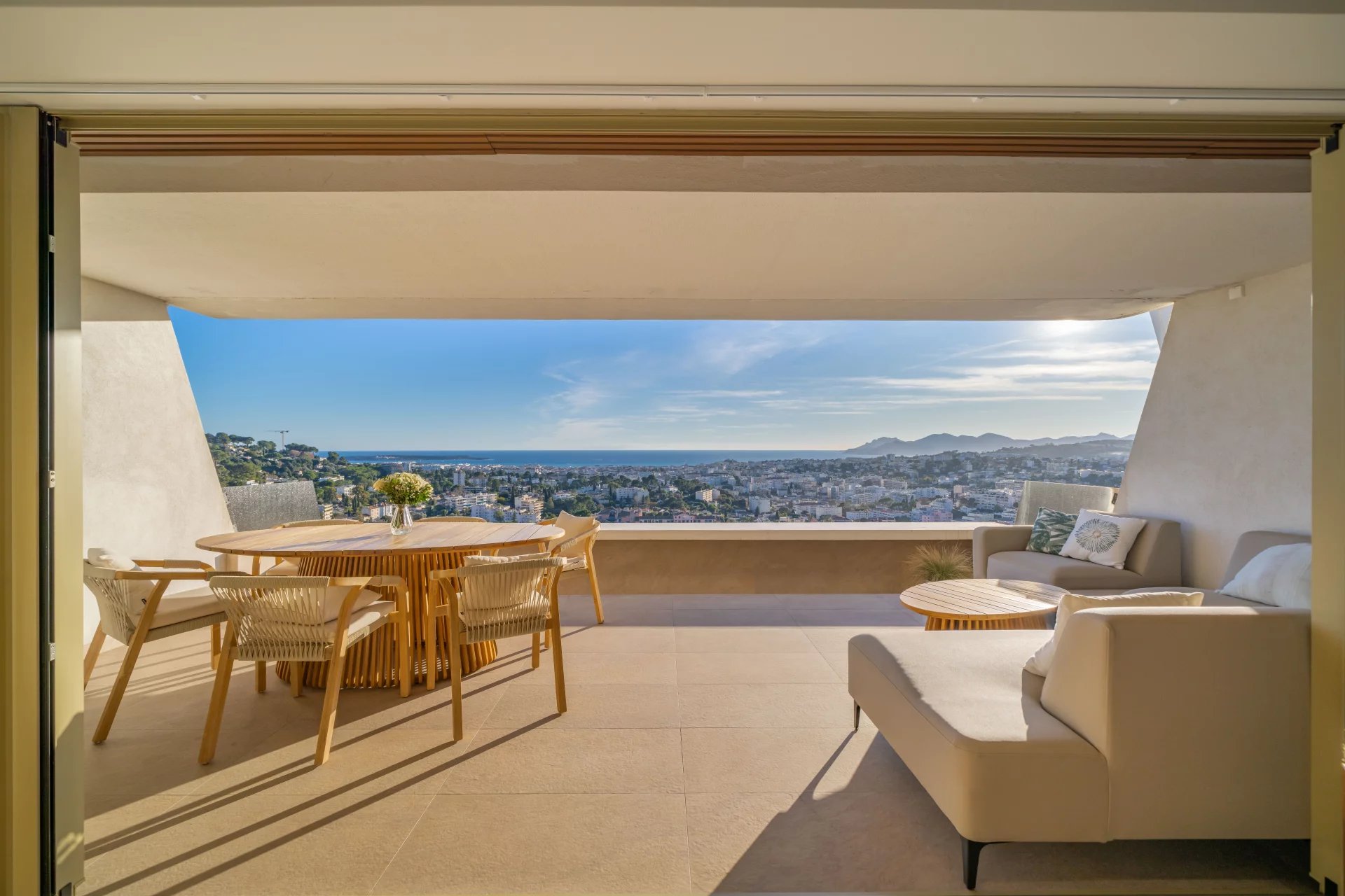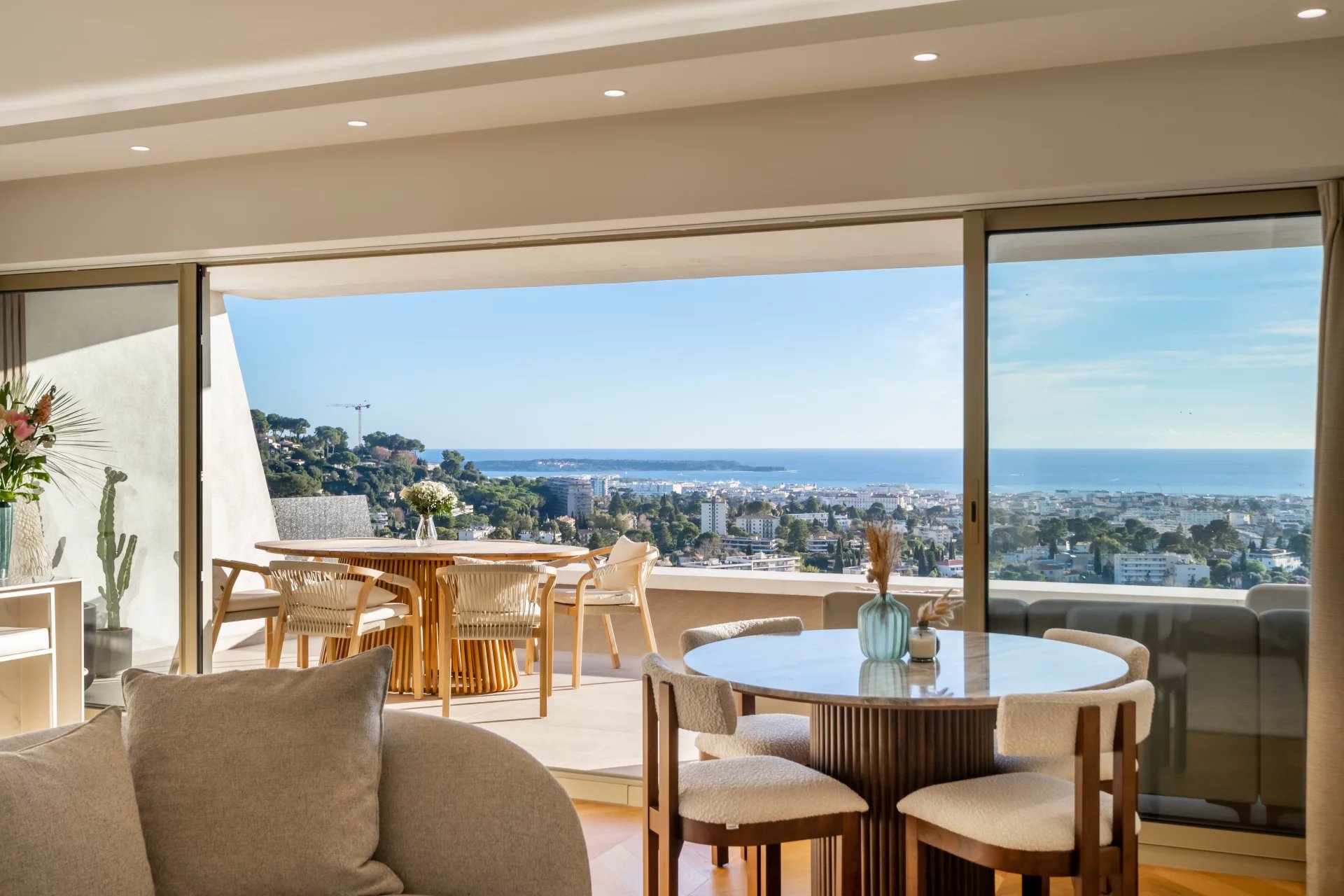 It comprises an entrance hall, a large bright living room with open kitchen, extended by a large south-facing terrace offering a magnificent panoramic view over the Bay of Cannes, three en suite bedrooms, and a guest toilet.