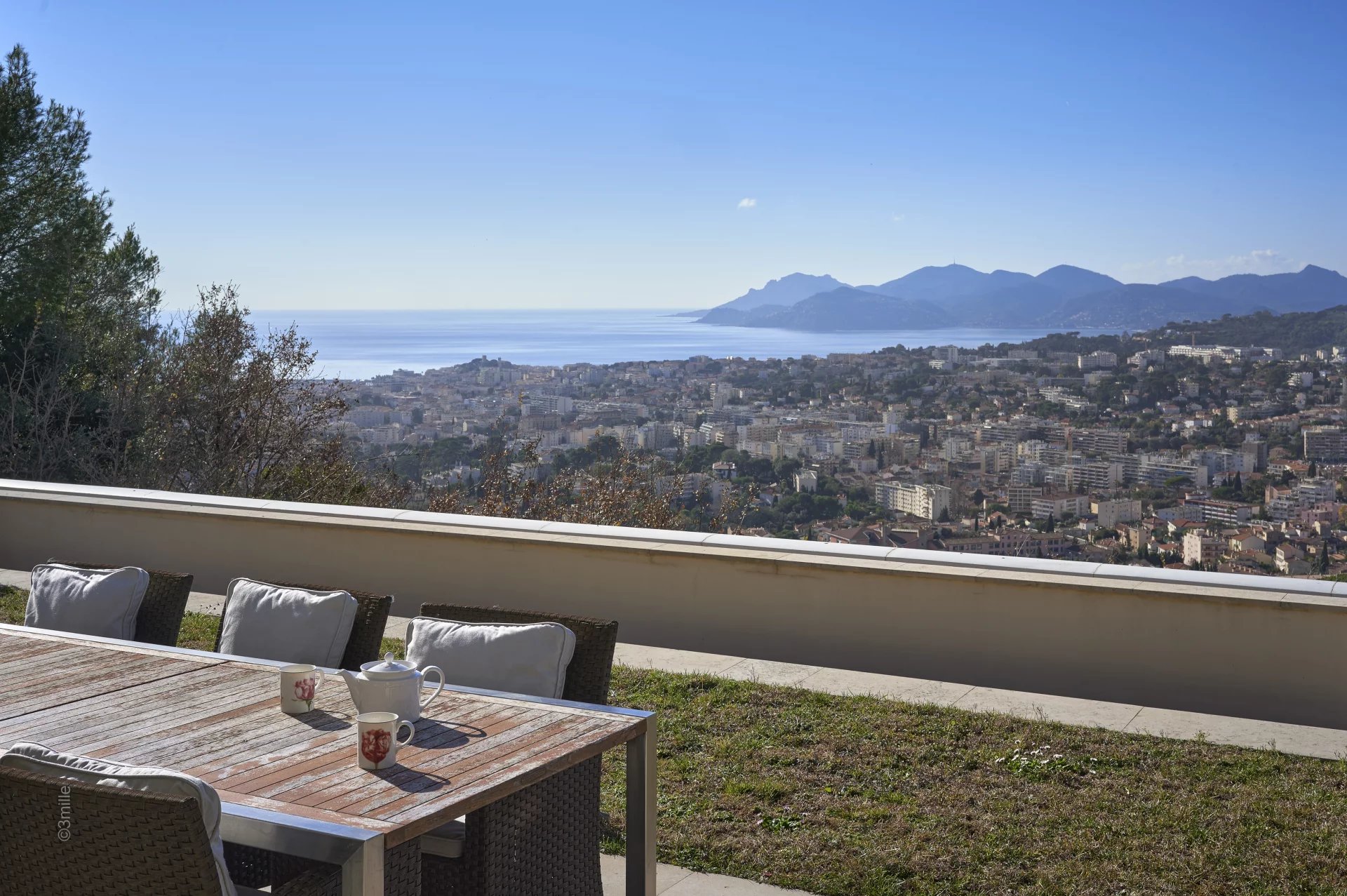 In a dominant position on the heights of Cannes and located in the heart of a closed domain, beautiful modern villa enjoying beautiful volumes as well as a panoramic view of the sea.