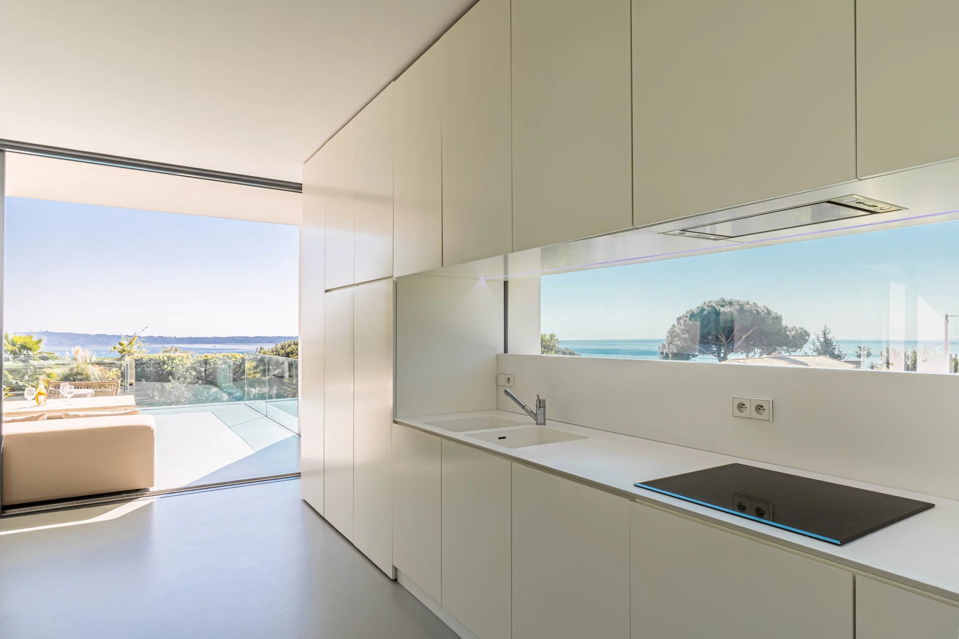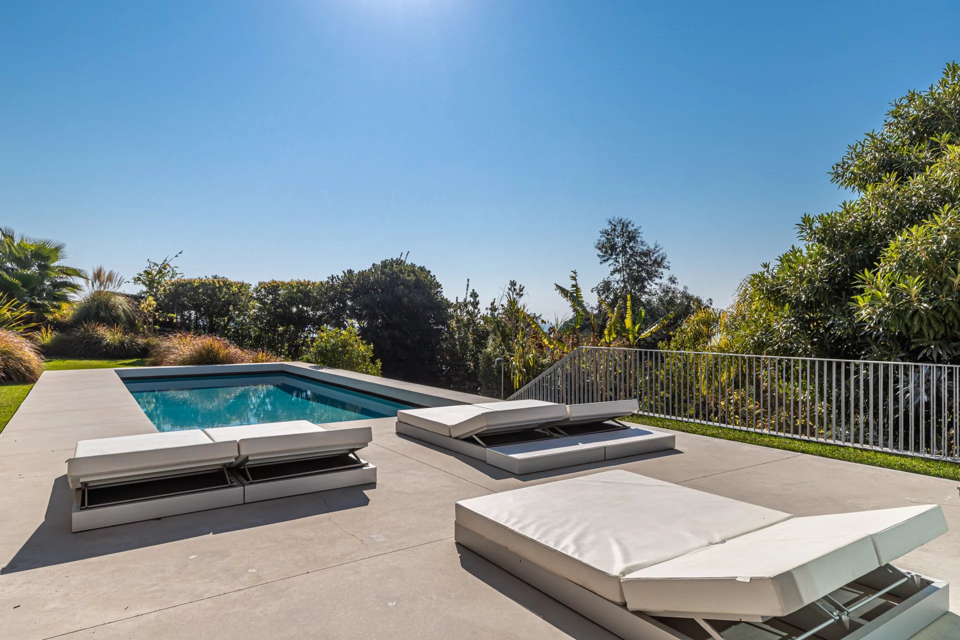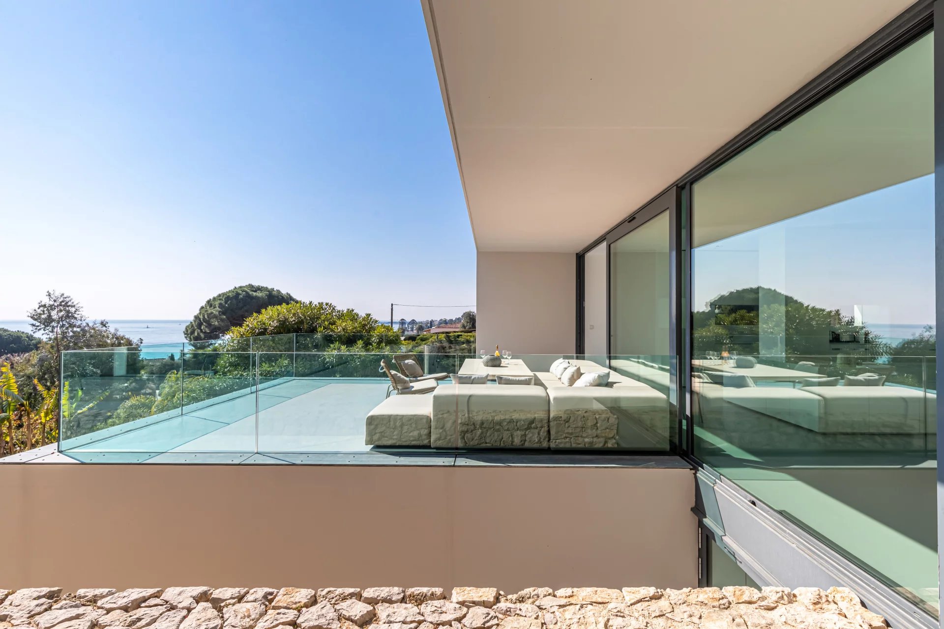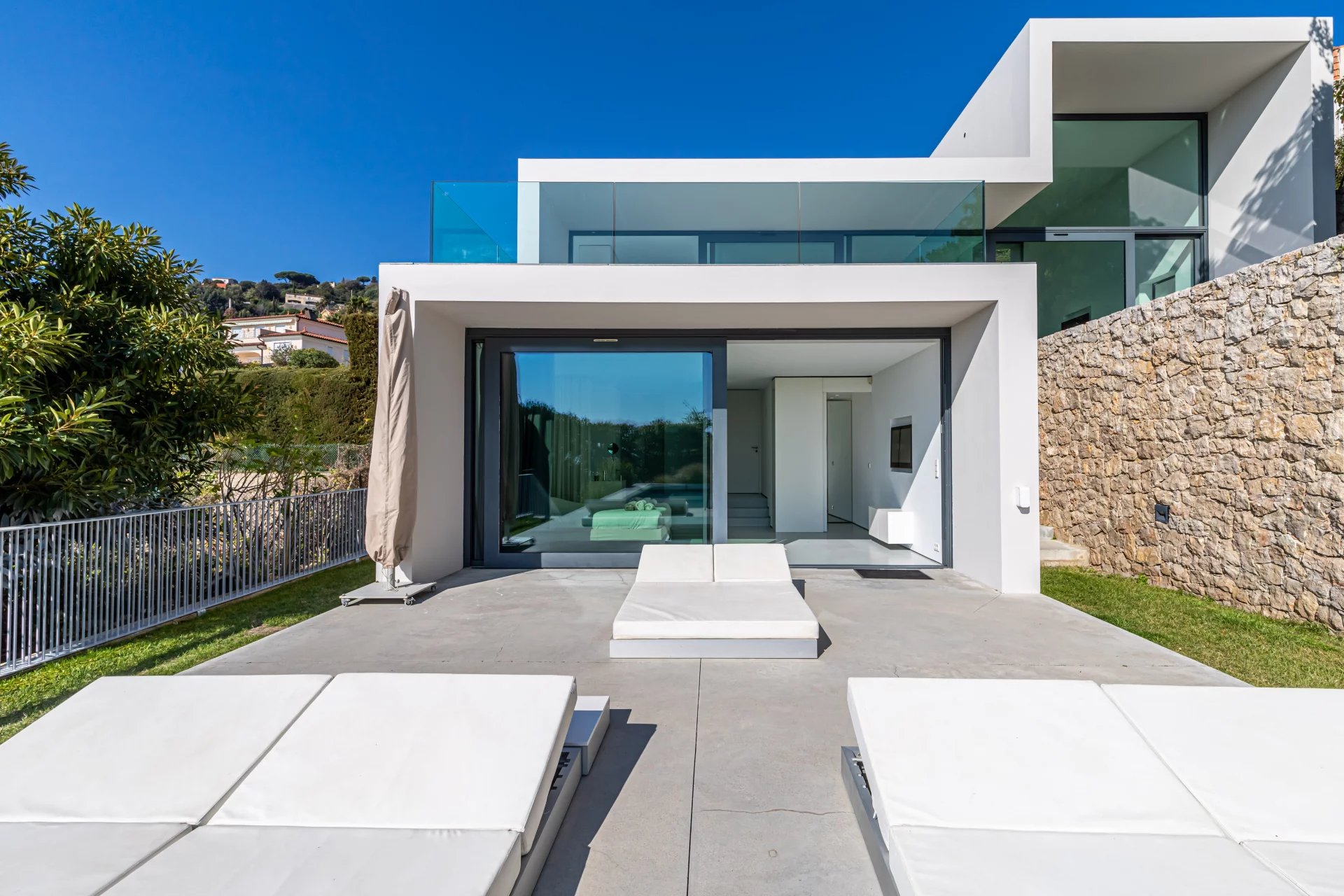 Golfe Juan: located in a residential area on the heights, recent contemporary villa with panoramic sea views from Cap d’Antibes to Lerins Islands of Cannes.