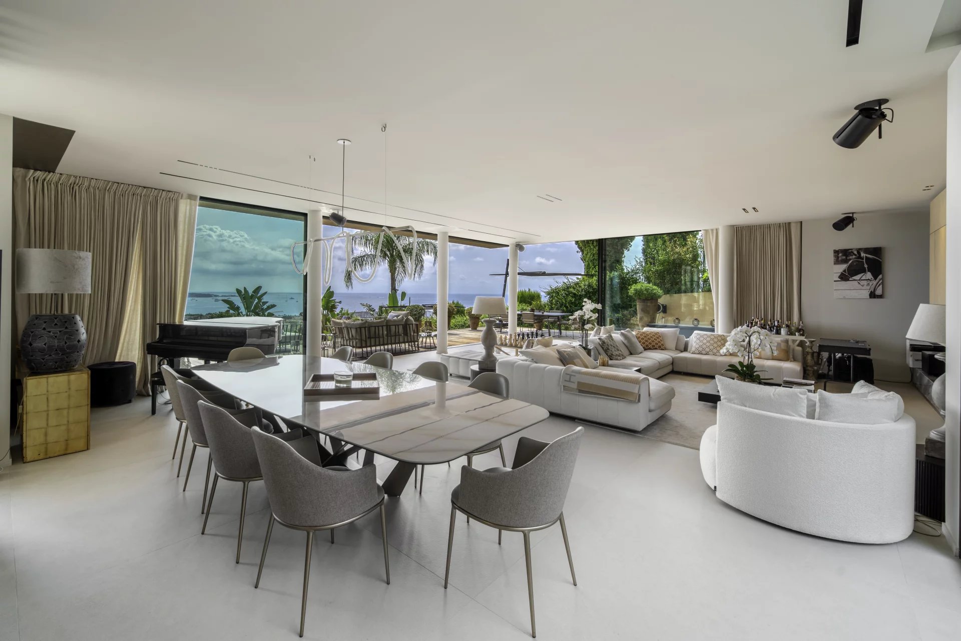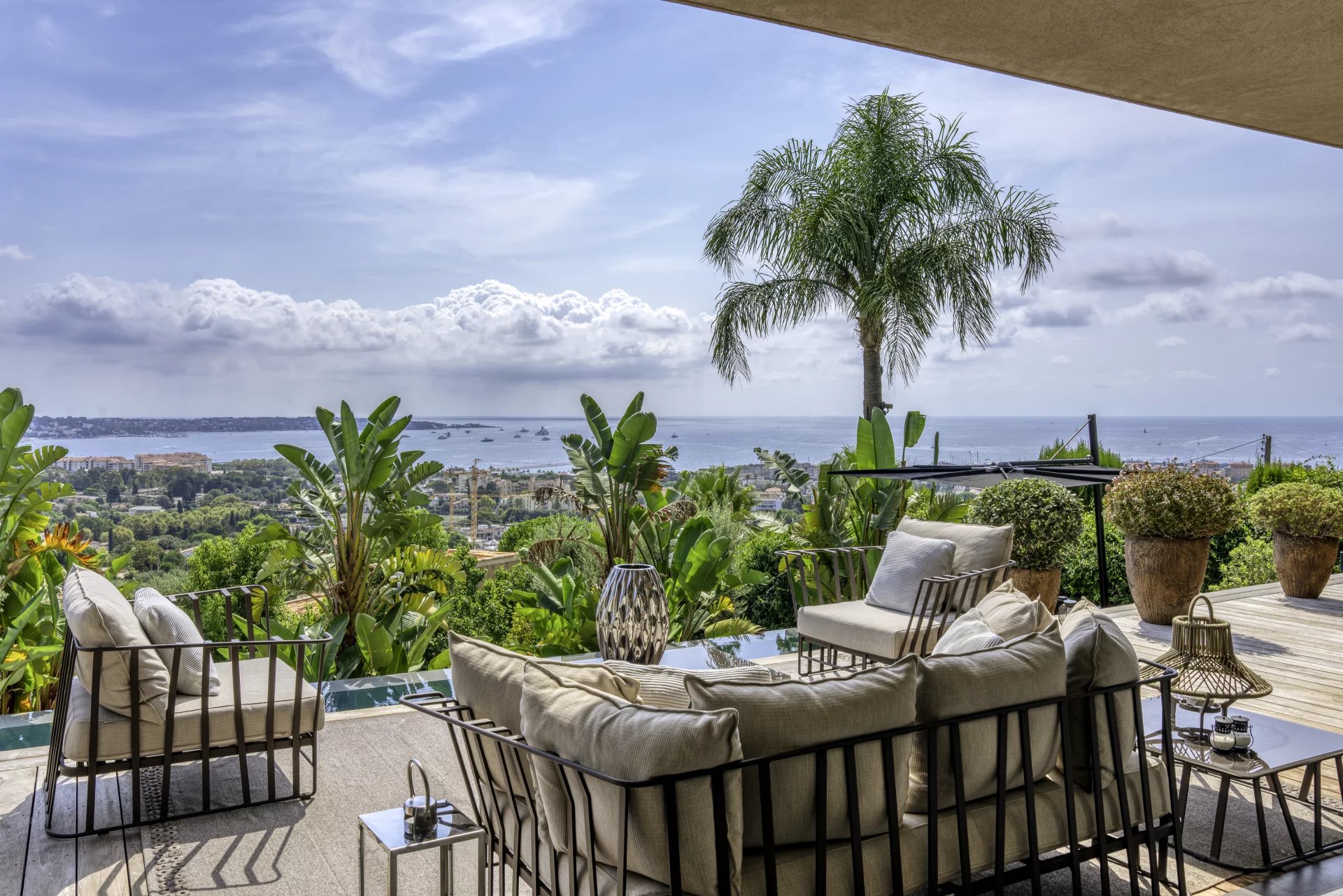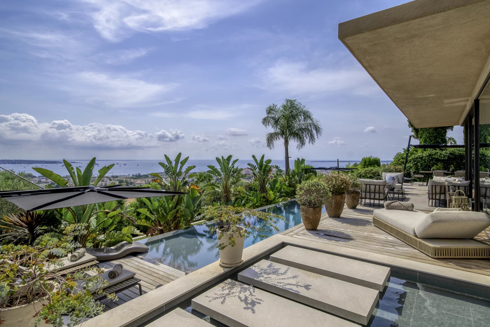 In a sought after and confidential residential area, nestled on the heights of Golfe Juan, a few minutes drive from Cannes and the beaches, this spectacular contemporary villa offers an exceptional living environment, combining absolute calm, brightness and panoramic sea views.