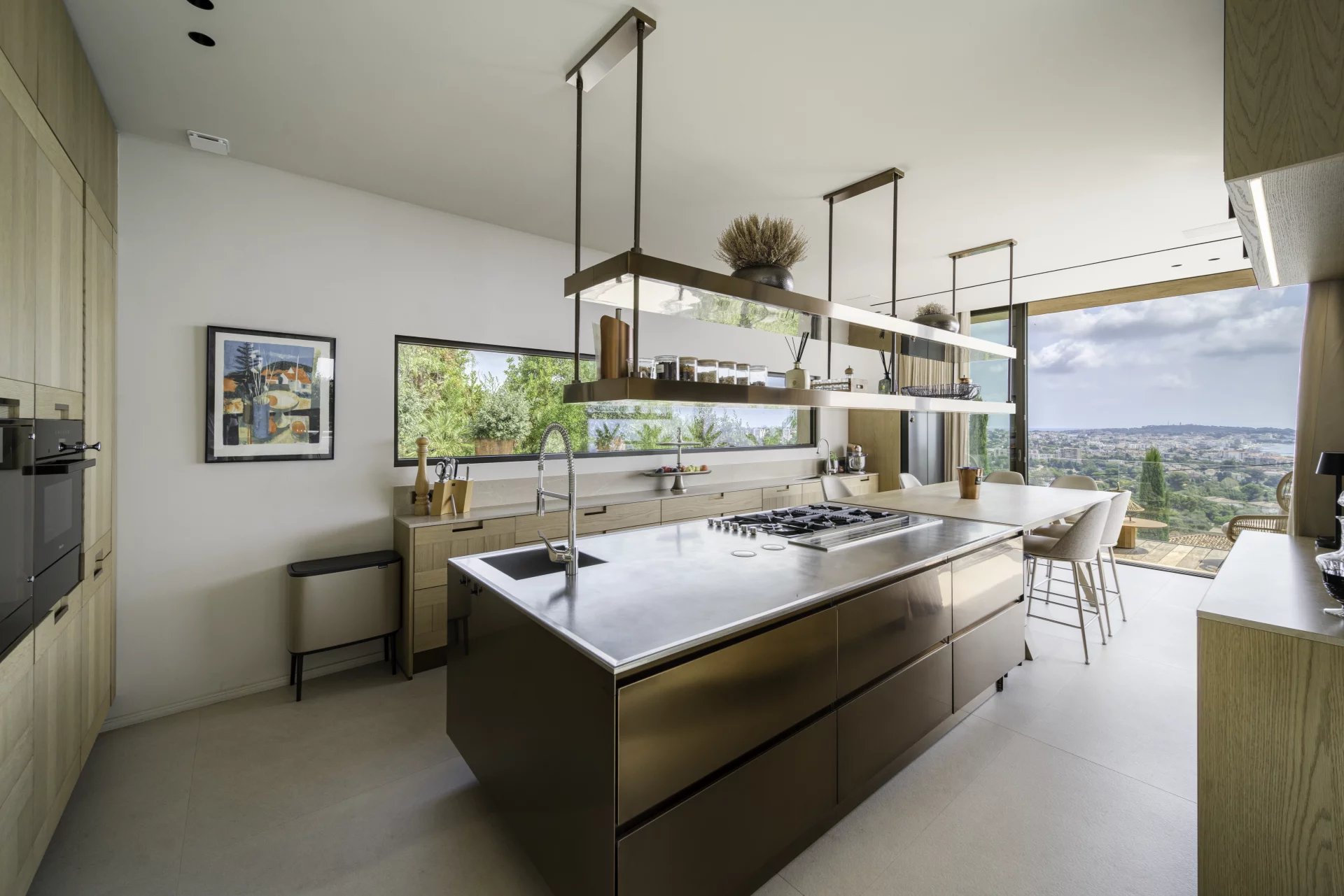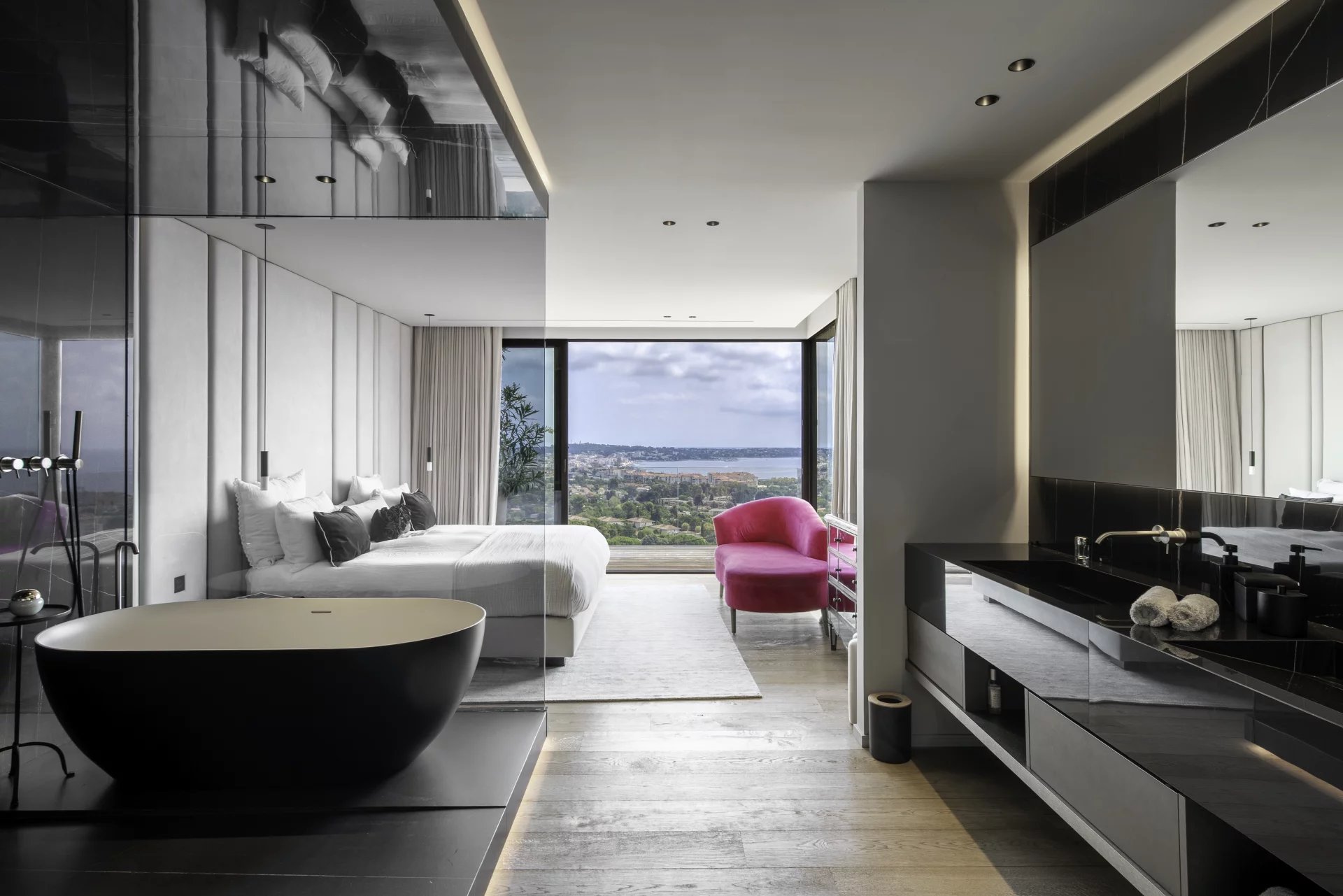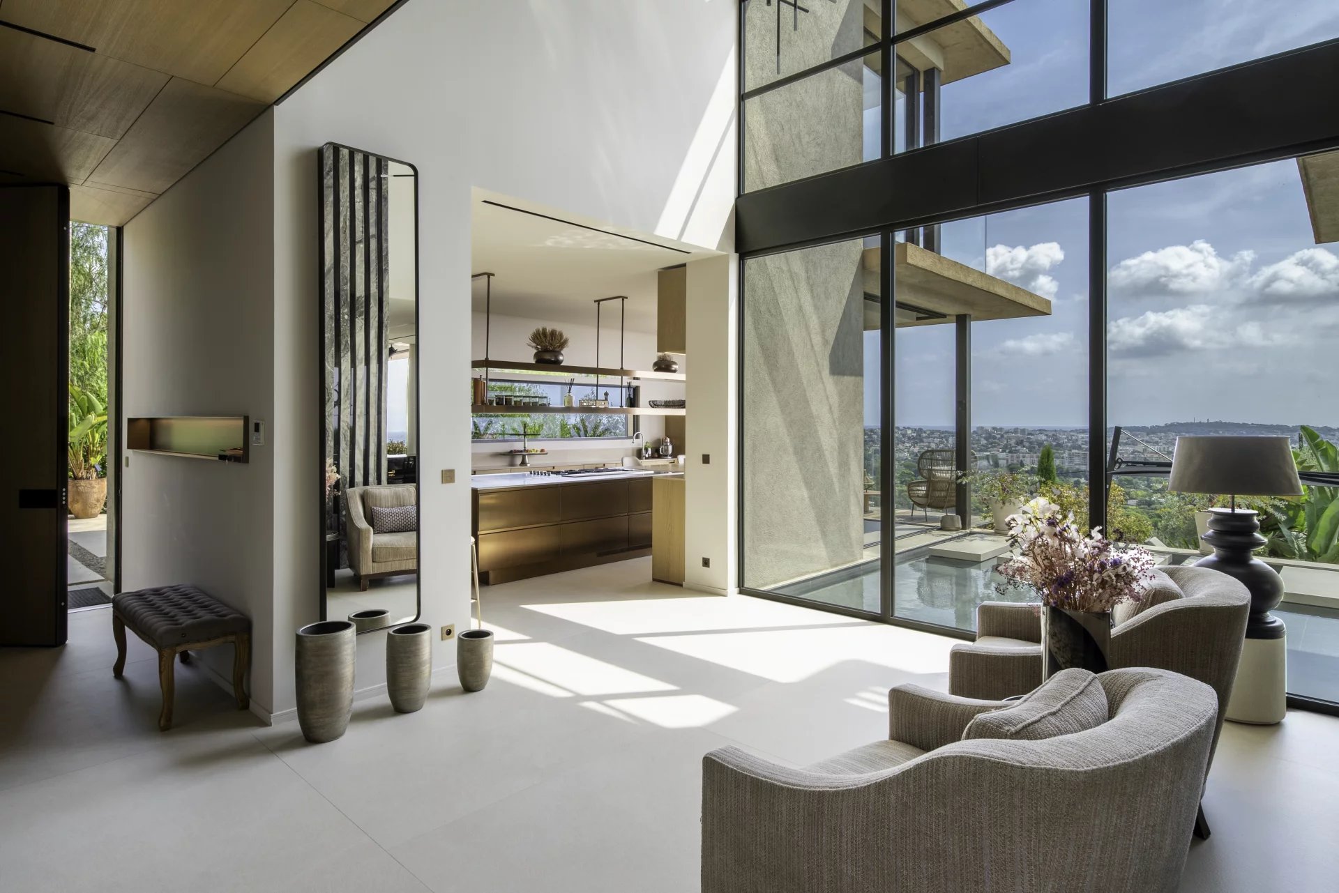 In a sought after and confidential residential area, nestled on the heights of Golfe Juan, a few minutes drive from Cannes and the beaches, this spectacular contemporary villa offers an exceptional living environment, combining absolute calm, brightness and panoramic sea views.