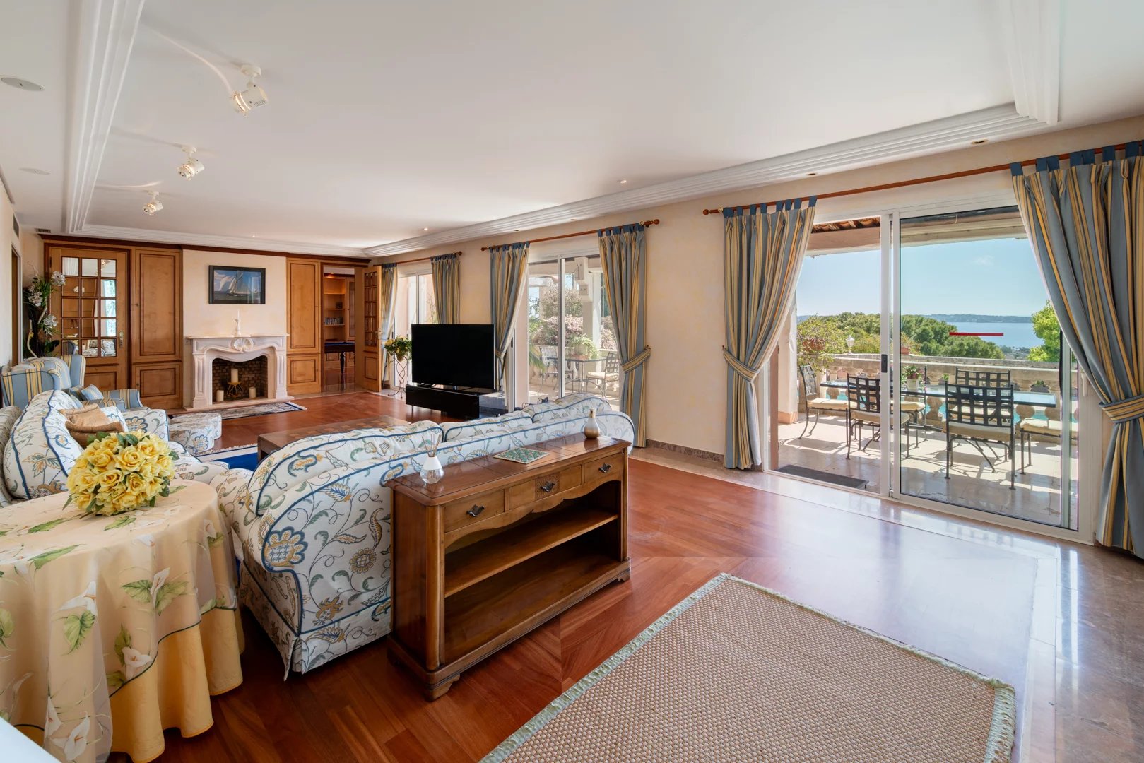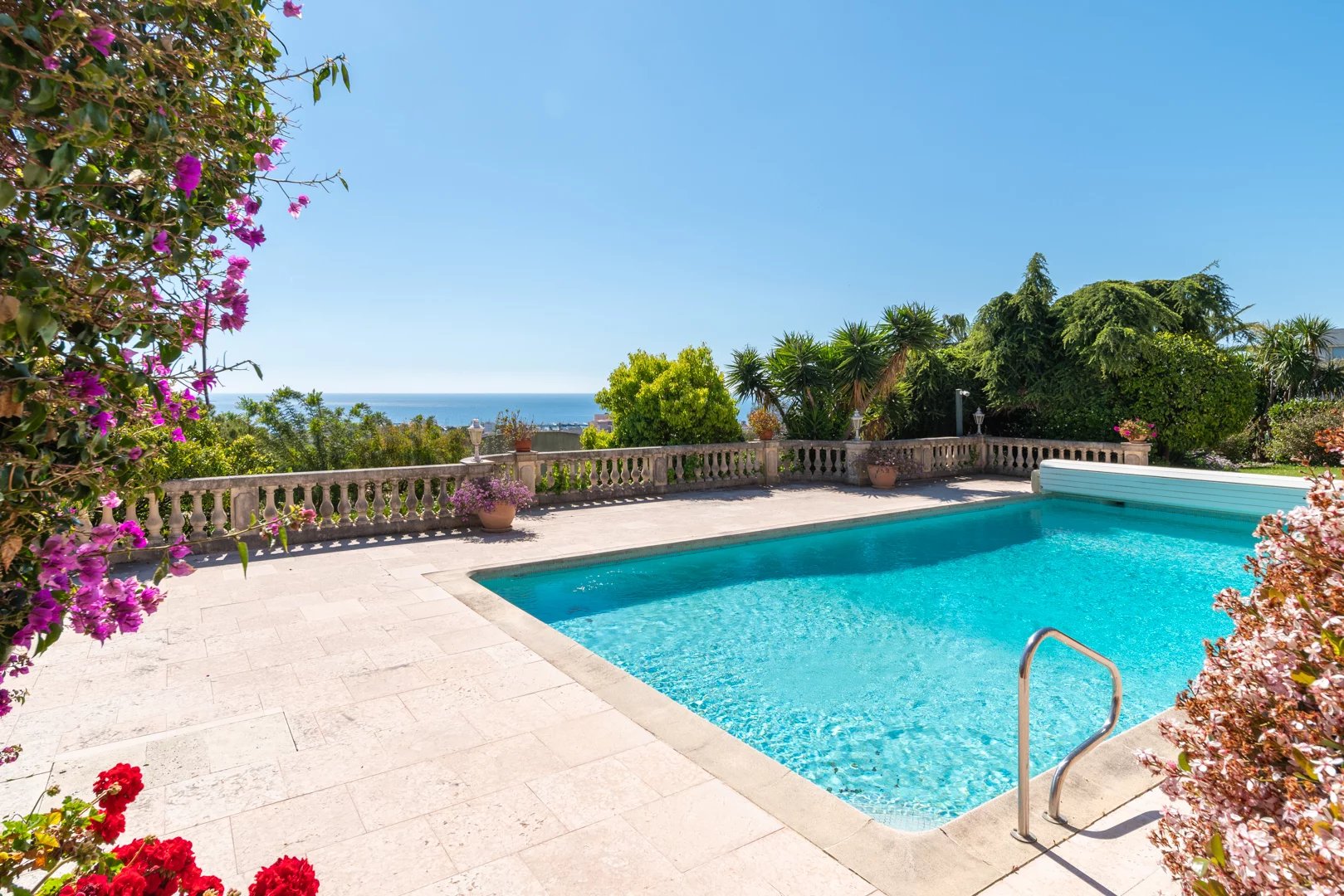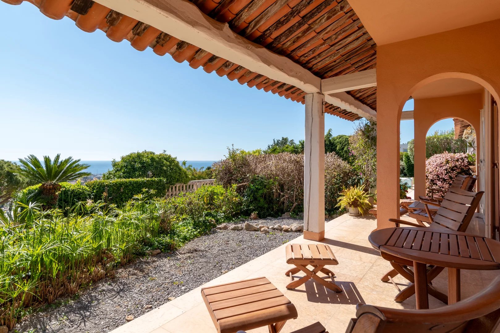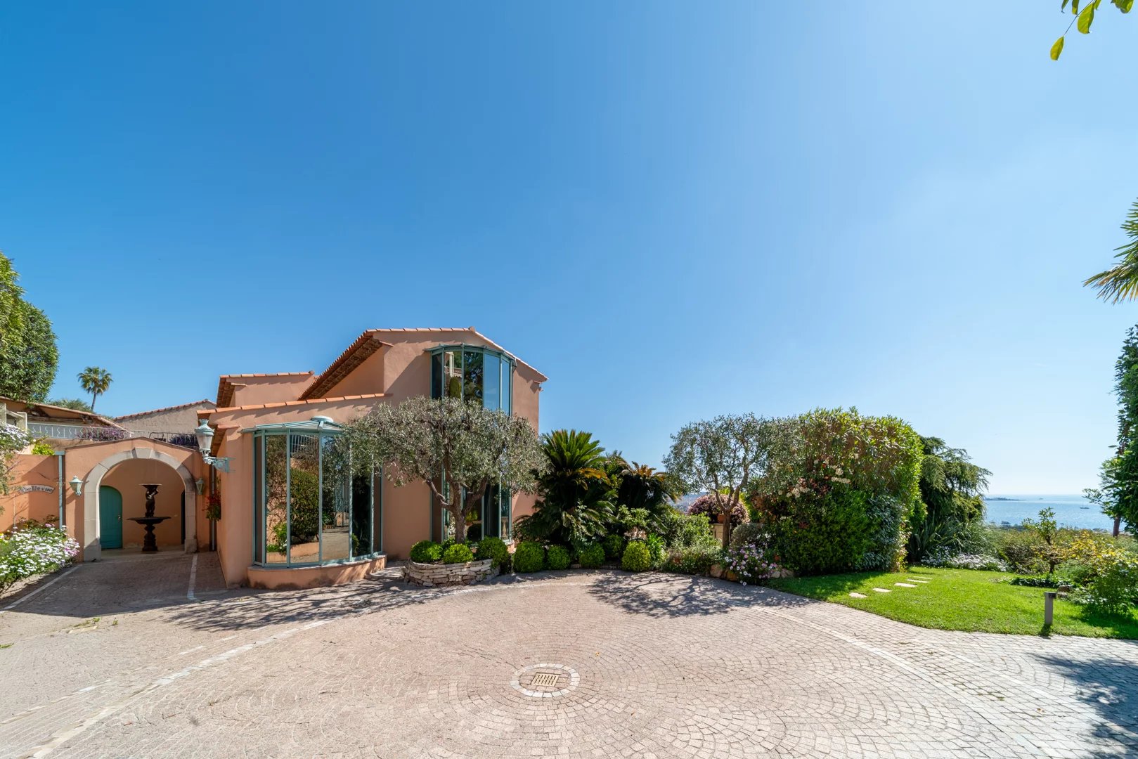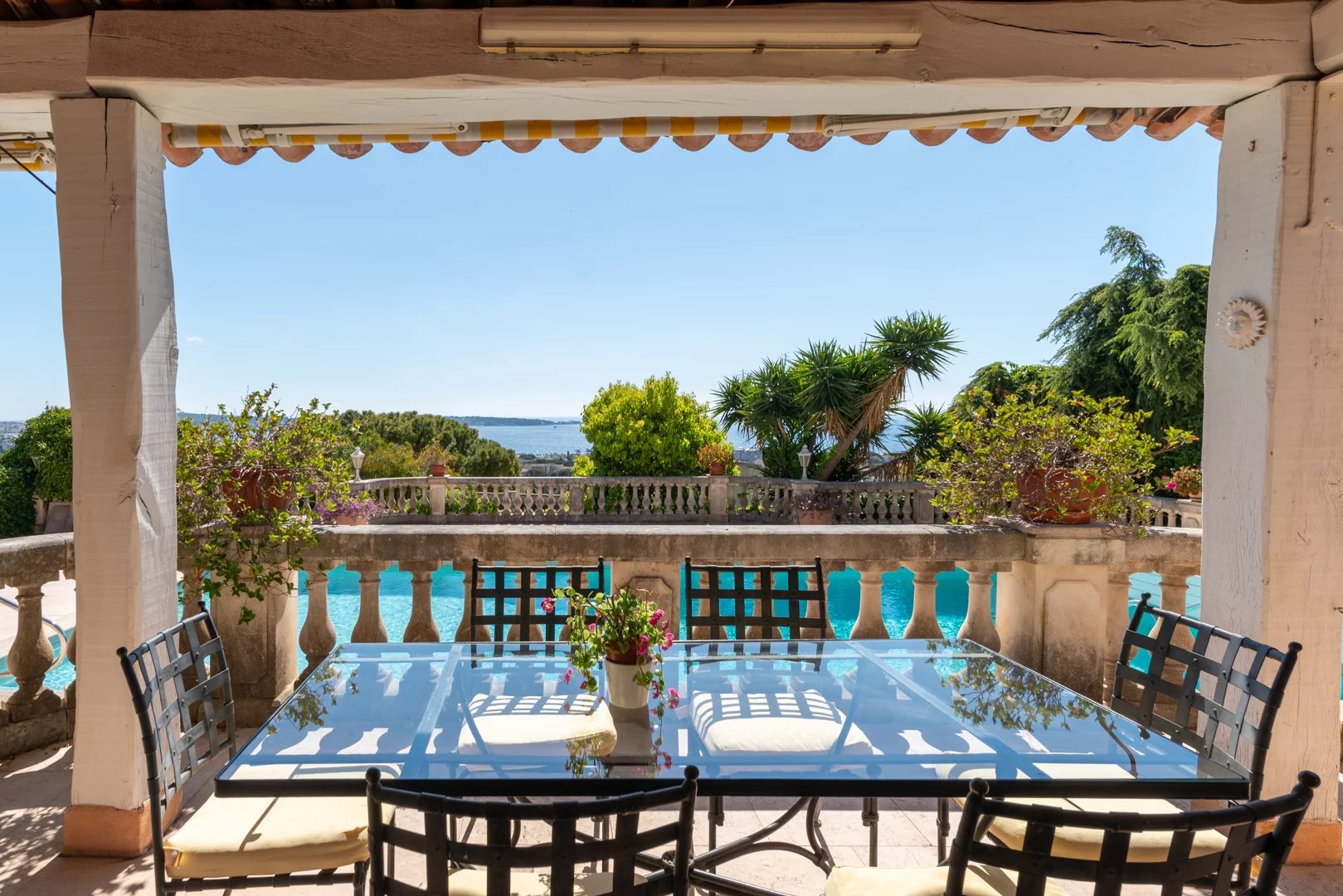 Located on the hills above Golfe-Juan, in a particularly peaceful and verdant setting, the villa boasts stunning sea views, inviting relaxation and escape every day.
