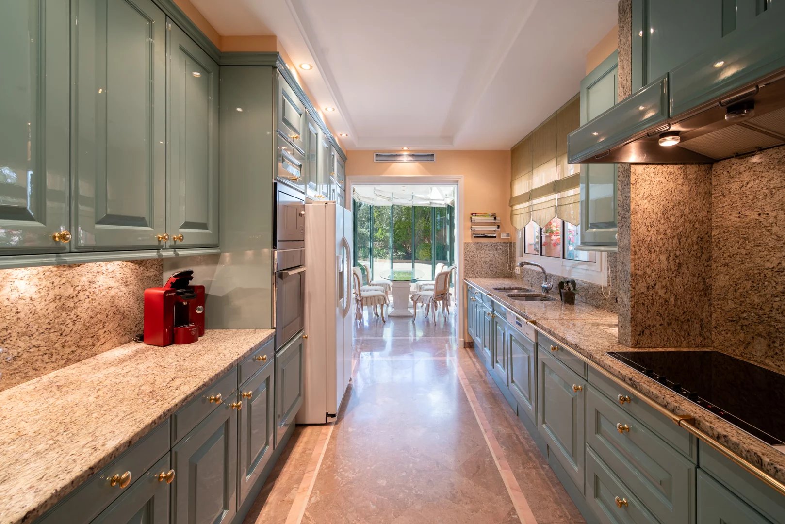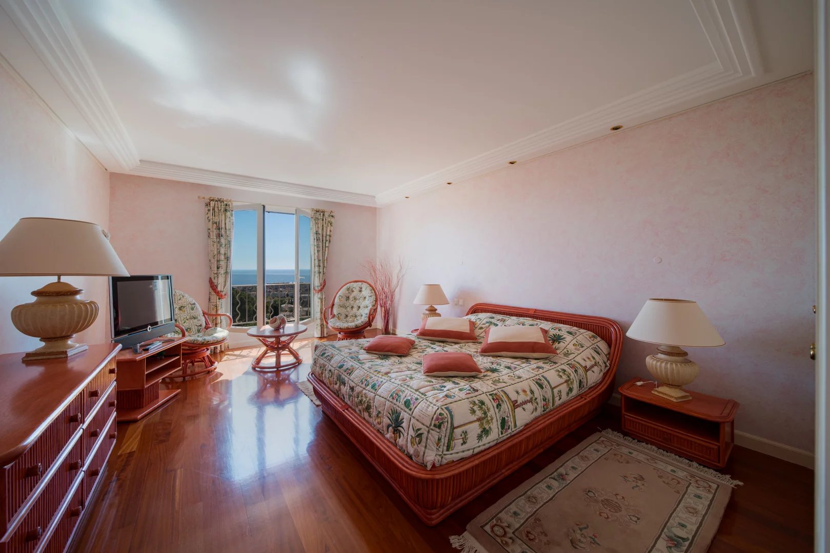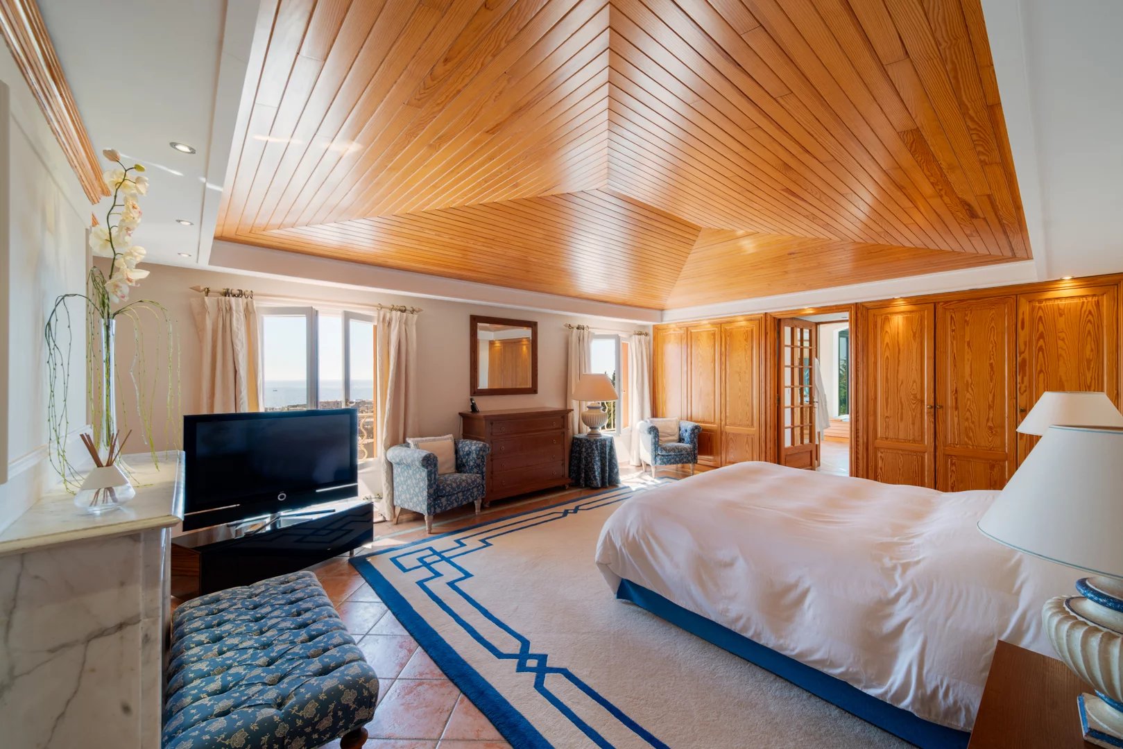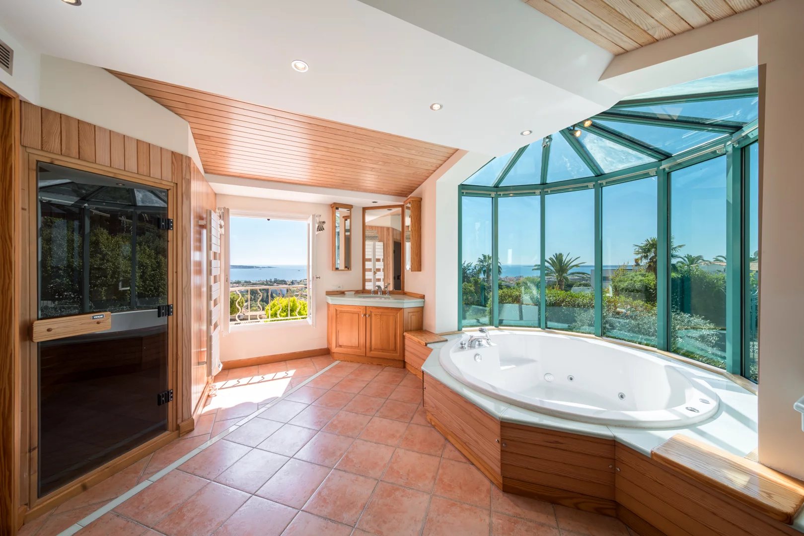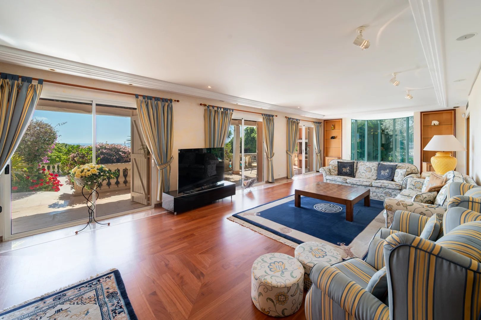 Located on the hills above Golfe-Juan, in a particularly peaceful and verdant setting, the villa boasts stunning sea views, inviting relaxation and escape every day.