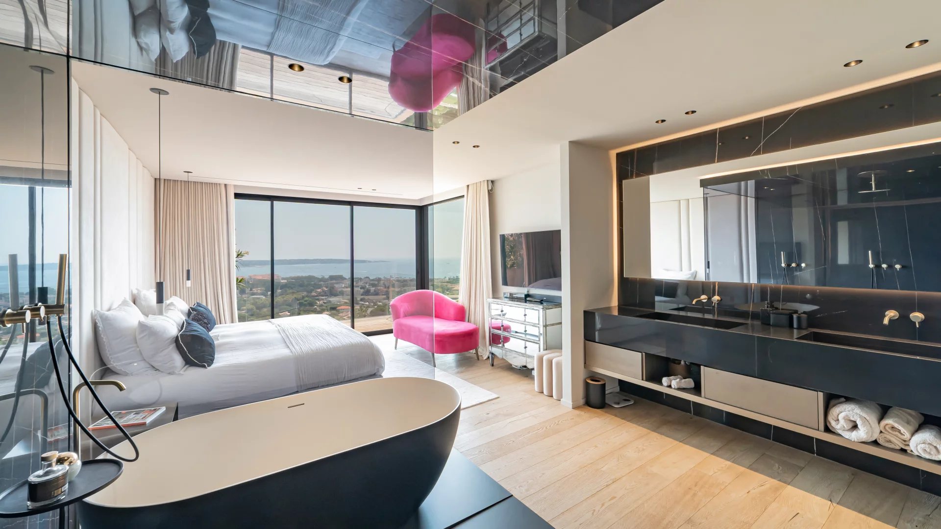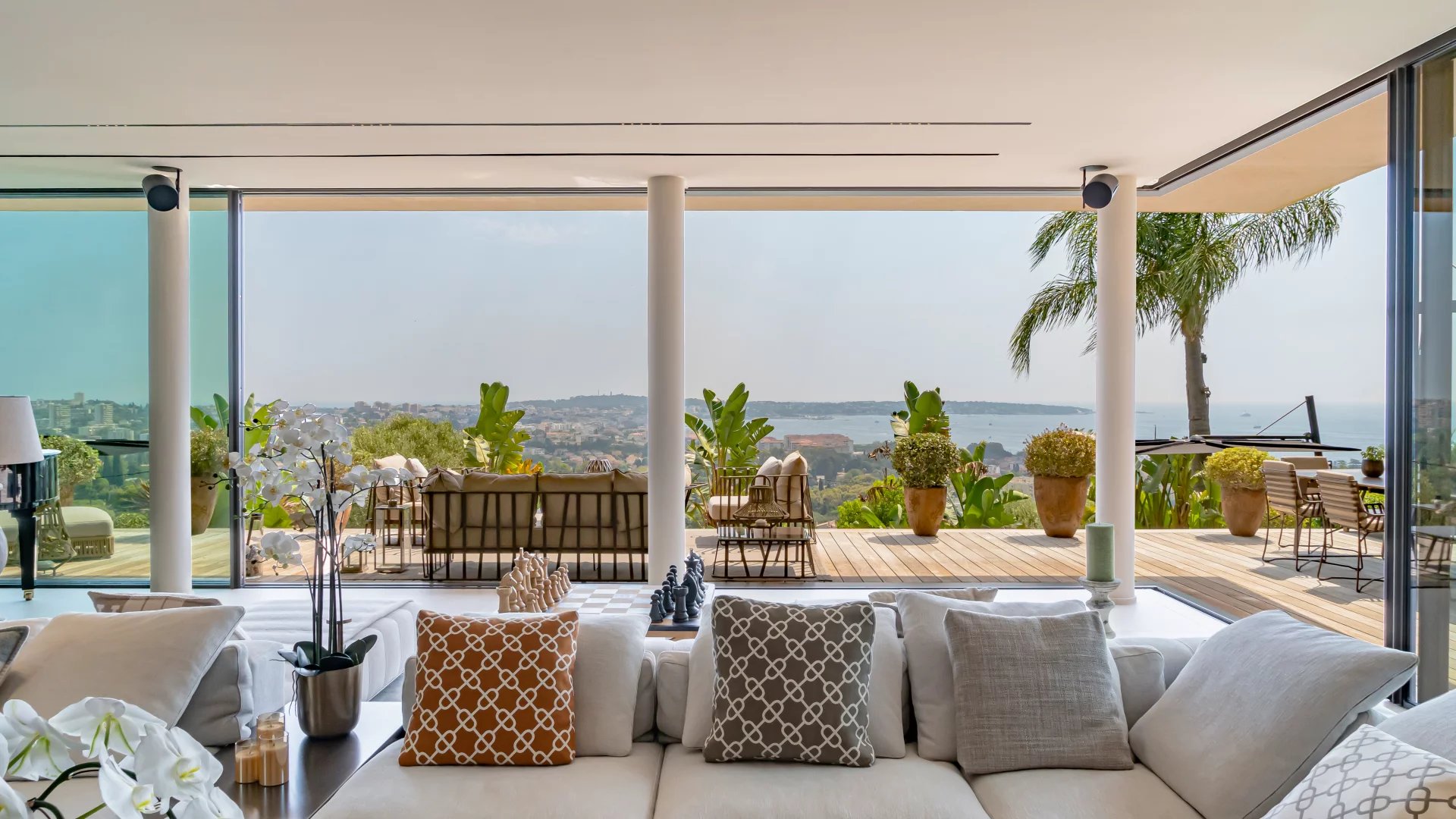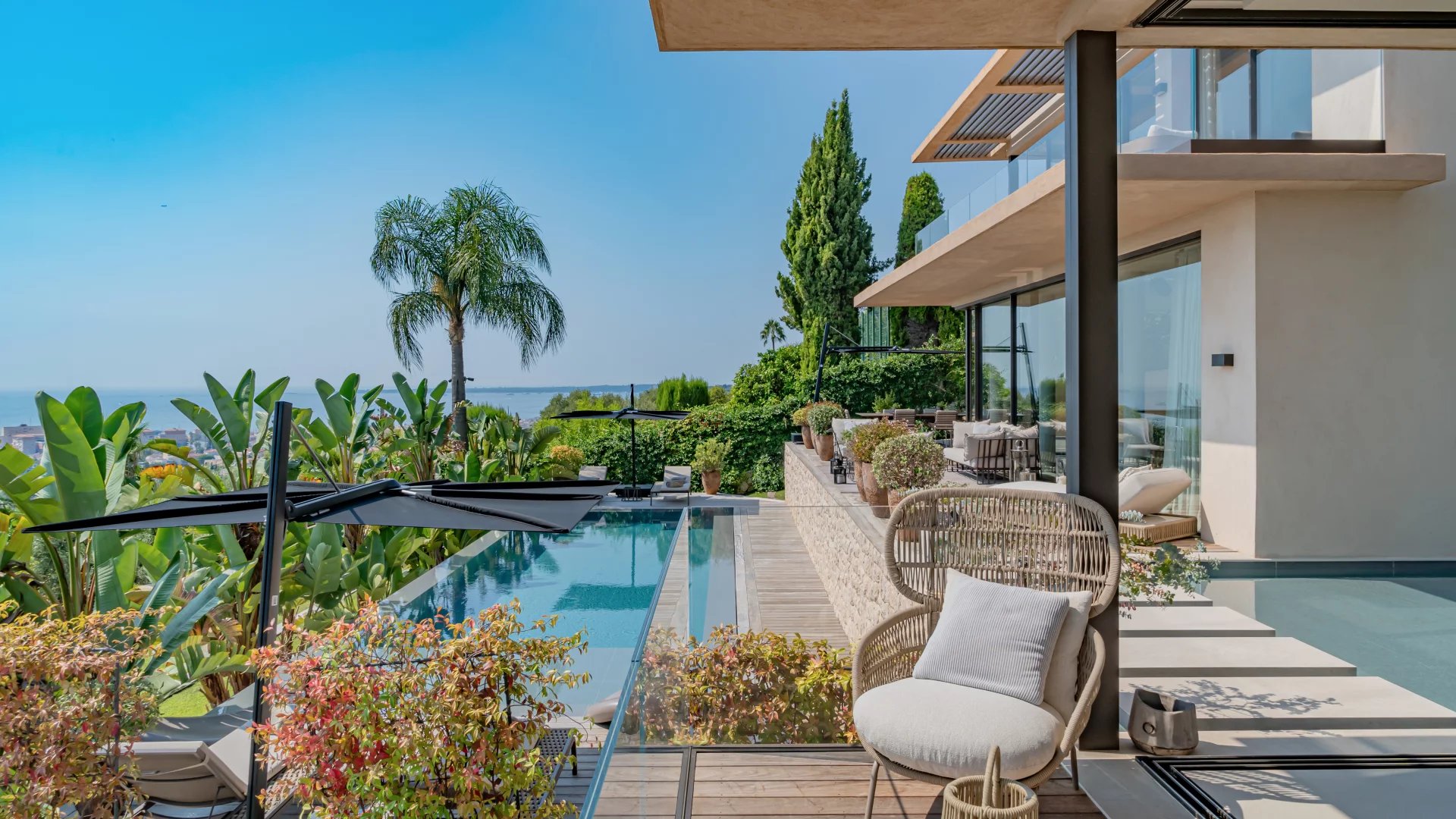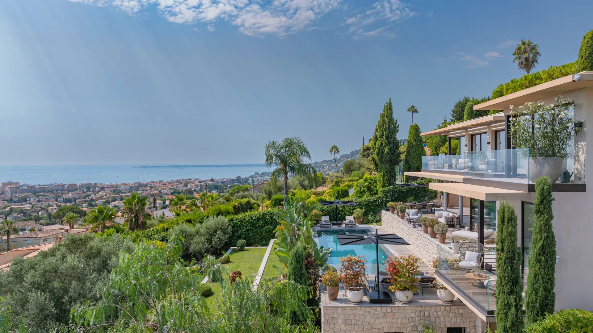 Ideally located in Golfe Juan, this new architect-designed house offers panoramic views of the sea and Cap d’Antibes.