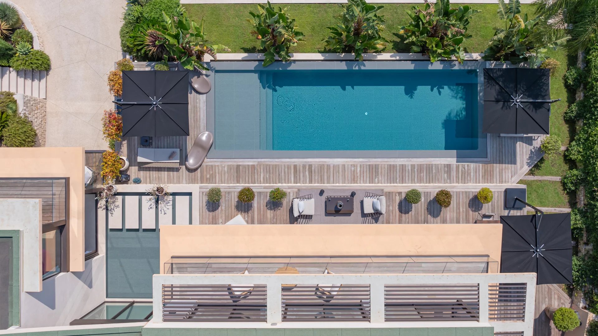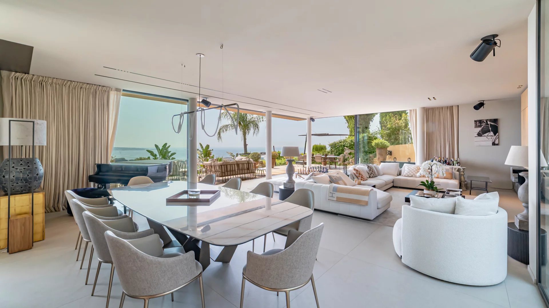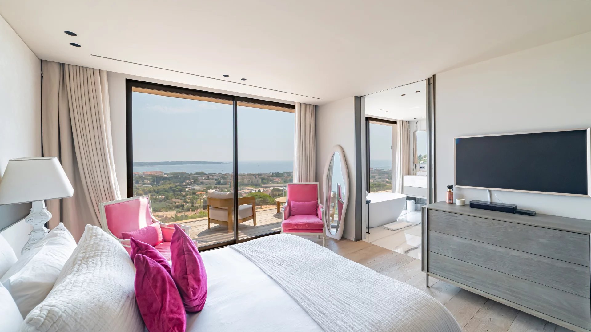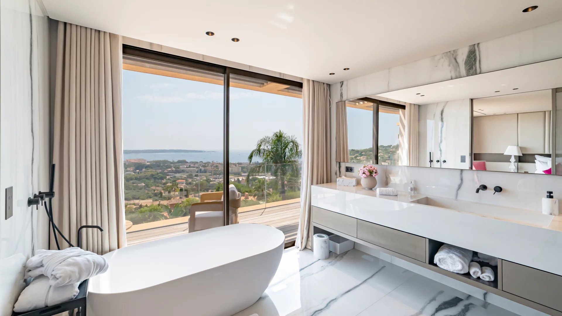 Ideally located in Golfe Juan, this new architect-designed house offers panoramic views of the sea and Cap d’Antibes.