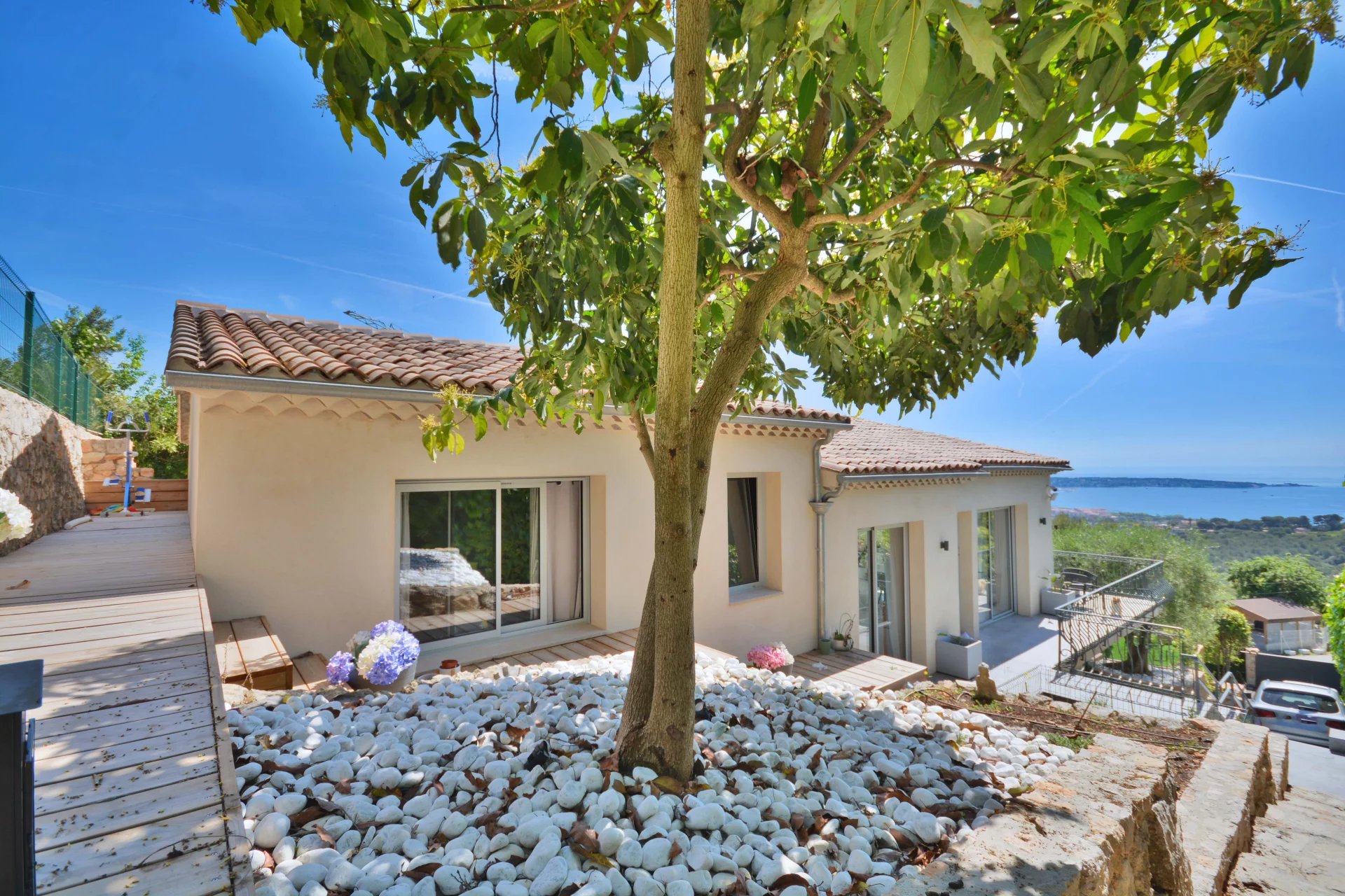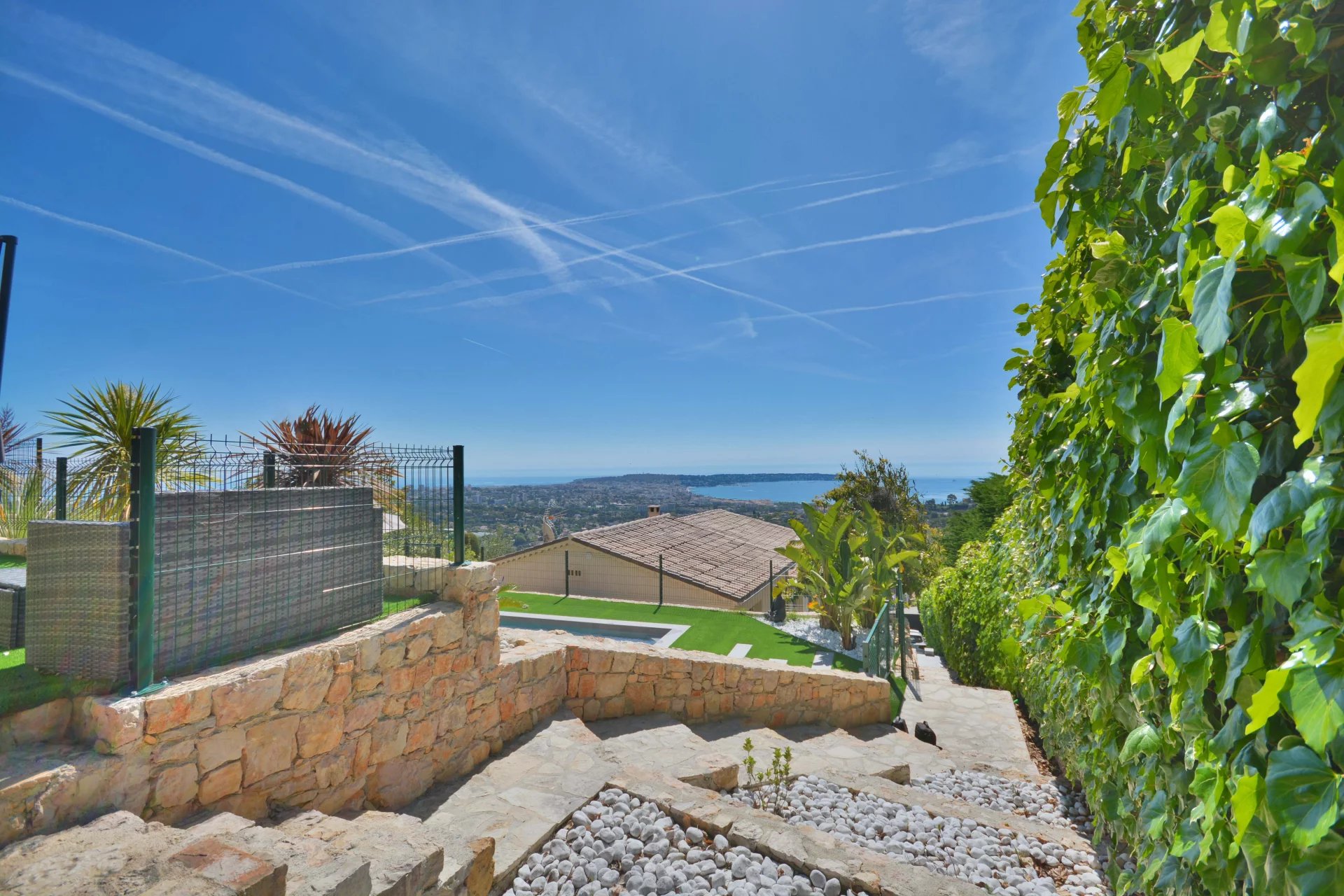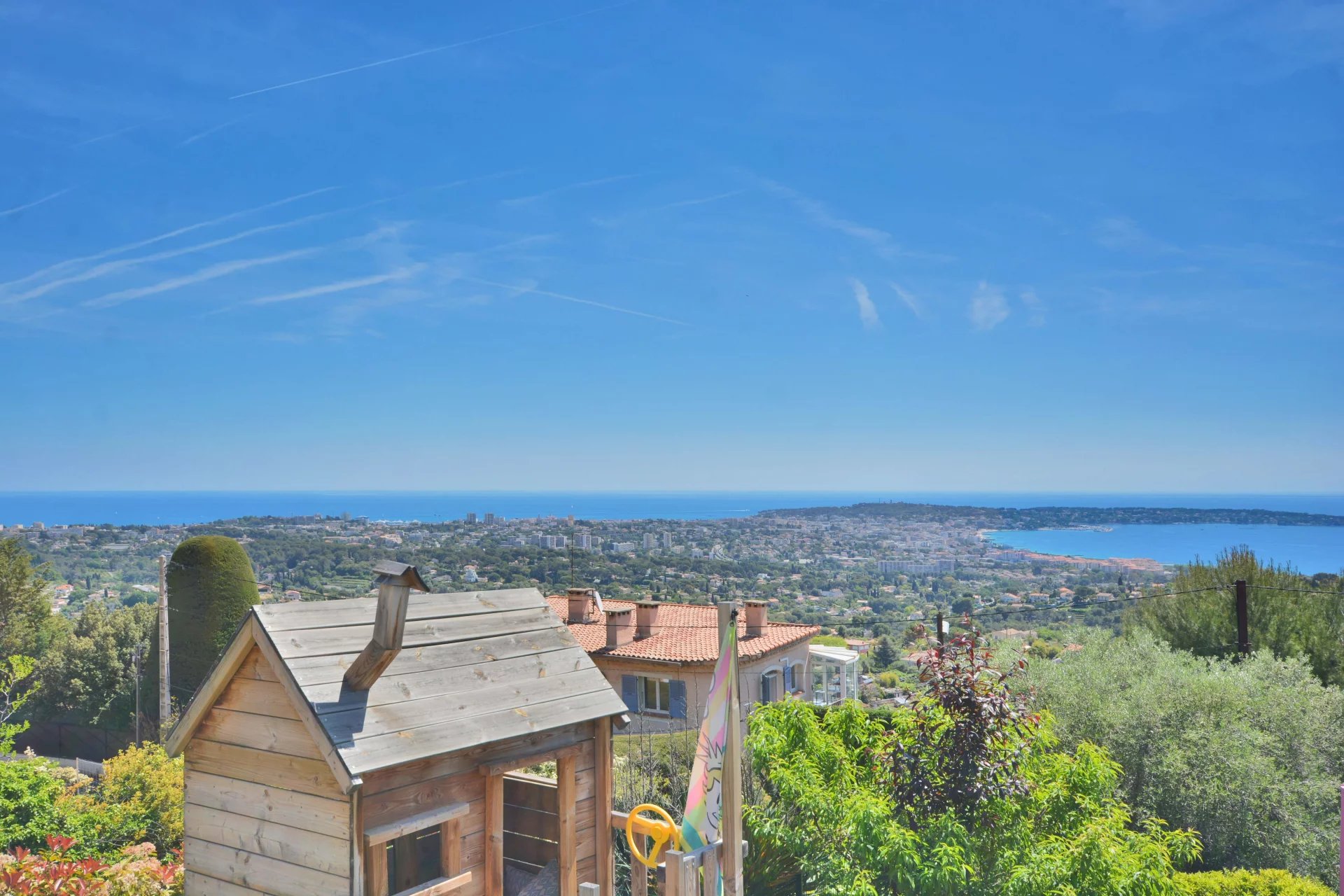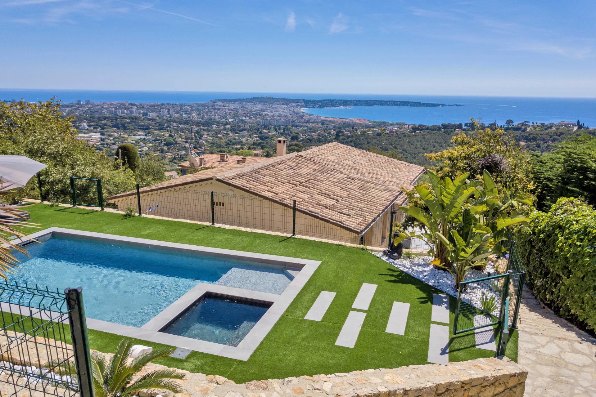Above the charming yacht port of Golf Juan, in a sought after residential area, beautiful villa entirely renovated with quality fittings and benefiting from a panoramic sea view from Cap Martin to the Lerins islands in absolute calm.