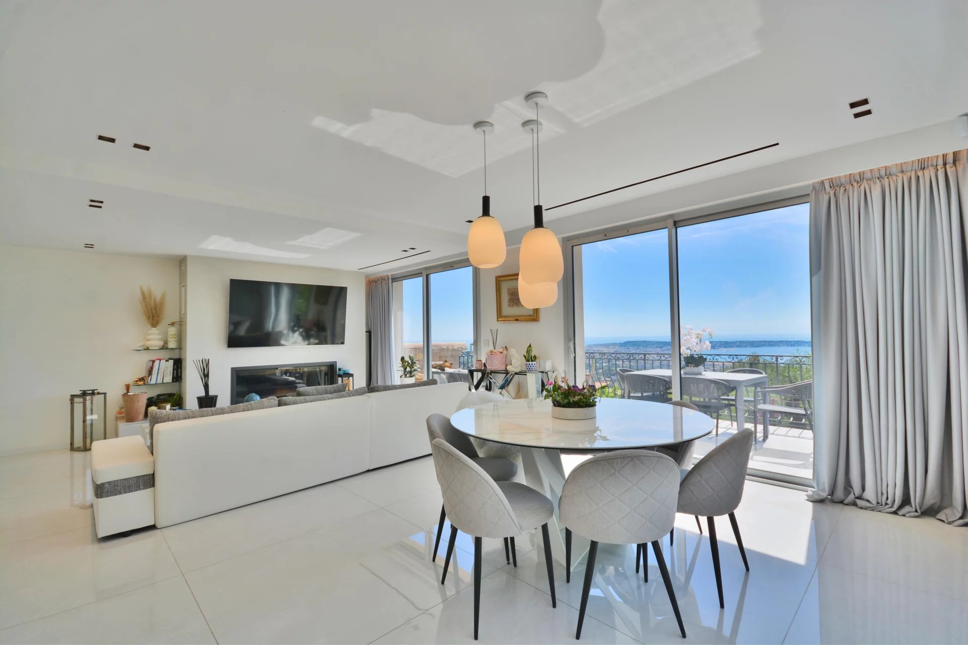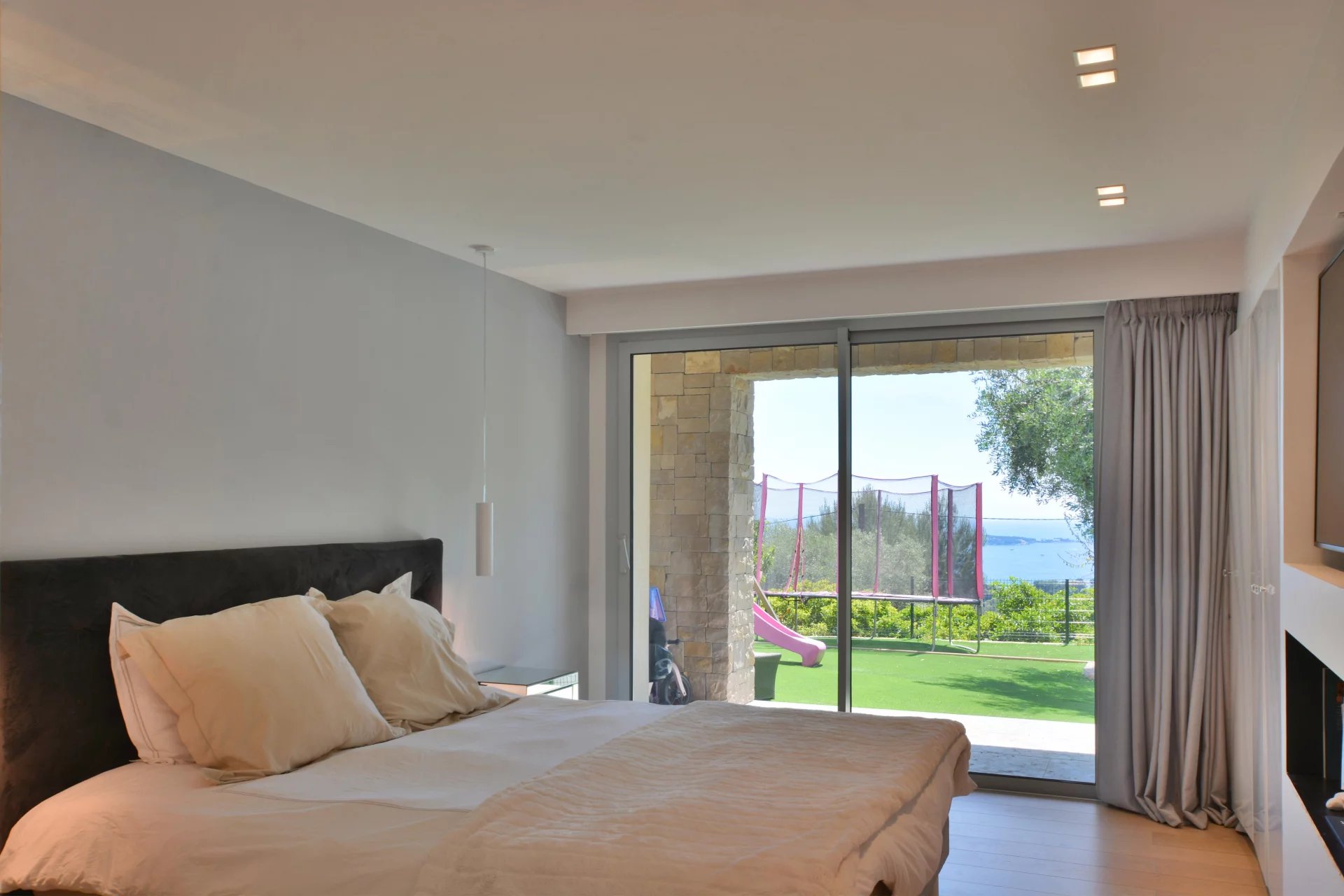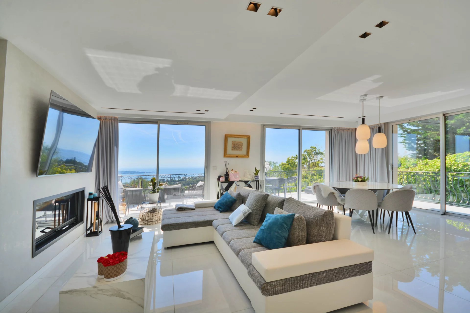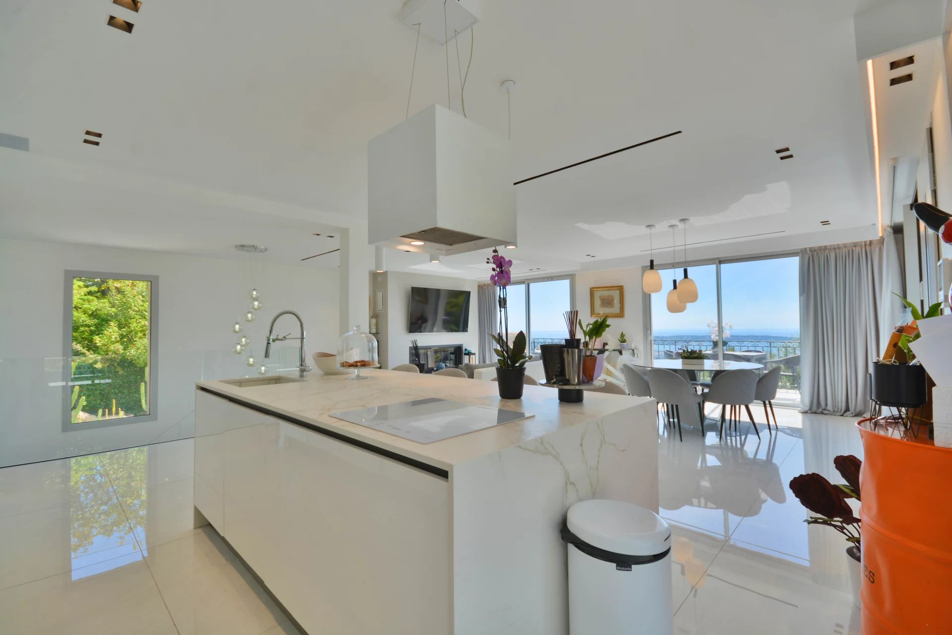 Above the charming yacht port of Golf Juan, in a sought after residential area, beautiful villa entirely renovated with quality fittings and benefiting from a panoramic sea view from Cap Martin to the Lerins islands in absolute calm.