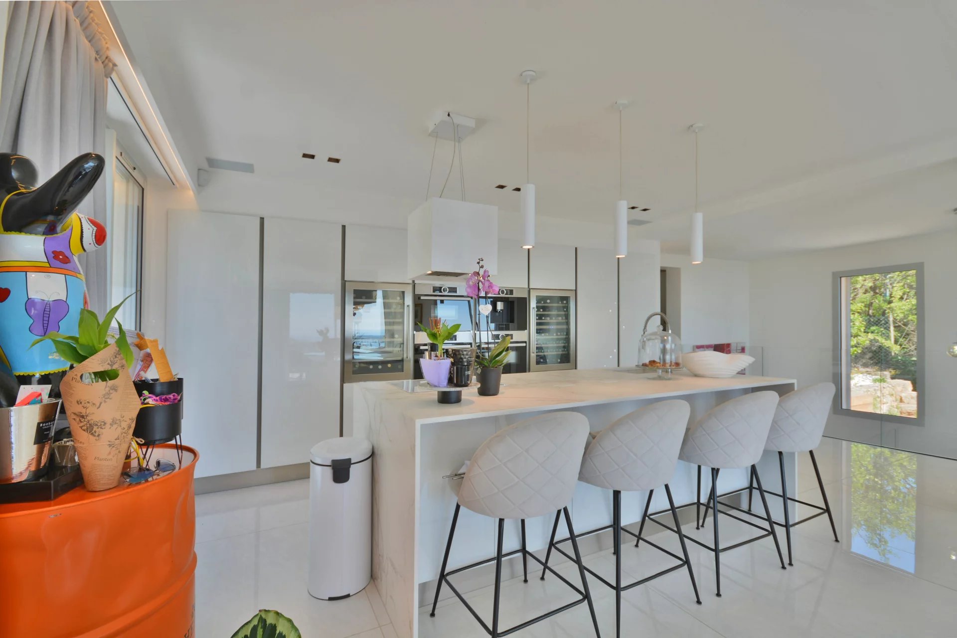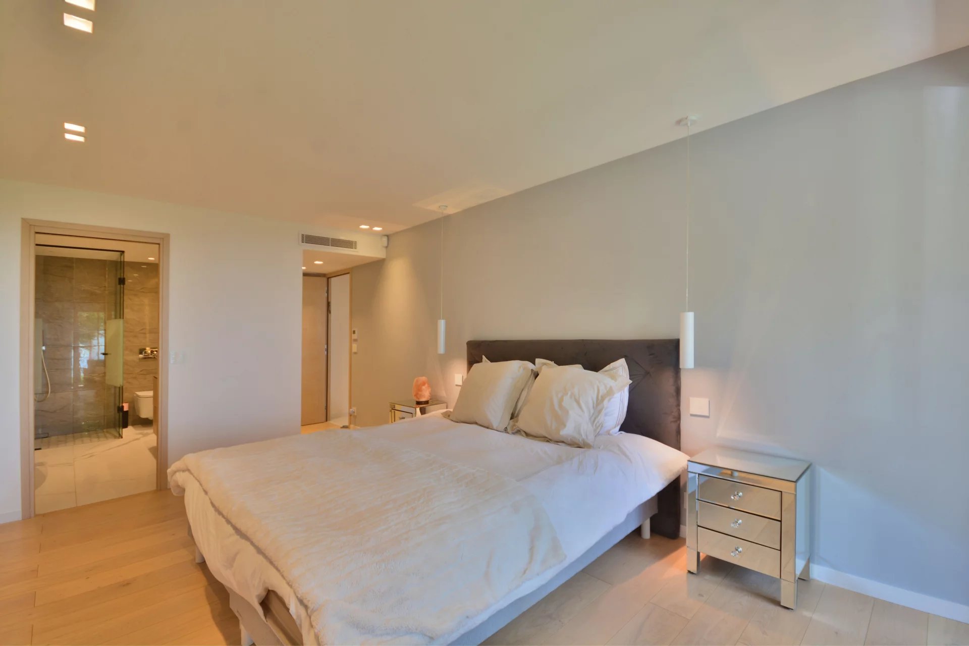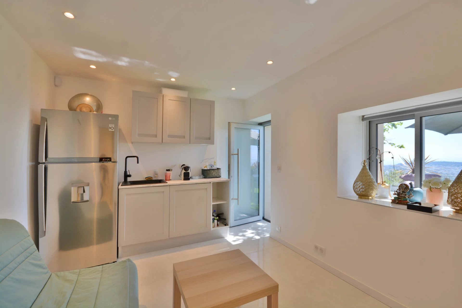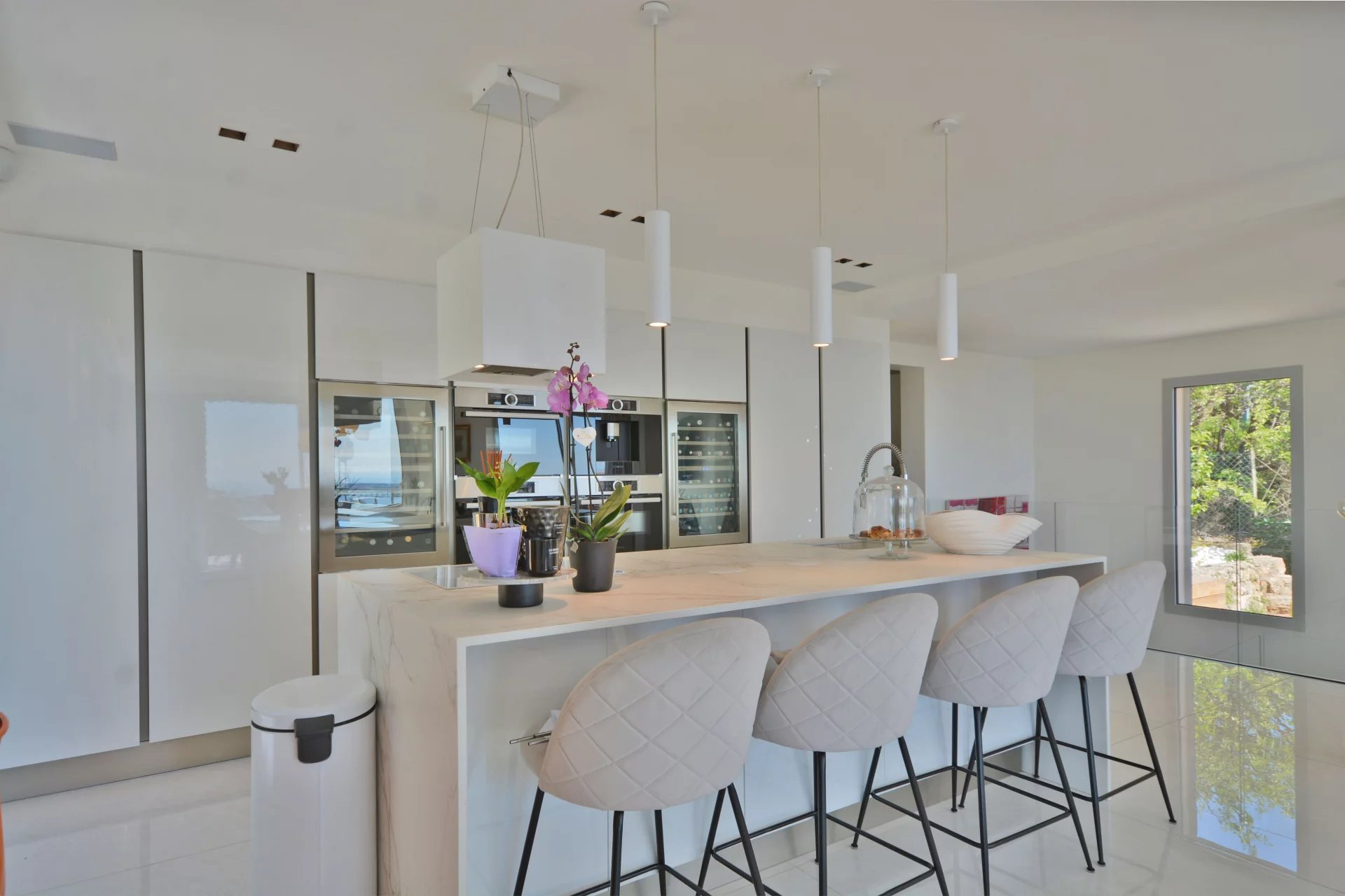 Above the charming yacht port of Golf Juan, in a sought after residential area, beautiful villa entirely renovated with quality fittings and benefiting from a panoramic sea view from Cap Martin to the Lerins islands in absolute calm.