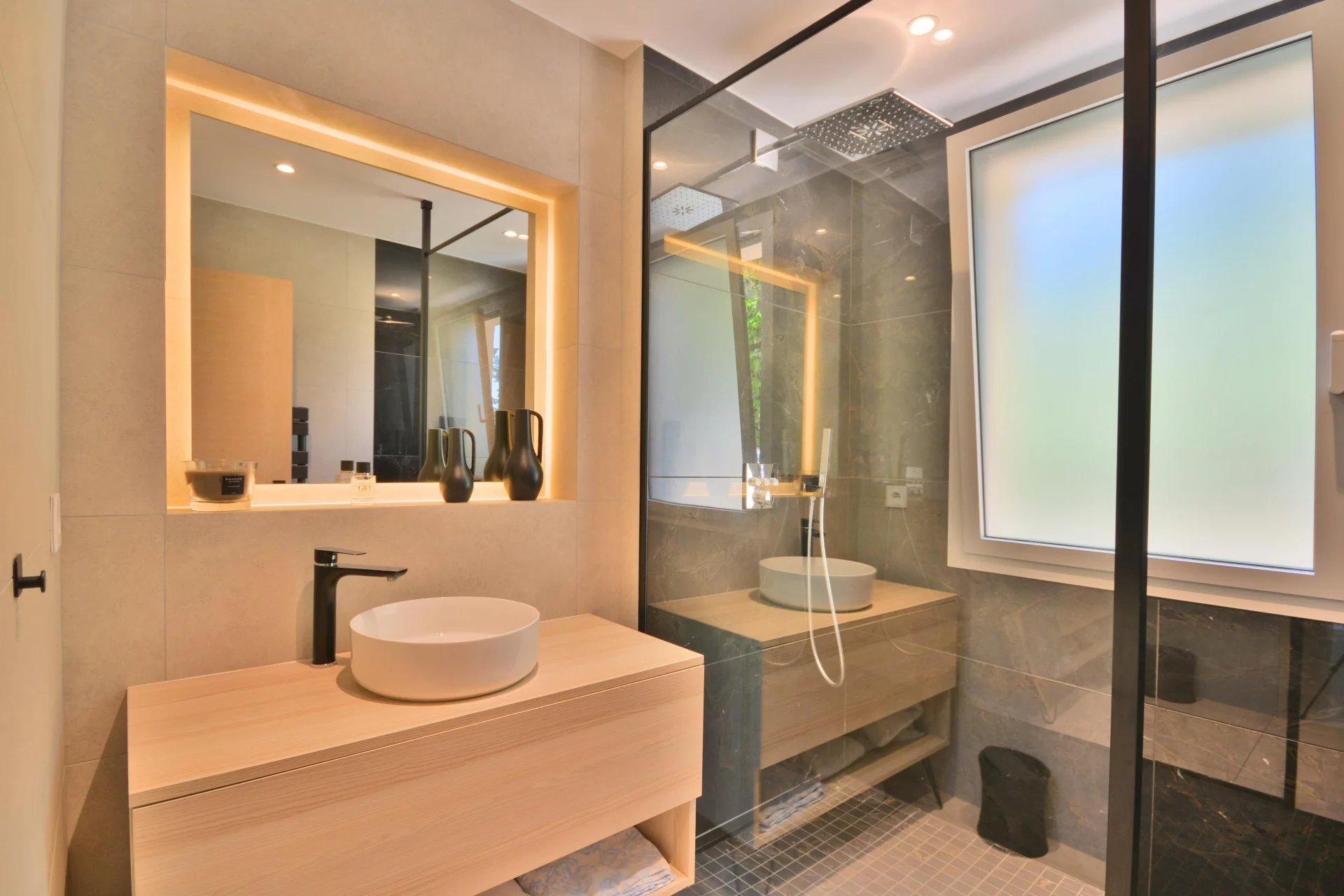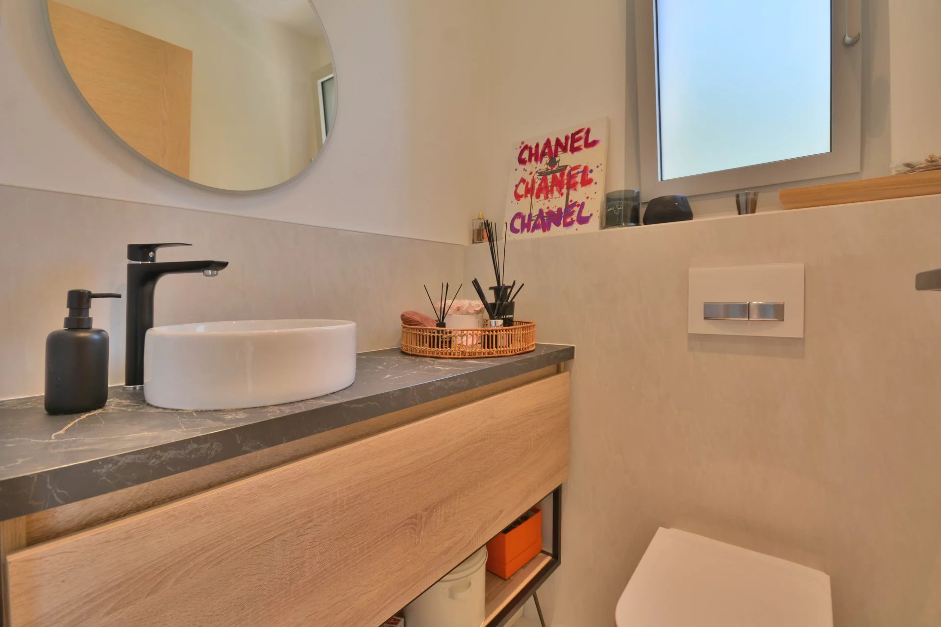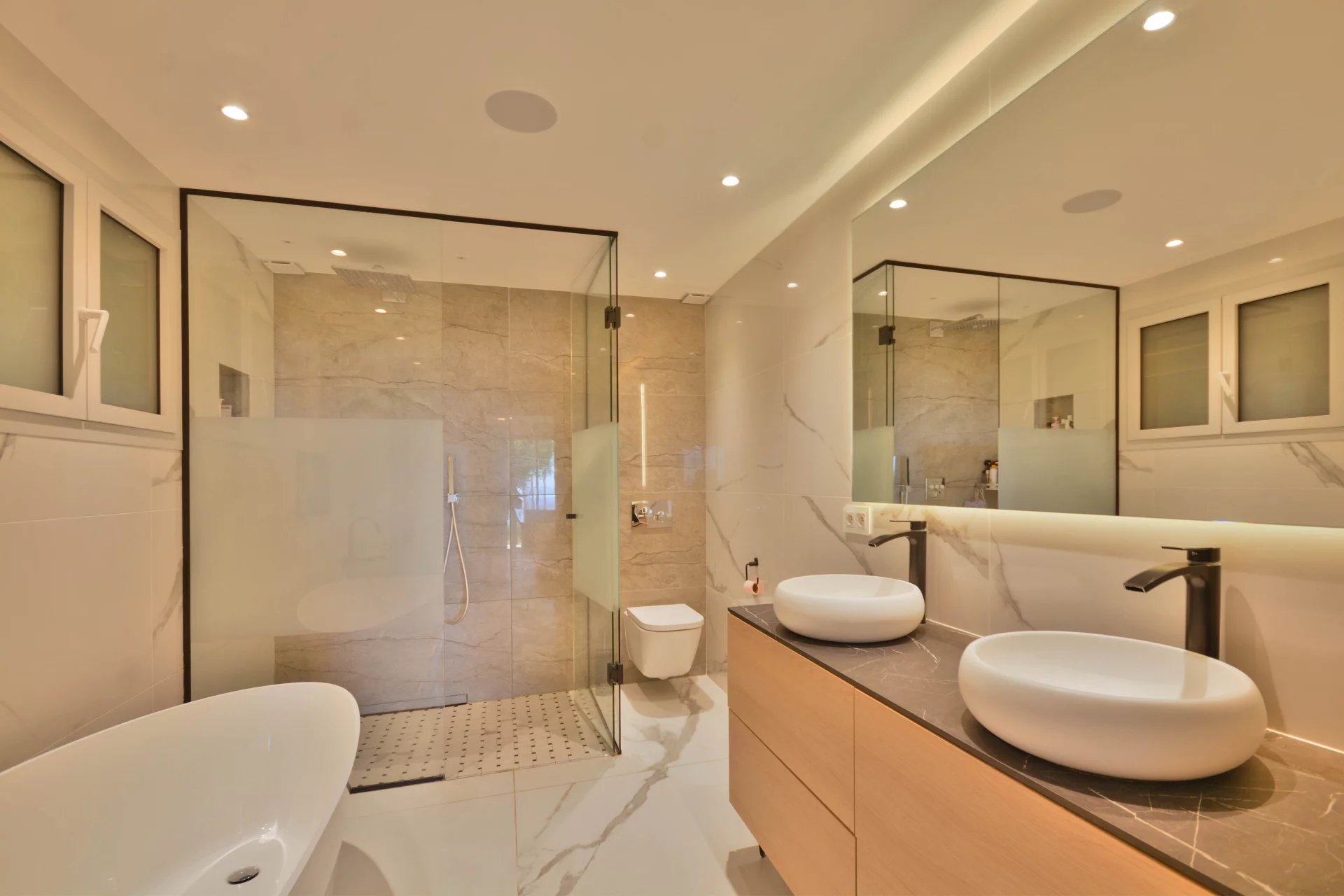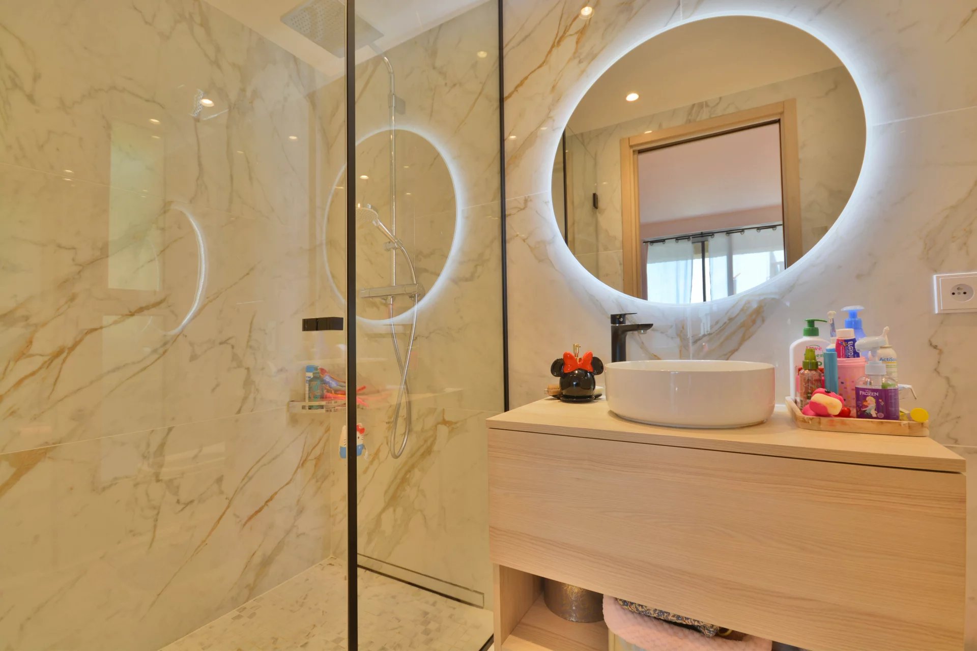 Above the charming yacht port of Golf Juan, in a sought after residential area, beautiful villa entirely renovated with quality fittings and benefiting from a panoramic sea view from Cap Martin to the Lerins islands in absolute calm.
