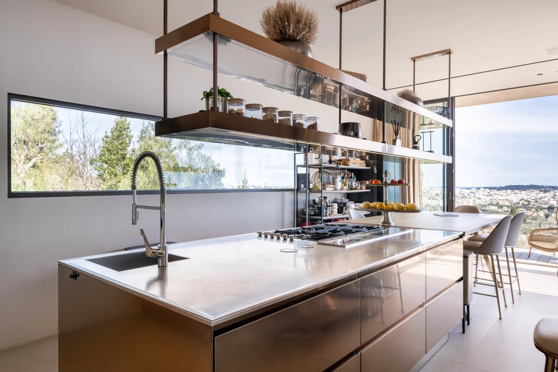 – Floor-to-ceiling sliding windows that fully open, creating a seamless indoor-outdoor living space onto the terrace.