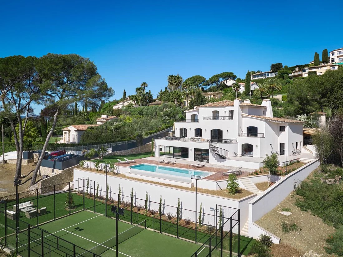 Perched in the prestigious and peaceful residential area of Golfe-Juan, this exceptional 624 m2 (575m2 living space) contemporary villa enjoys a panoramic vista of the Mediterranean and Cap d’Antibes.