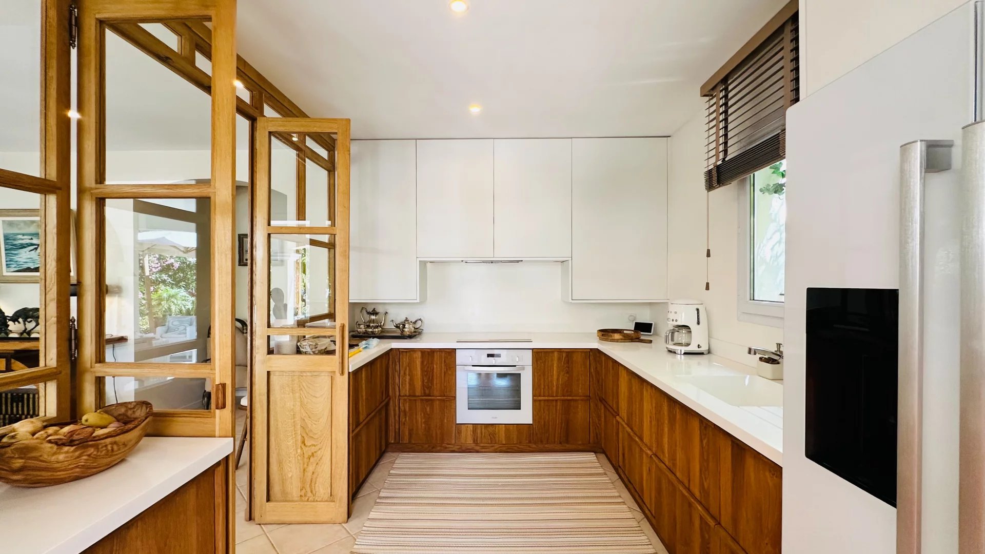 The villa’s generous living spaces include a bright lounge, dining room, and fully equipped kitchen, all opening onto a south-facing shaded terrace, ideal for long summer lunches overlooking the gardens.