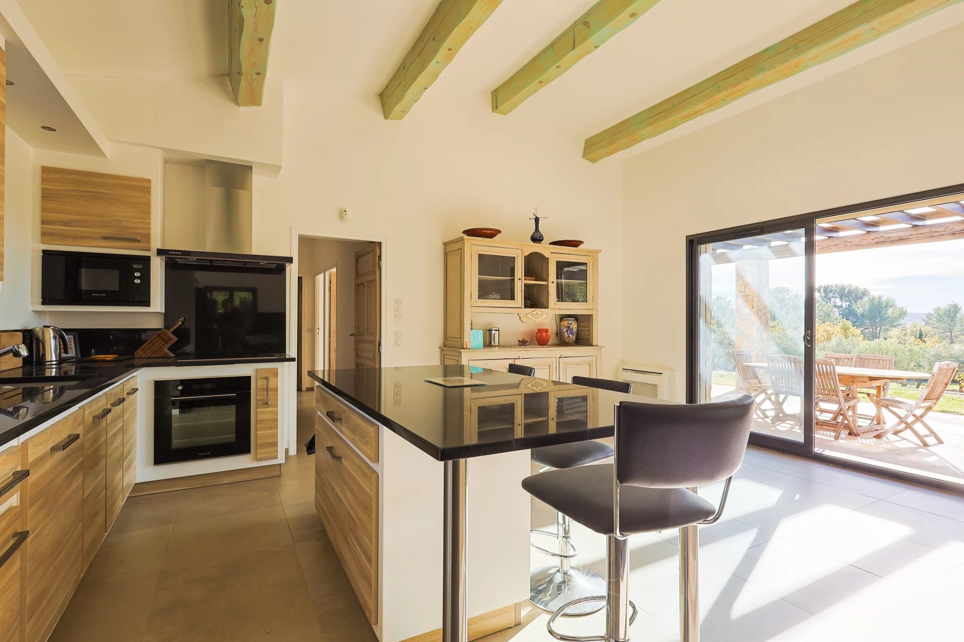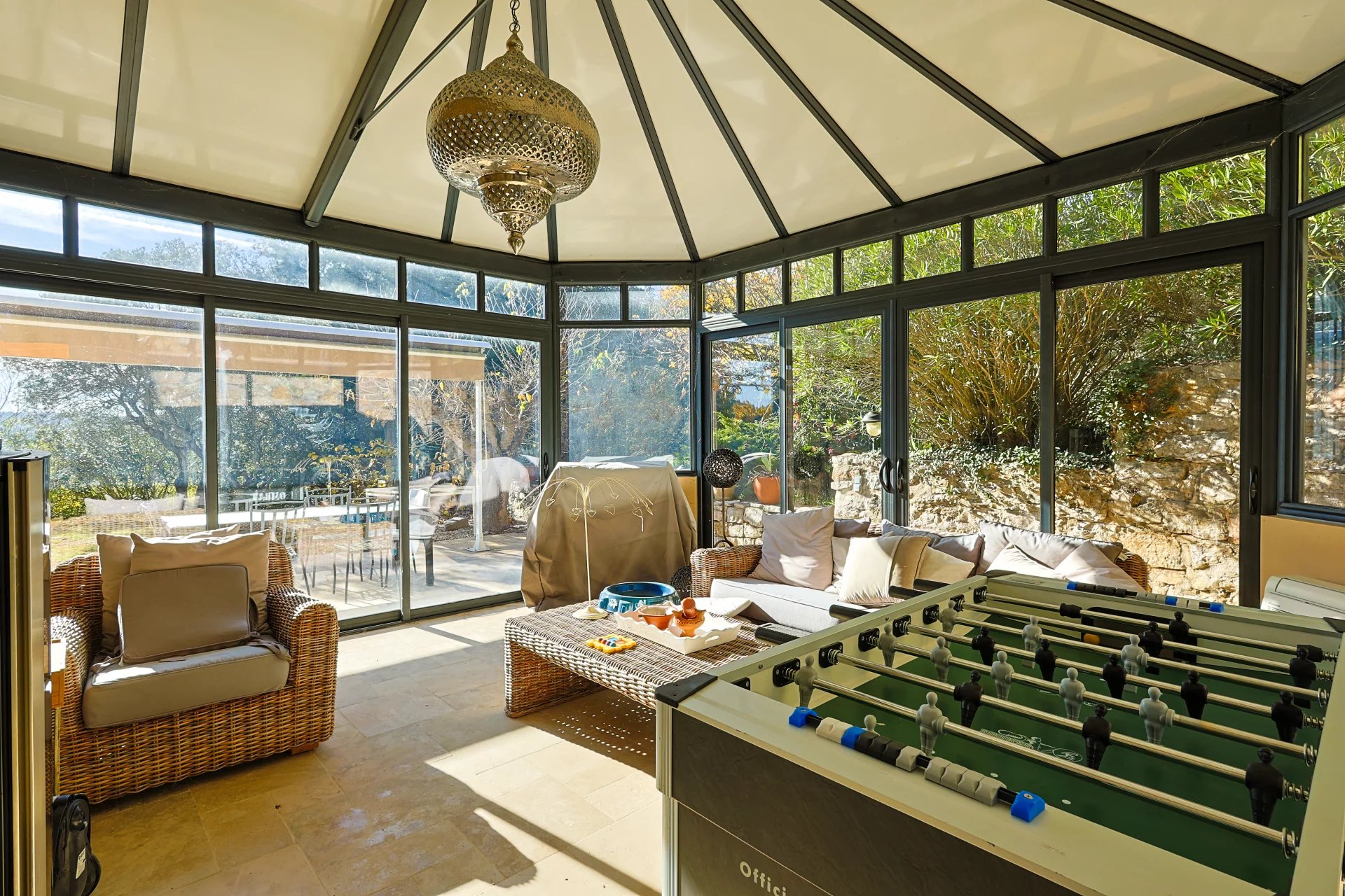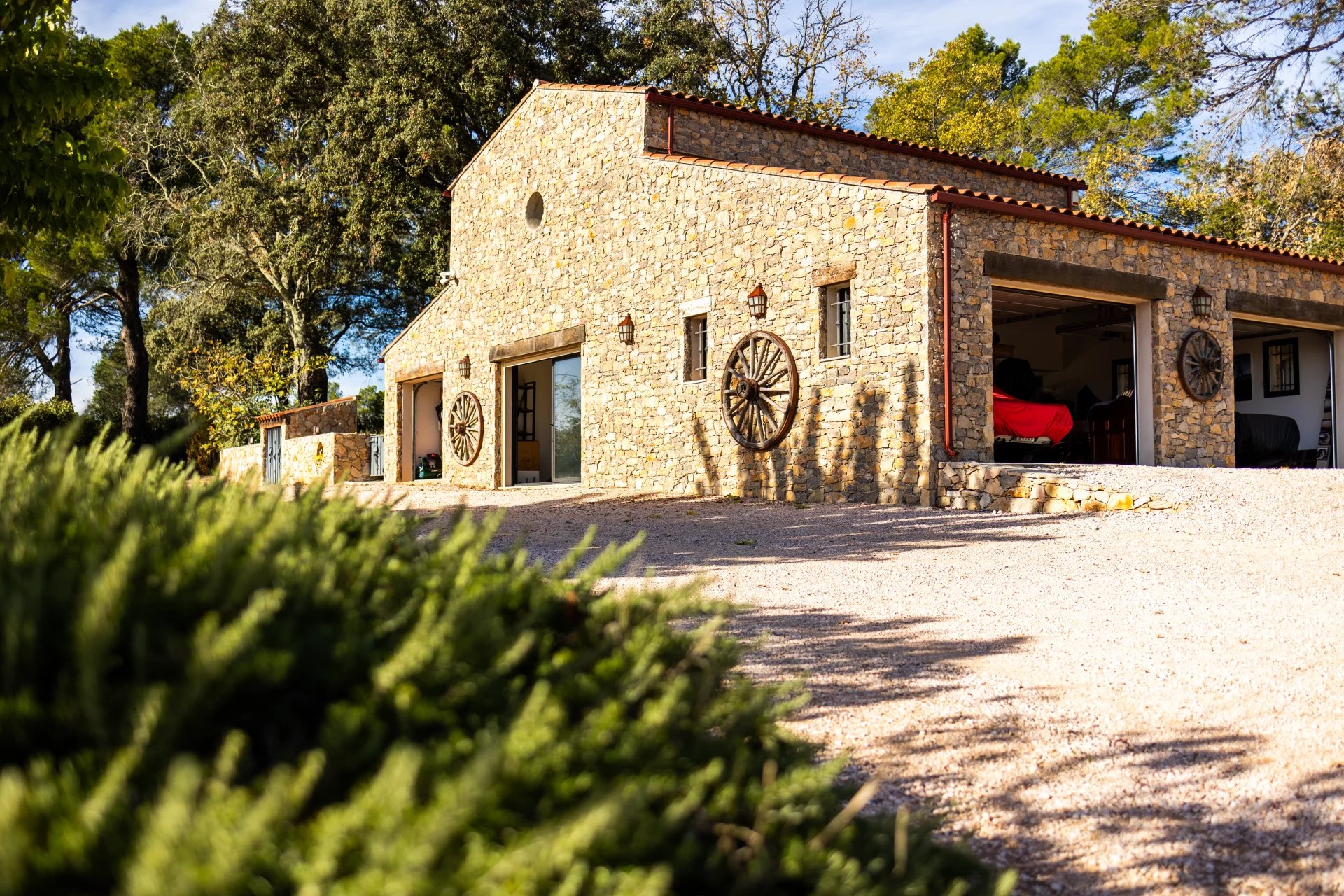 The undeniable advantage of this property is a 150 m2 space dedicated to car lovers. You’ll be amazed by this architectural solution, built in the same modern Provencal style with its dressed stone facade, with space for 7 cars, a lounge, a bar with a billiard table, a games room and a shower room, creating an ideal meeting place. And to top it all off, a mezzanine office provides an inspiring space for moments of reflection.
