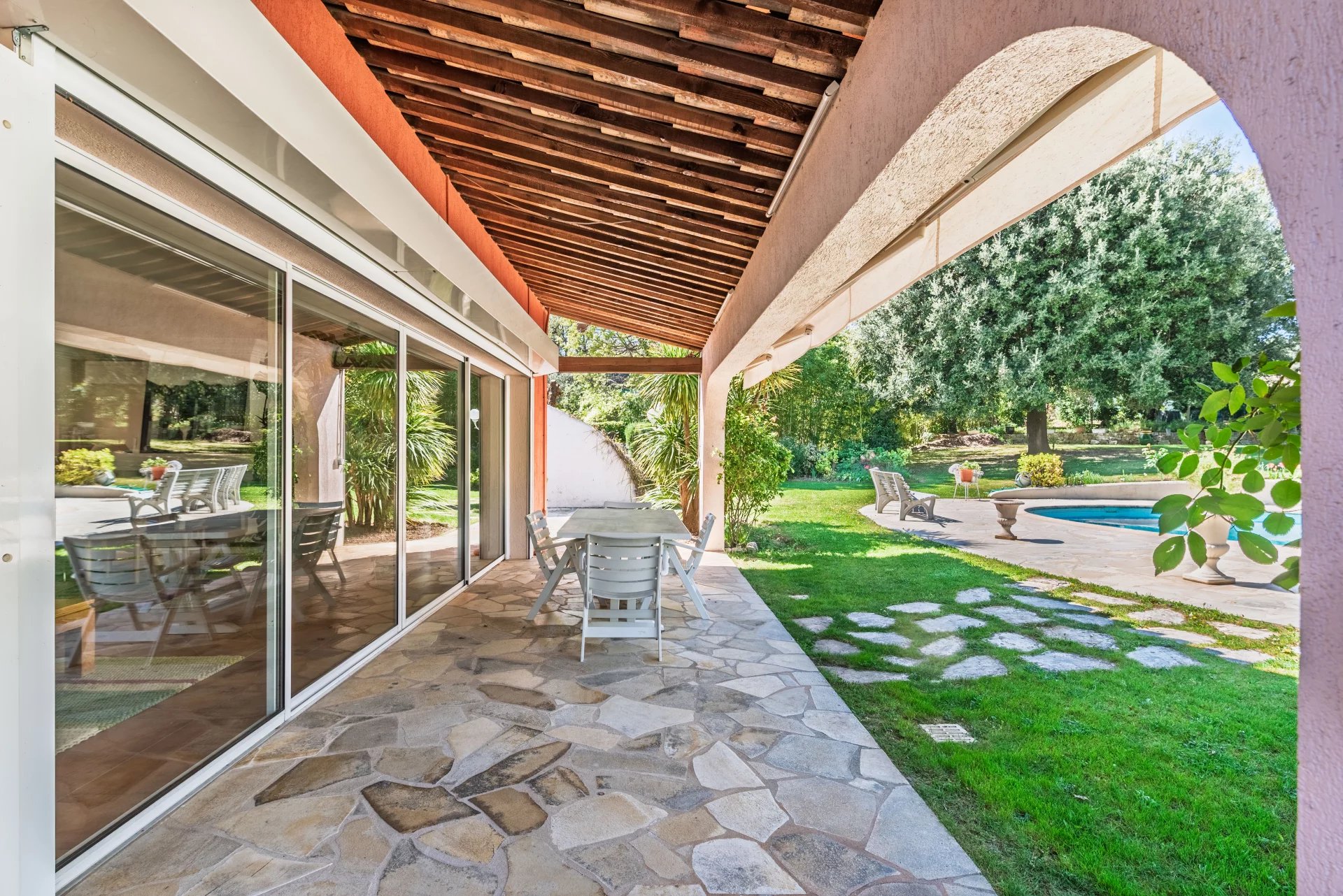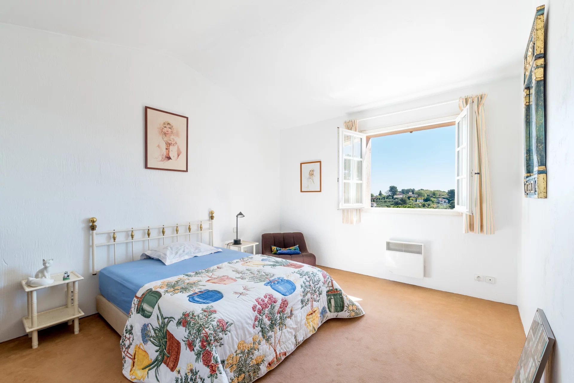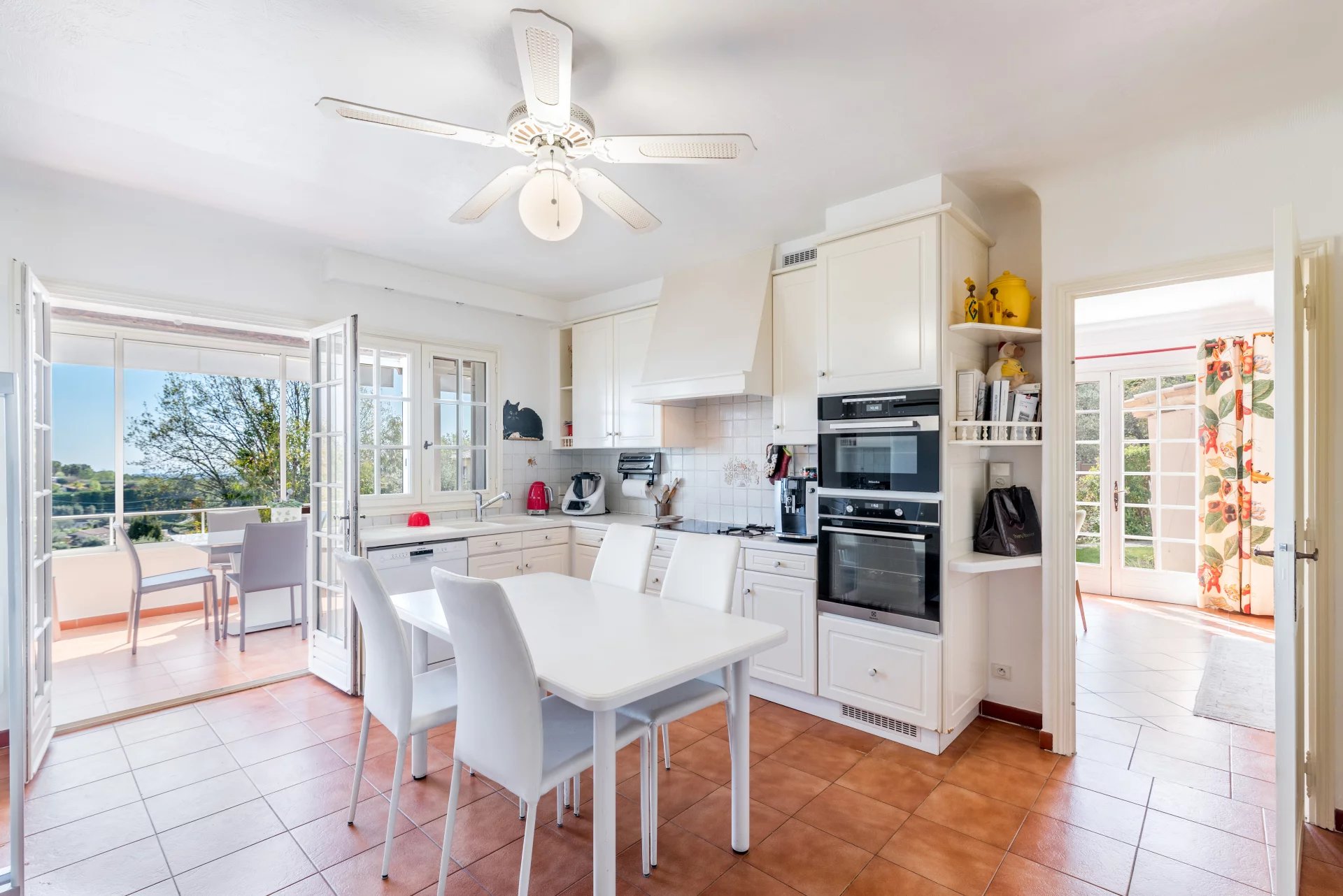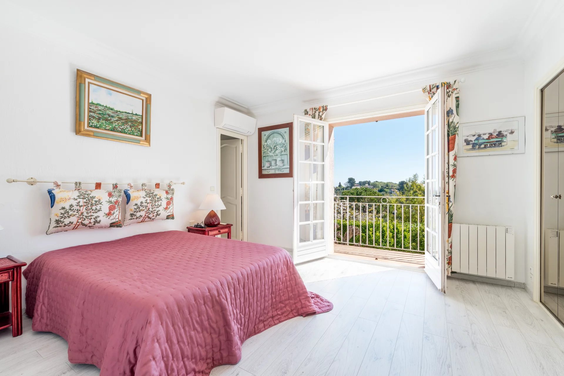 Located in Le Rouret, within a secure gated estate, this south-facing villa enjoys a peaceful setting, abundant natural light, and a pleasant sea view.