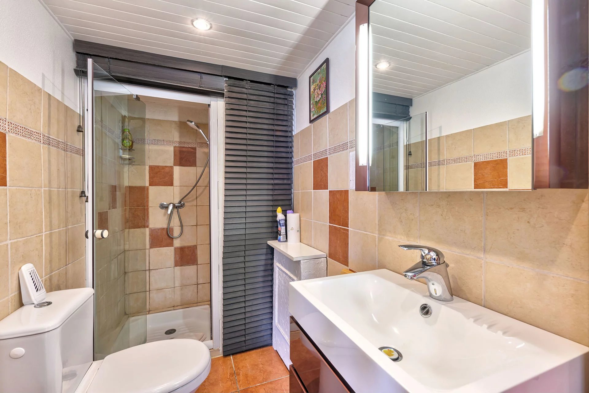 The house is laid out over two levels. On the garden level, you’ll find a spacious living and dining area, a large office space that can be converted into a bedroom with its own shower room and toilet, a bedroom with dressing room and en-suite bathroom with double sinks, a fully equipped kitchen, guest toilet, laundry room, pantry, and a cosy veranda designed as a reading nook.