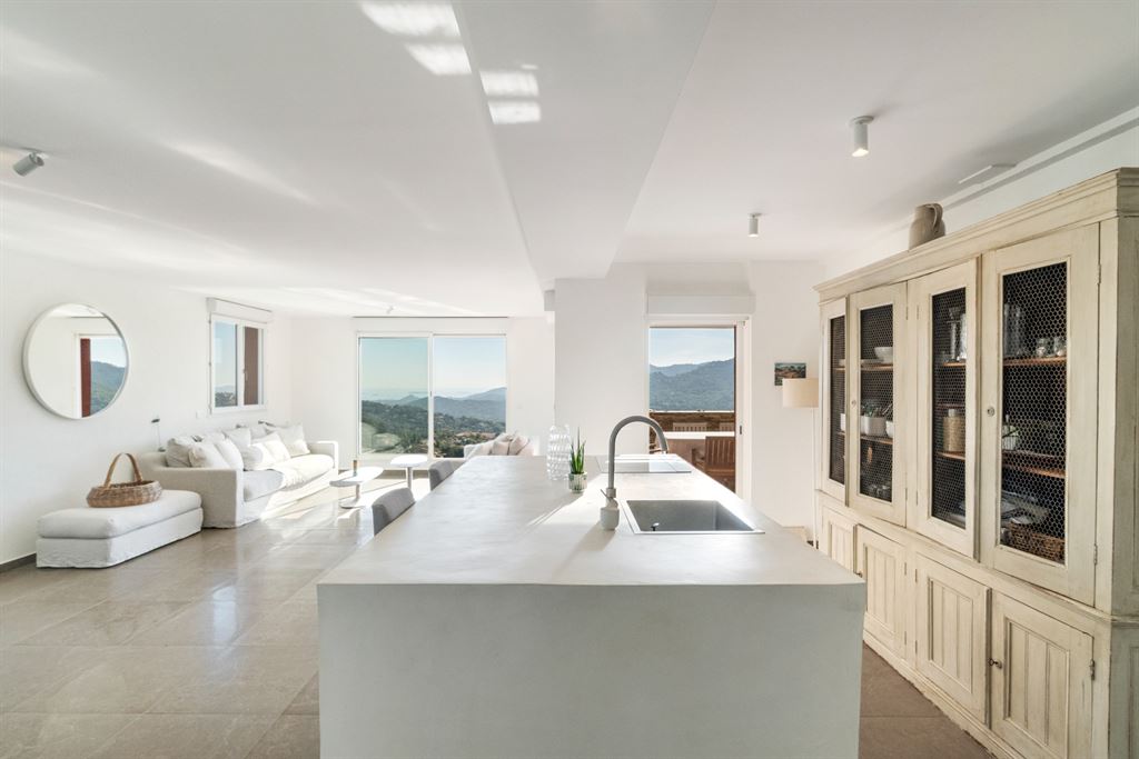 Spread over three levels, the villa has a private elevator connecting the double garage and laundry room. It comprises two spacious living rooms, a dining room, and a fully equipped open-plan kitchen opening onto a terrace with sea view. Two bedrooms with en-suite bathrooms and an office with sleeping area complete the interior.