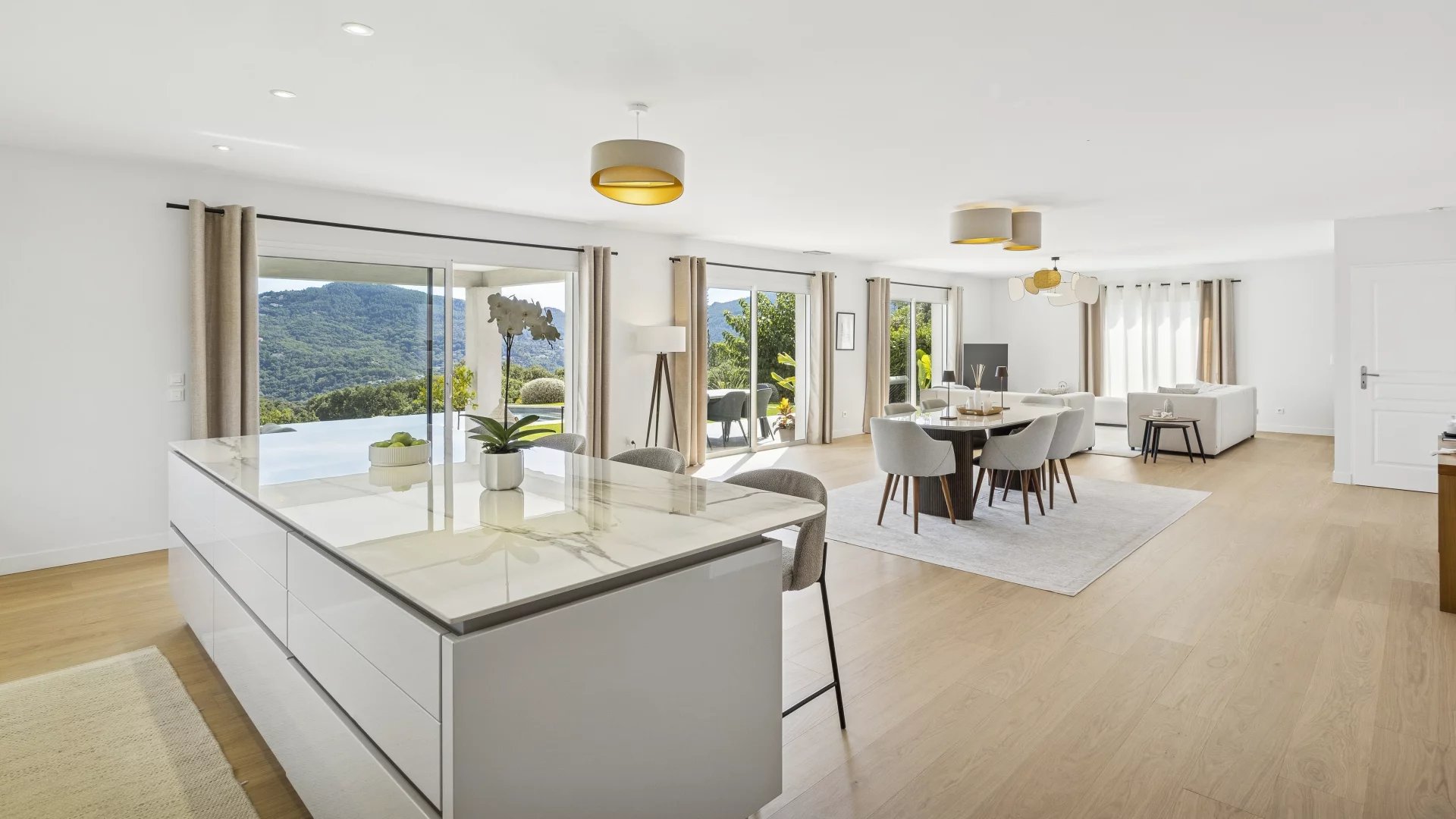 A vast, bright living space of over 90 m2, facing south, welcomes you with a living/dining room opening onto the outside and an elegantly fitted and equipped open-plan kitchen. This space leads directly to a shaded terrace and a sumptuous infinity pool offering unobstructed views of the surrounding nature.