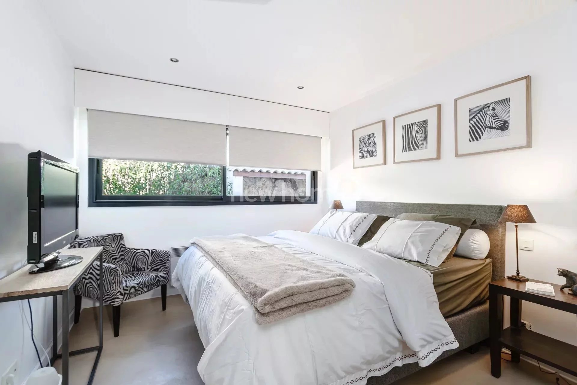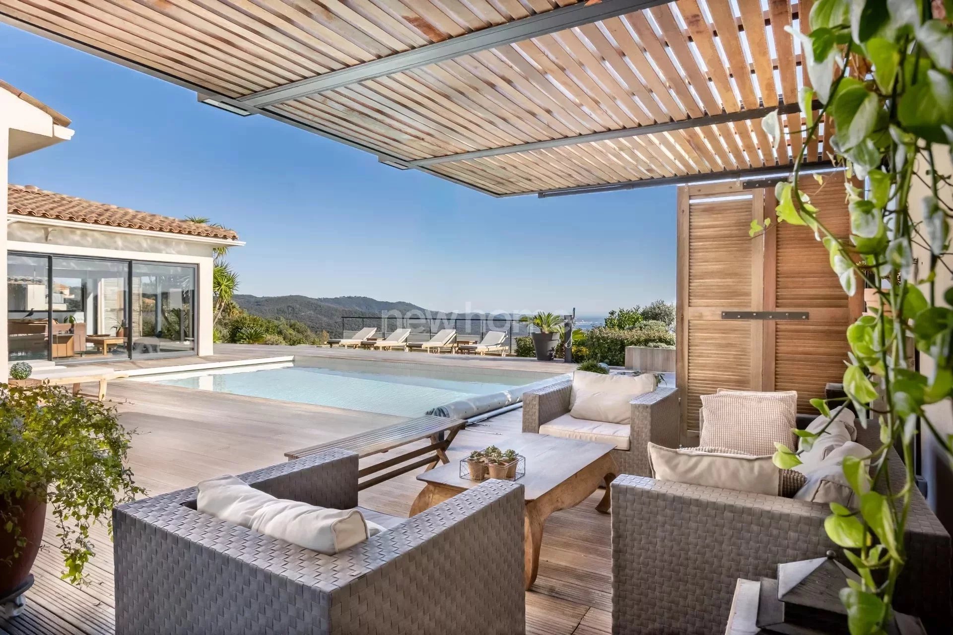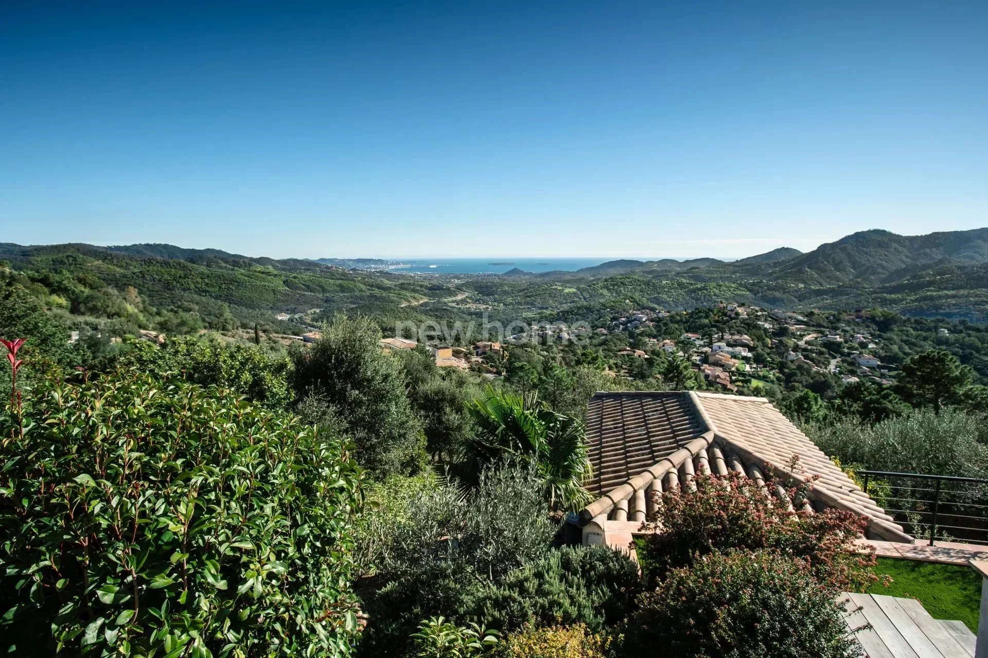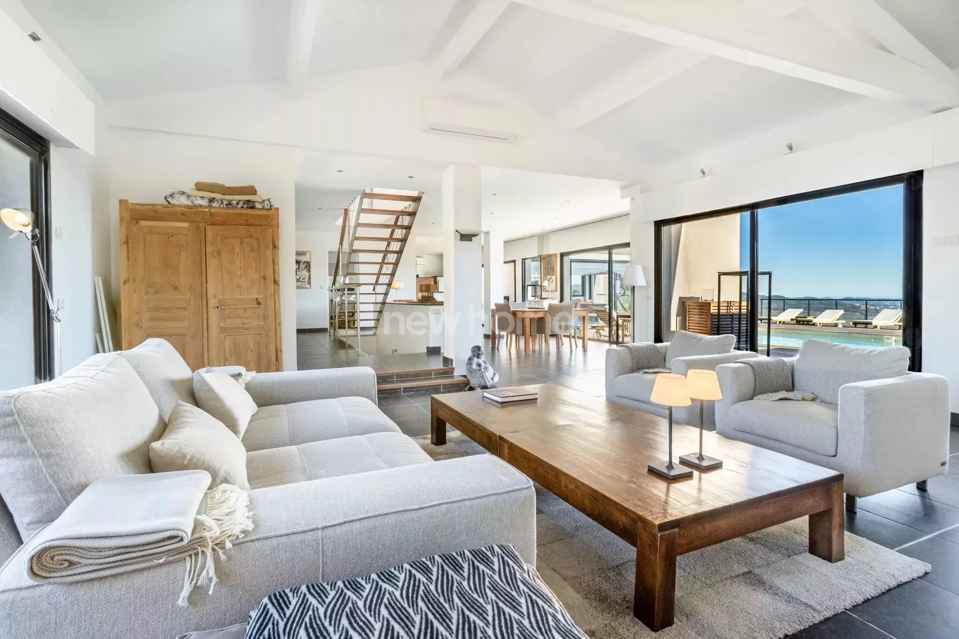 In the heart of a protected massif, in a residential estate with tennis courts, this luxurious architect-designed villa of 383m2 offers you a breathtaking view of the bay of Cannes and the Lerins islands.