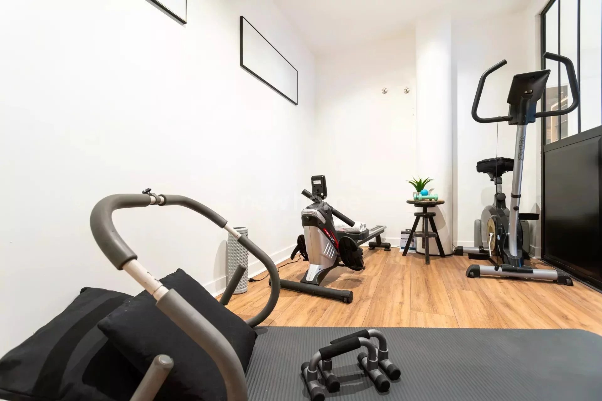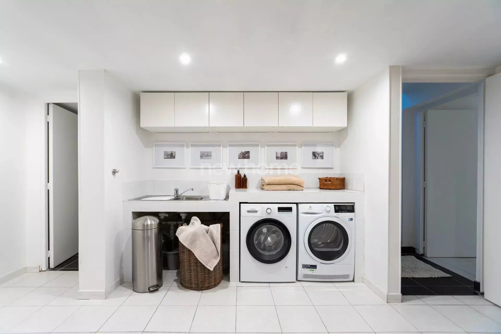 Via the stairs you will go down to a huge flexible room. The space is made up of an office/workshop area, a gym, a laundry room, the wine cellar, several cellars and a bright studio.