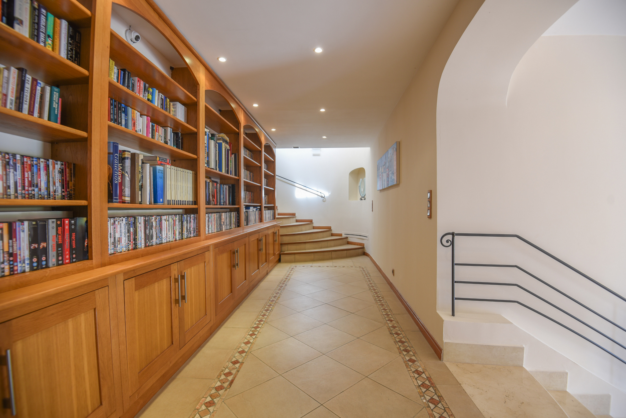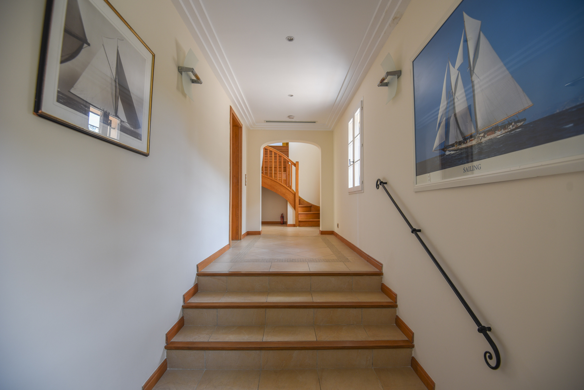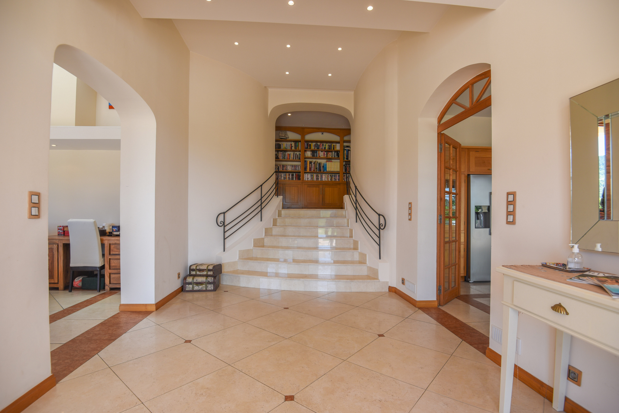 We enter the villa through a magnificent entrance hall which leads to a charming kitchen and rear kitchen, a spacious dining room and a living room which offer superb open views. and a living room which offer a superb open view. A few steps, and we access a charming library and a laundry room.